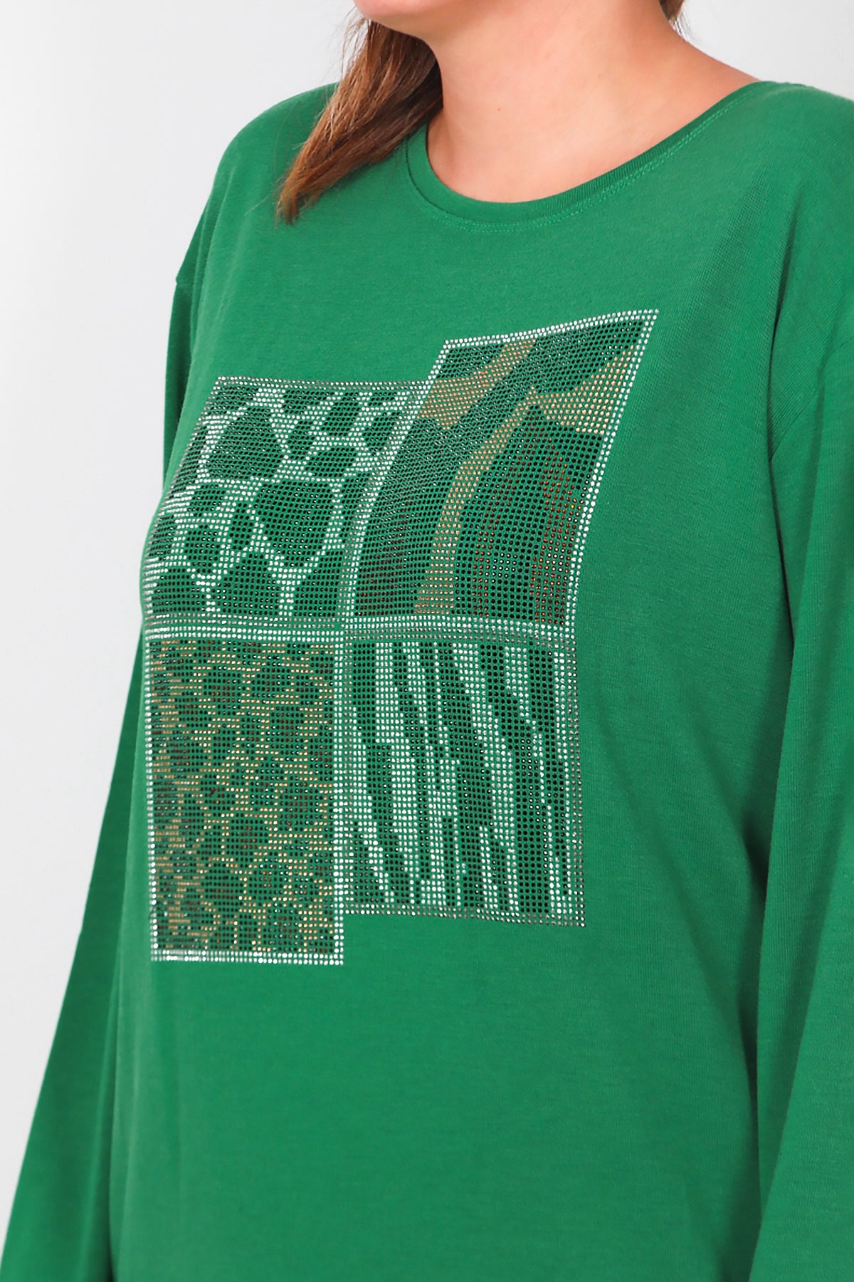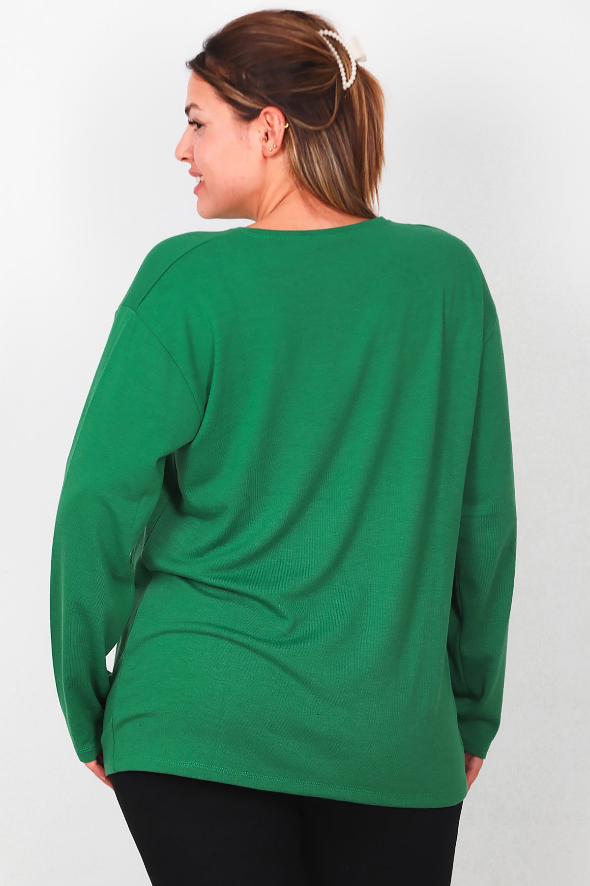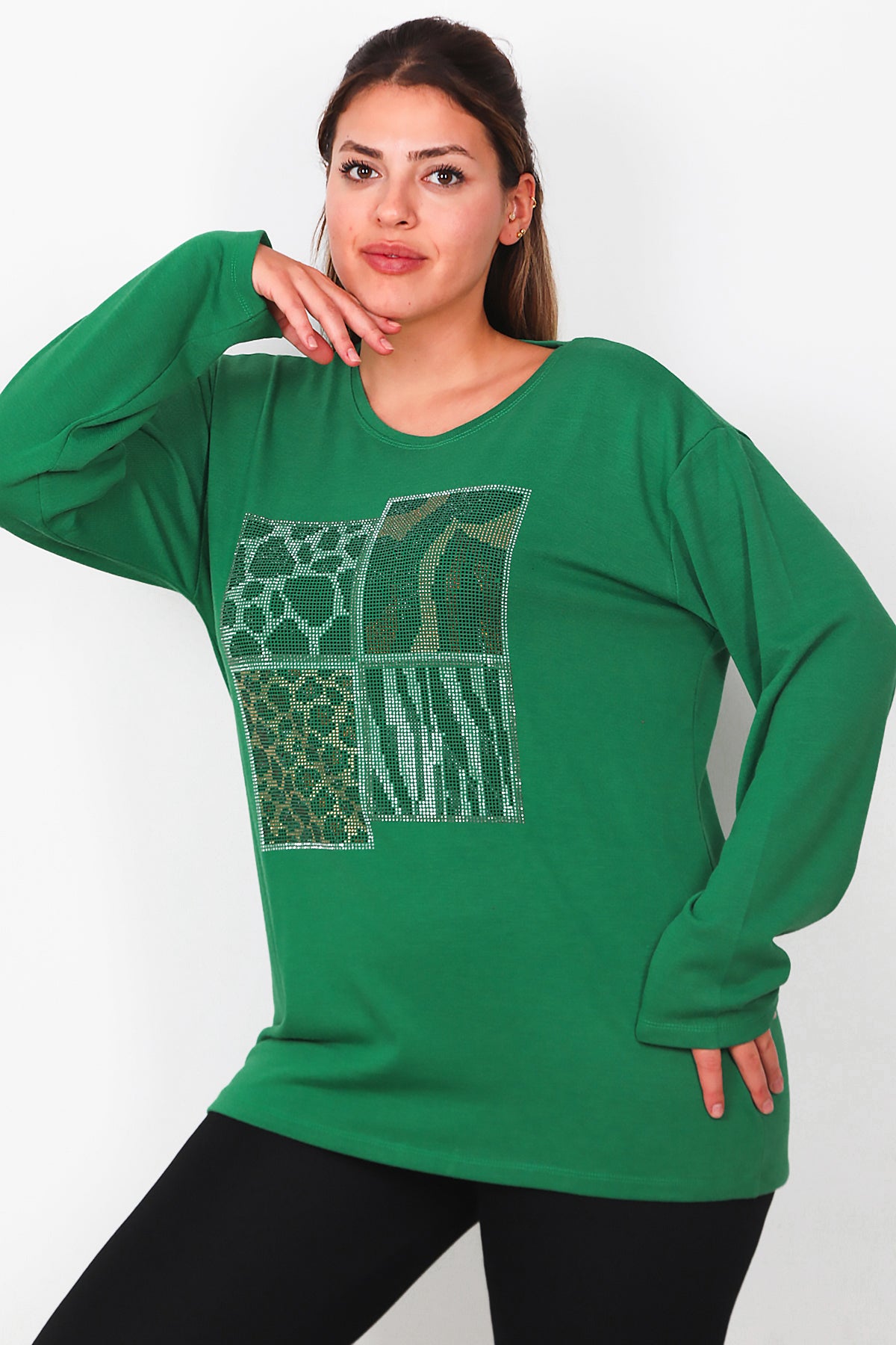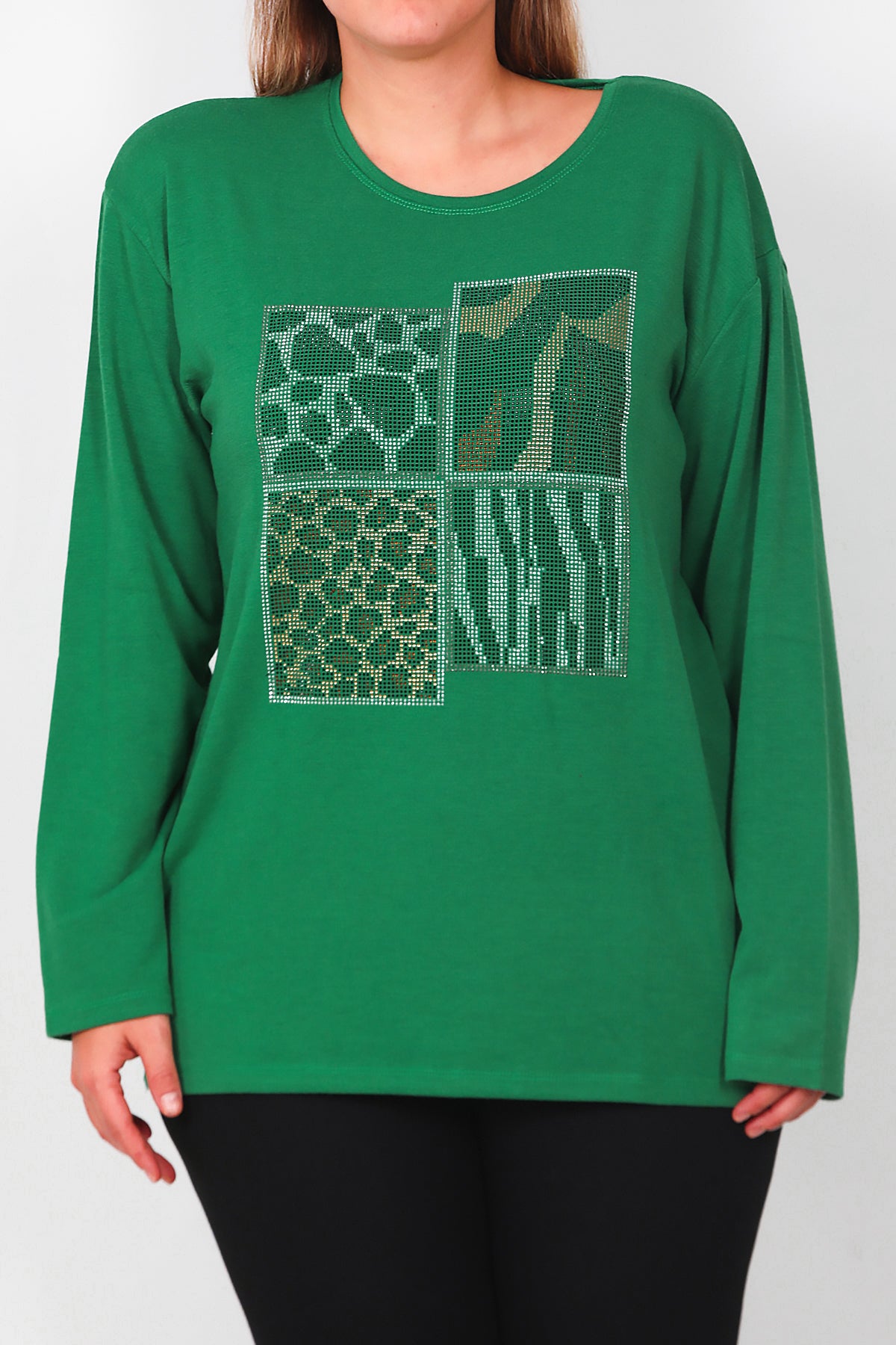 Büyük Beden Leopar Taşlı Uzun Kol Bluz Yeşil