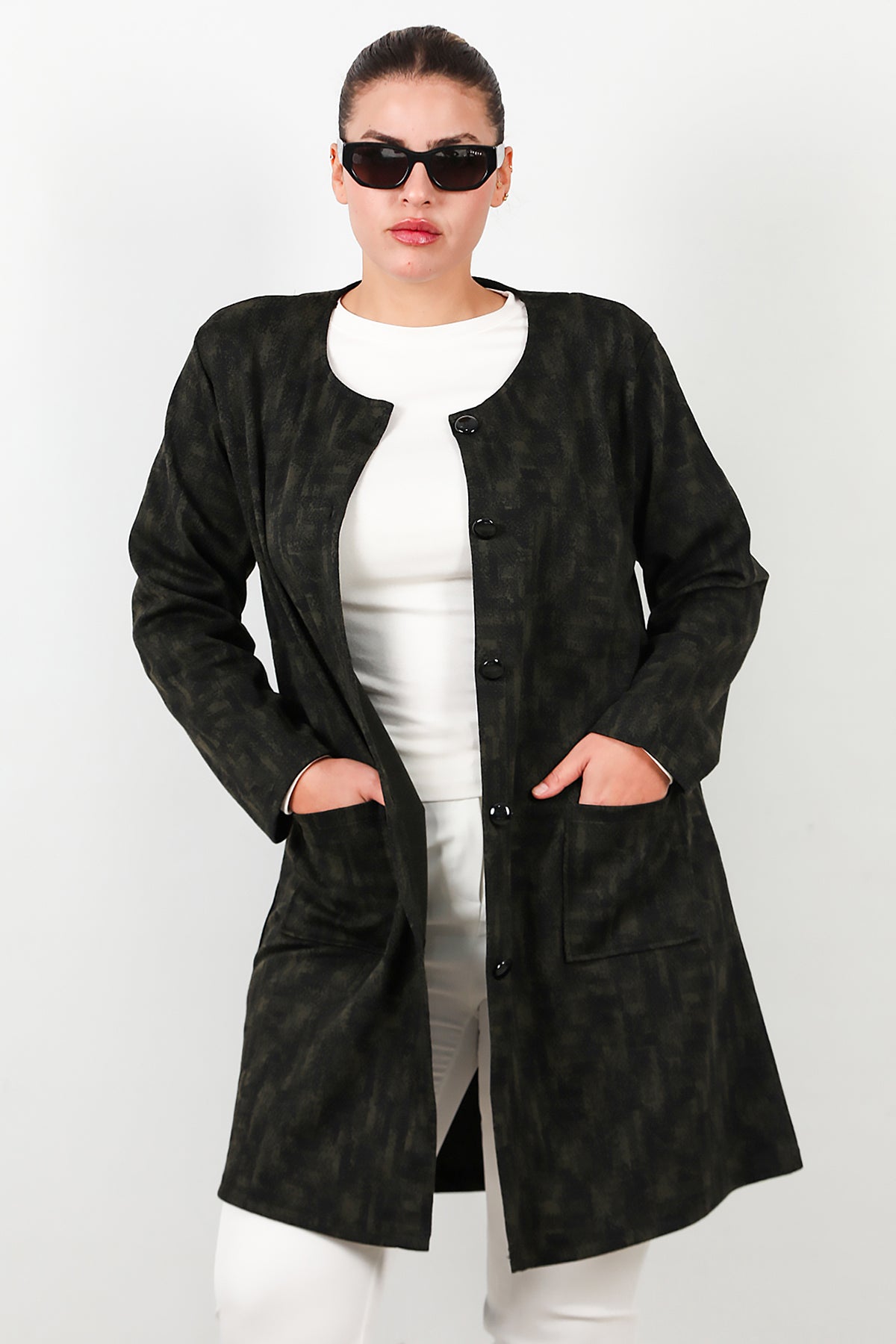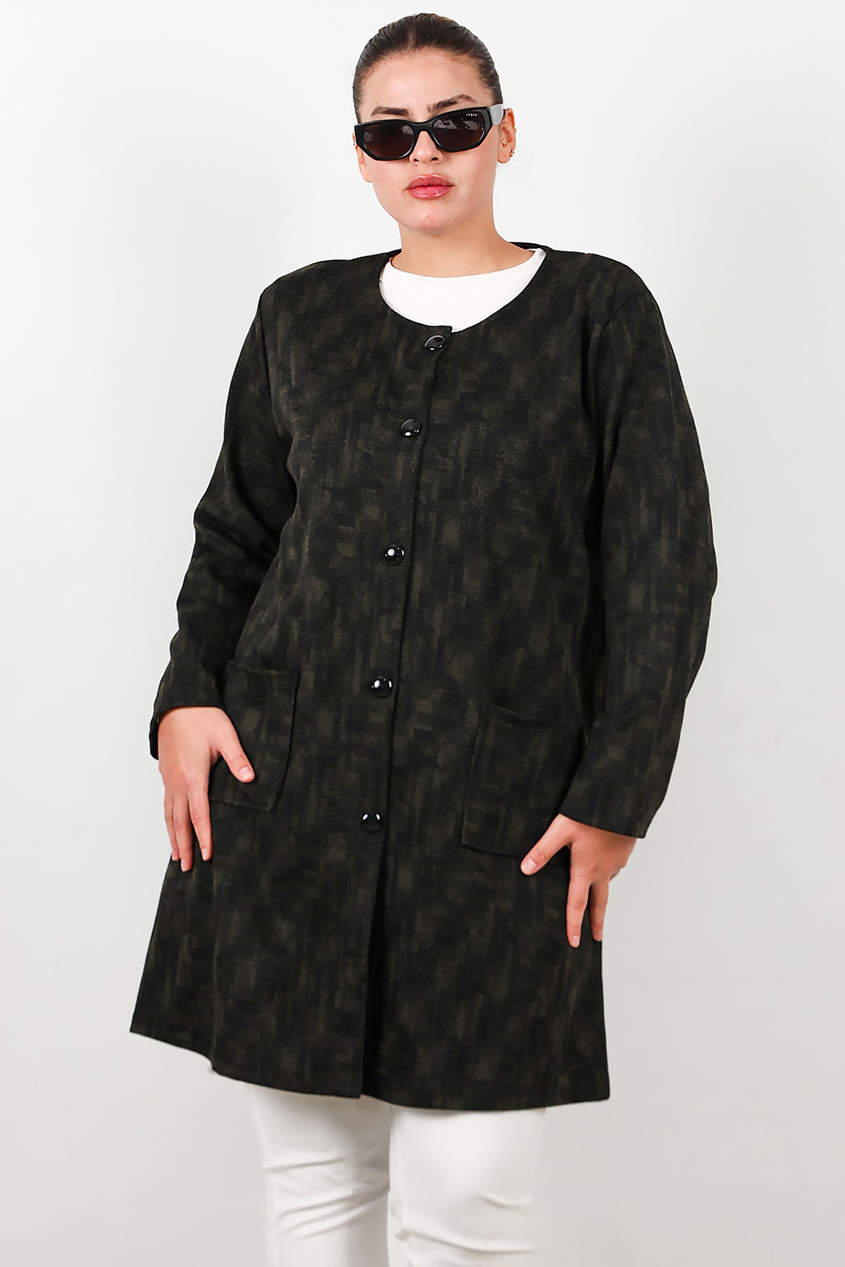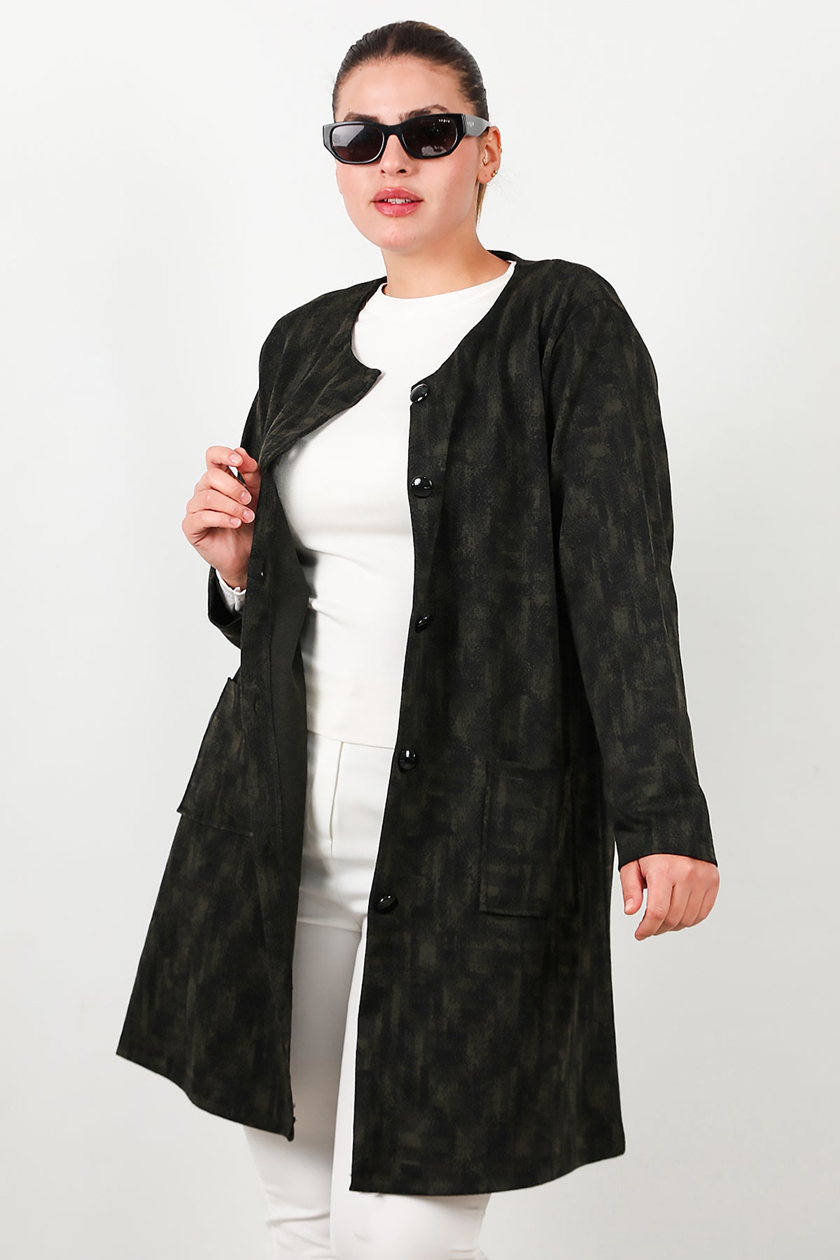 Büyük Beden Likralı Önü Düğmeli Cepli Ceket Haki