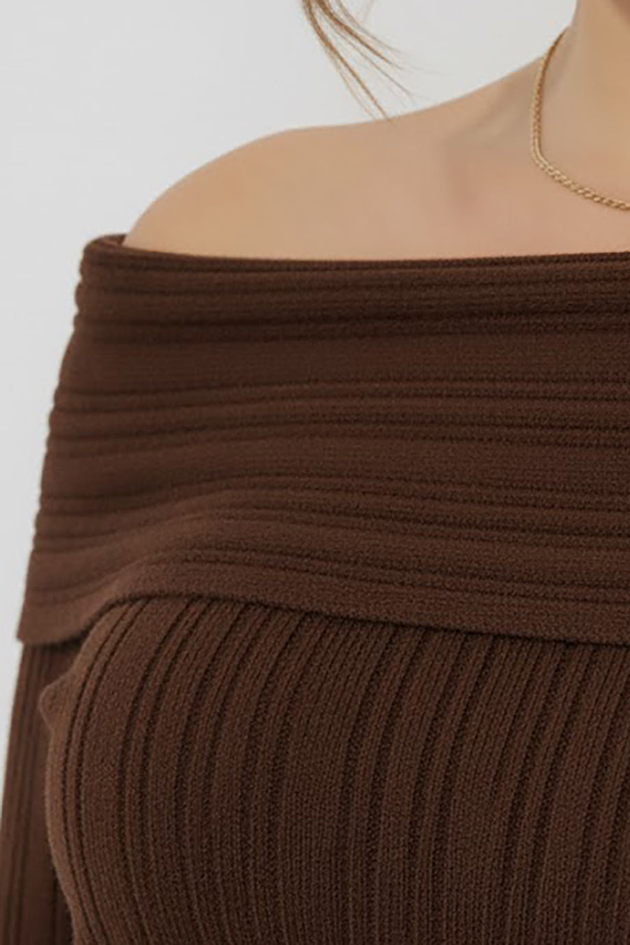 Büyük Beden Madonna Yaka Triko Bluz Kahverengi
