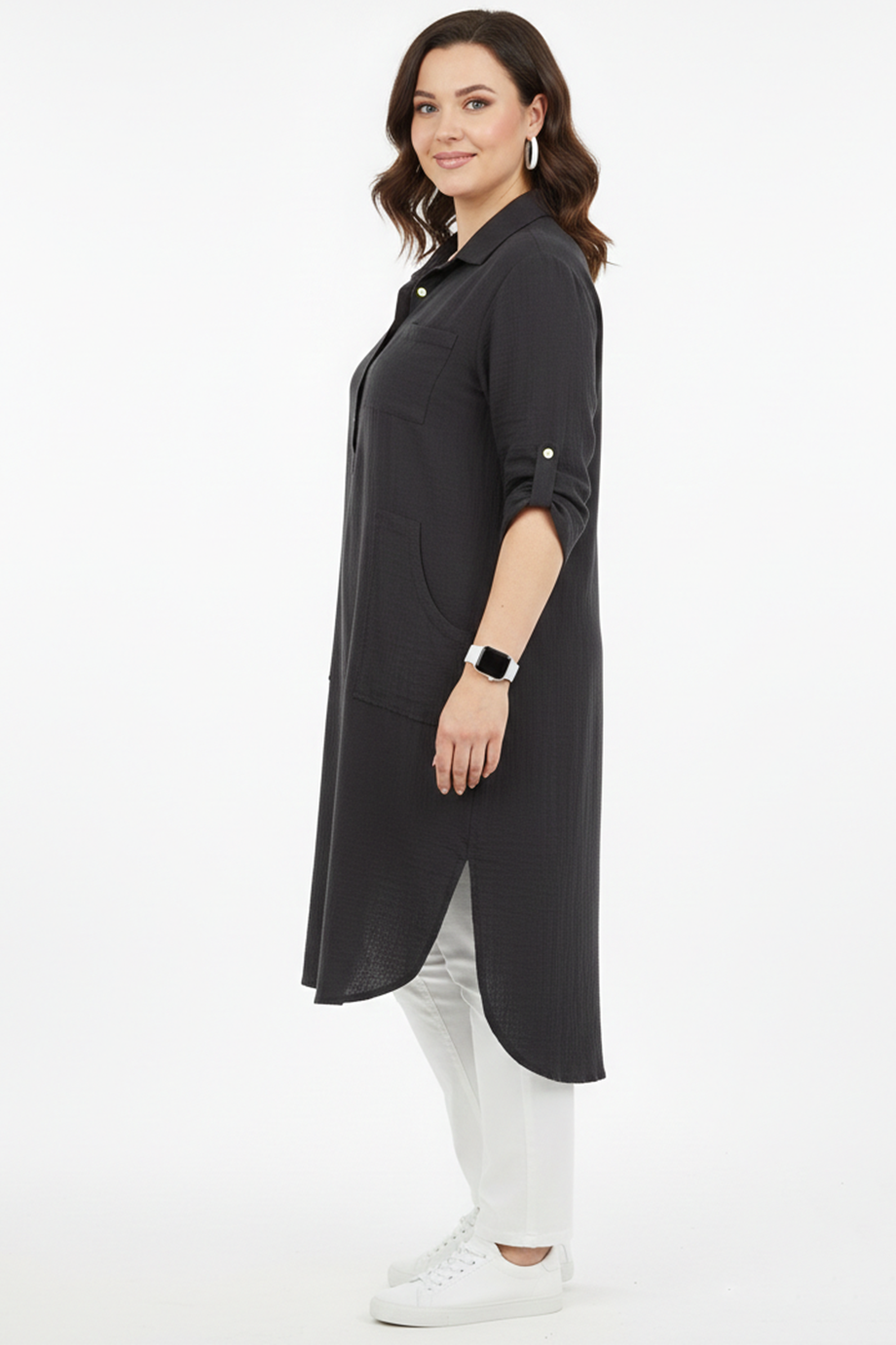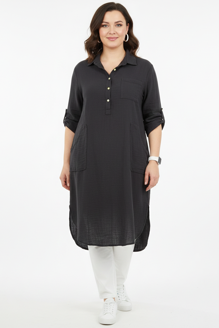 Musalux büyük beden müslin tunik elbise, rahatlığı ve sade şıklığı bir arada arayanlar için ideal bir tercihtir.