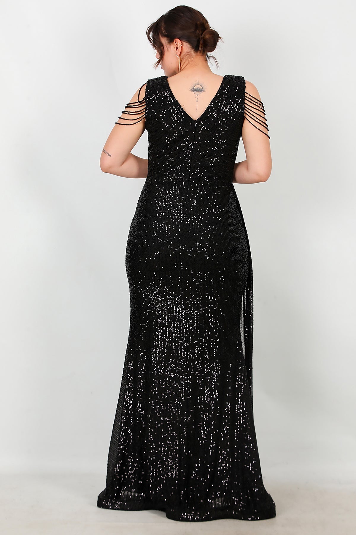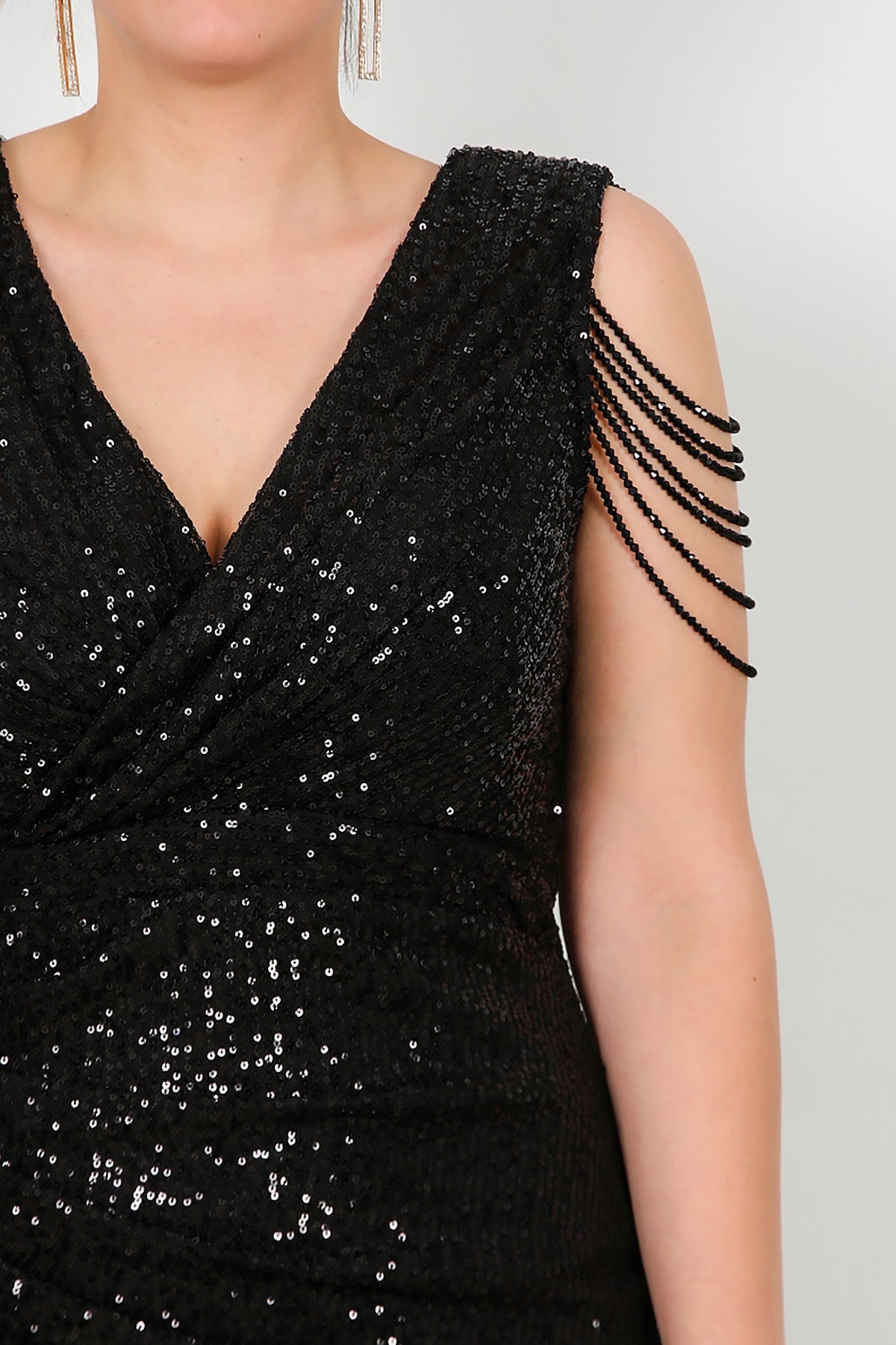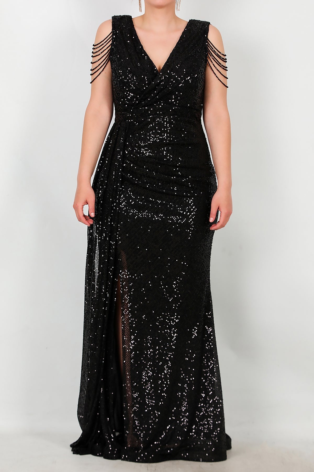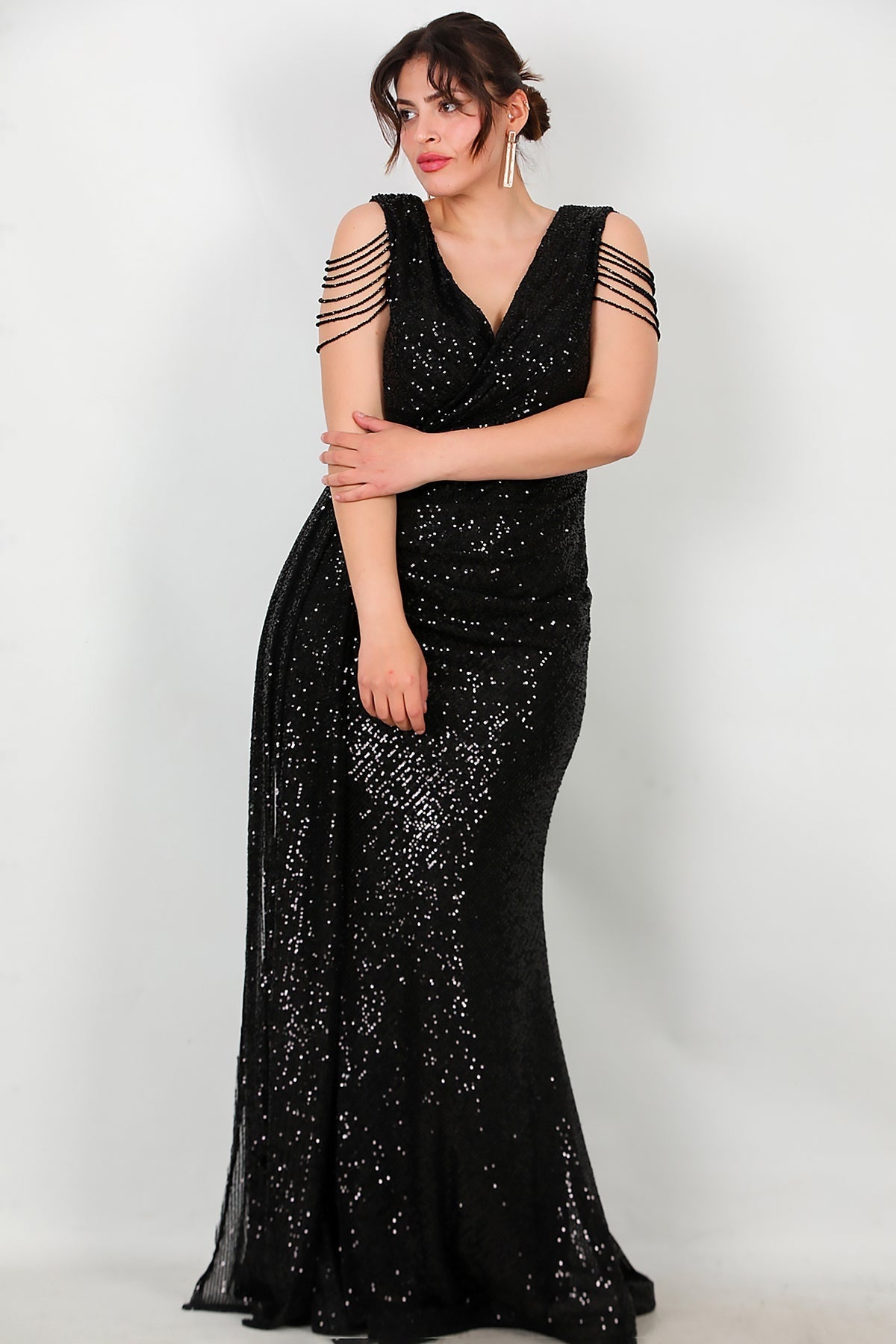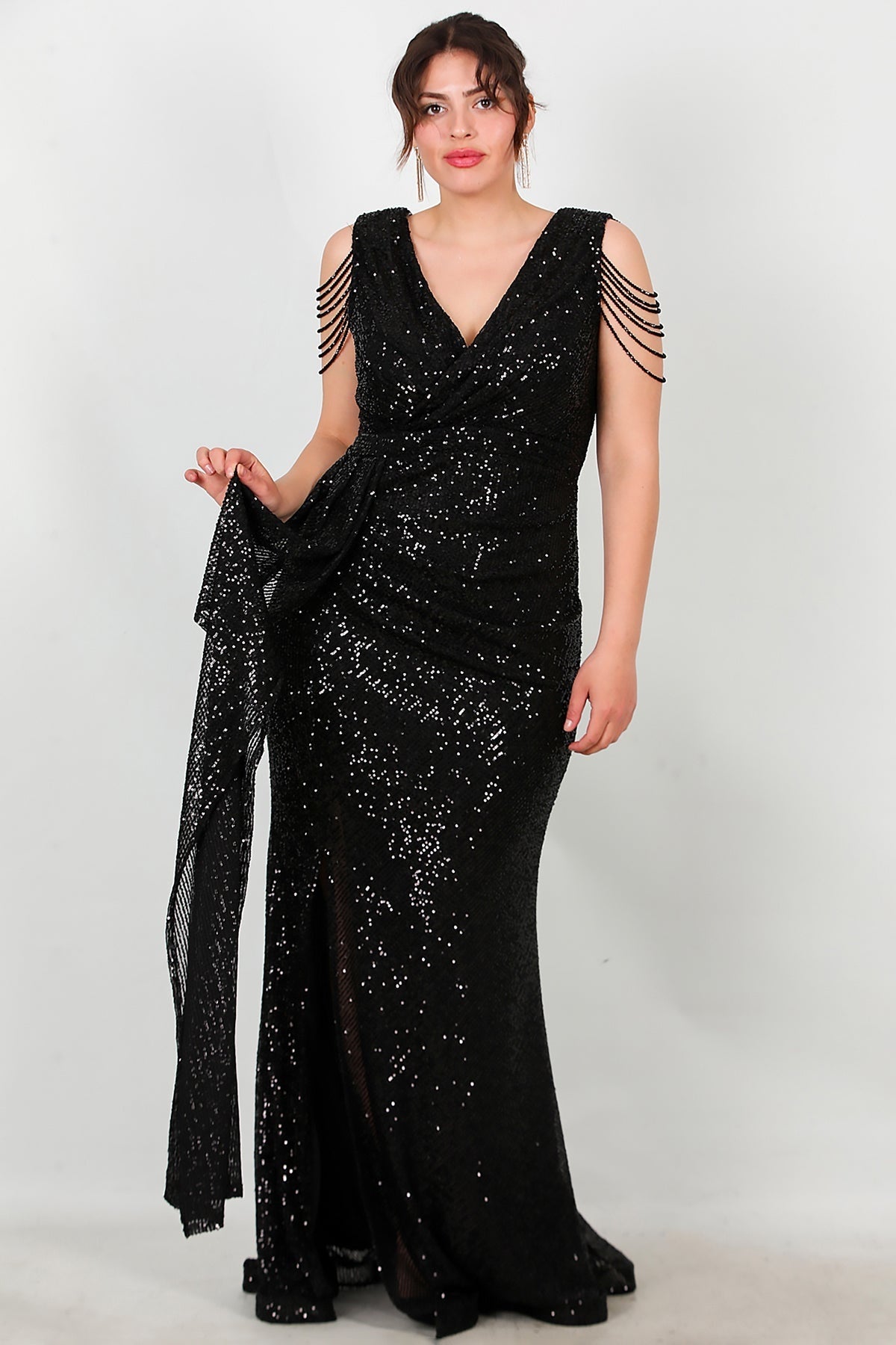 Büyük Beden Omuz Zincir Detay Uzun Pullu Abiye Siyah