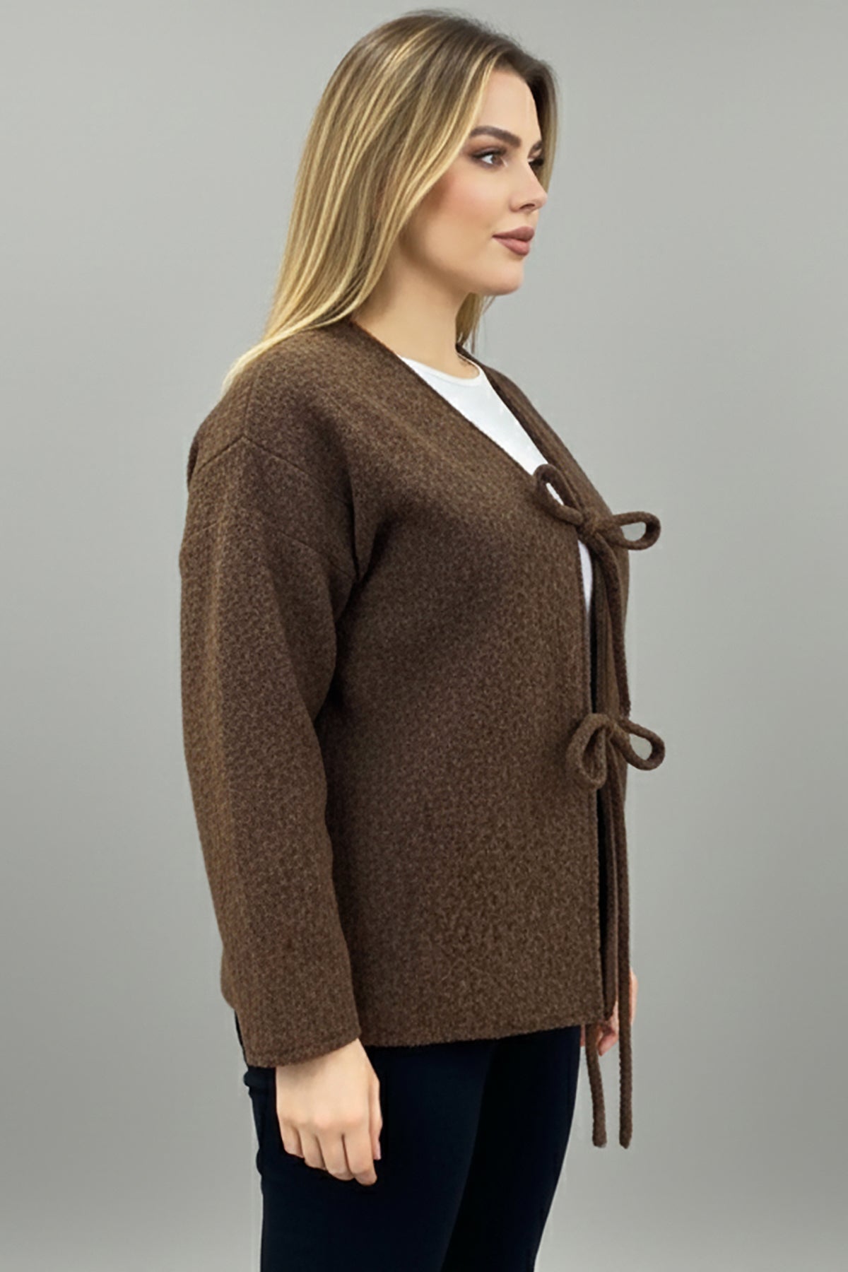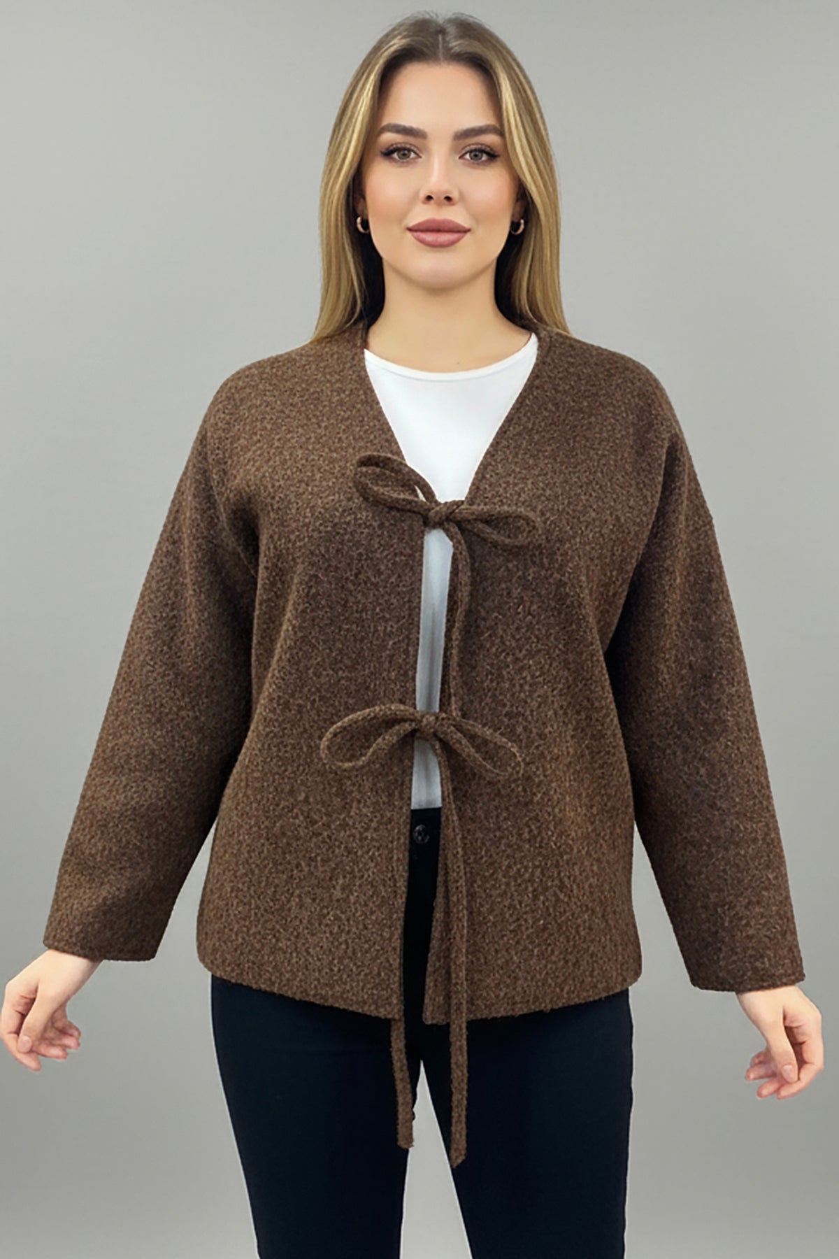 Büyük Beden Ön Bağlama Sakallı Kaşe Hırka Kahverengi