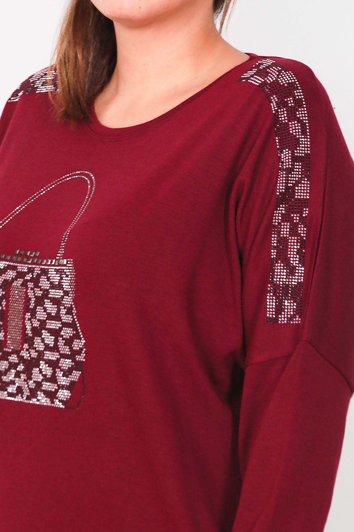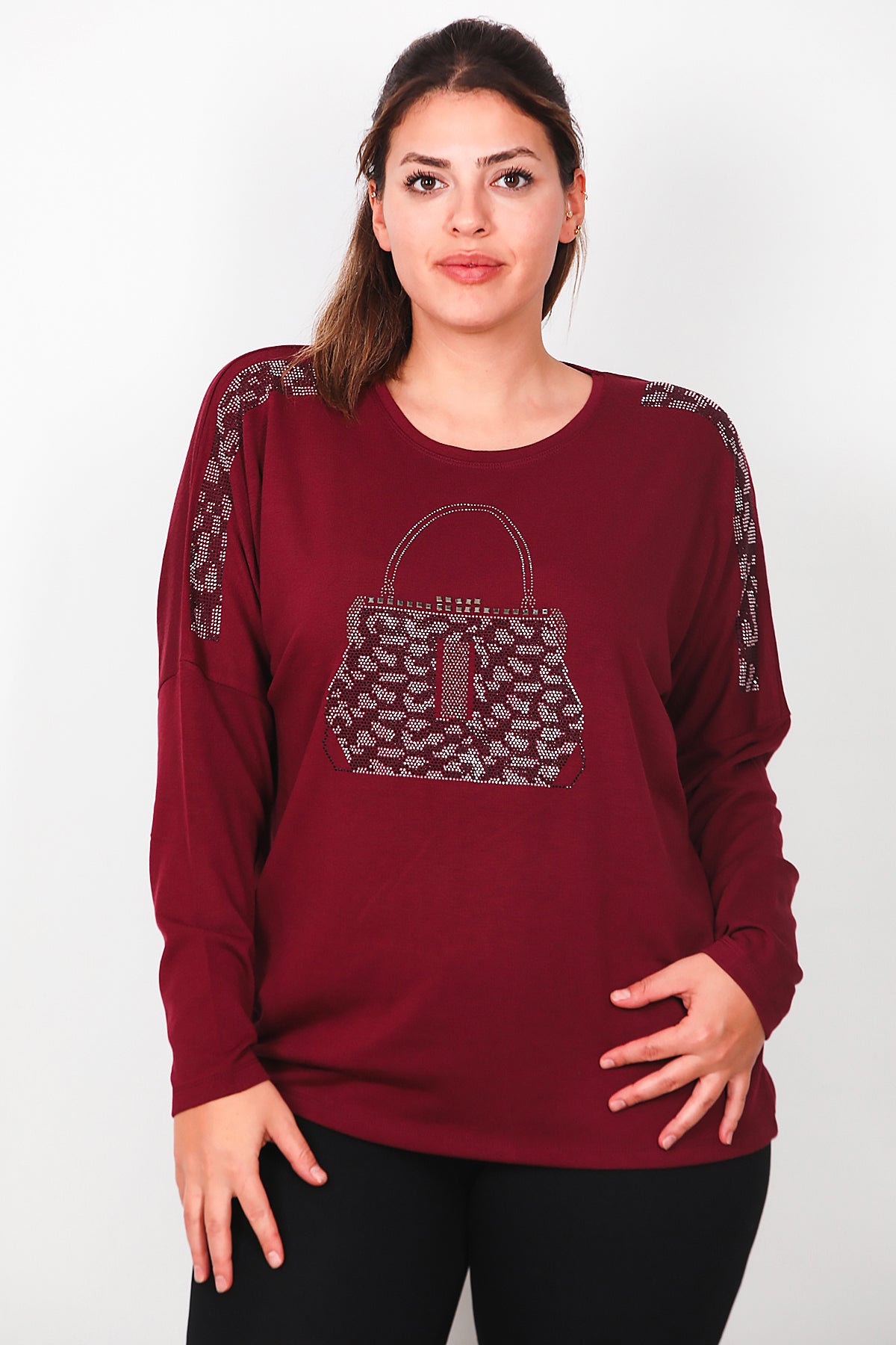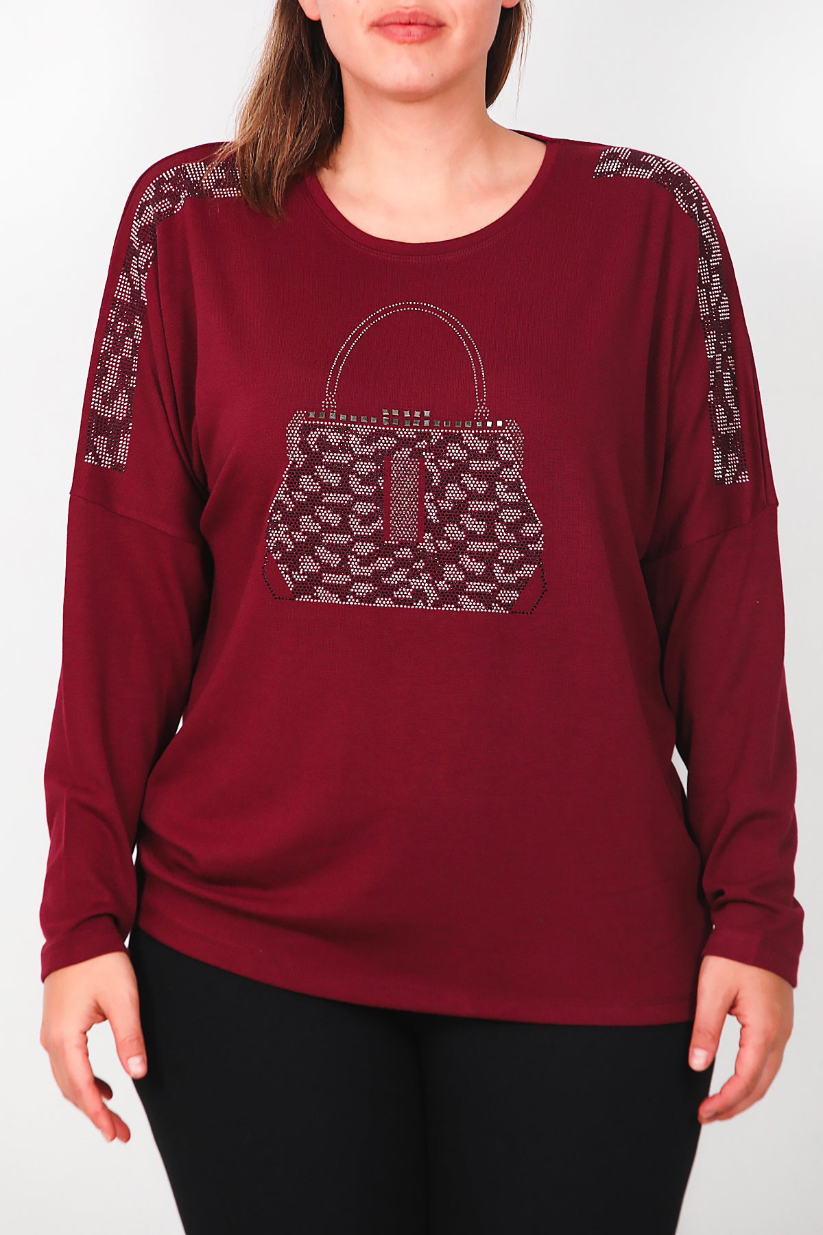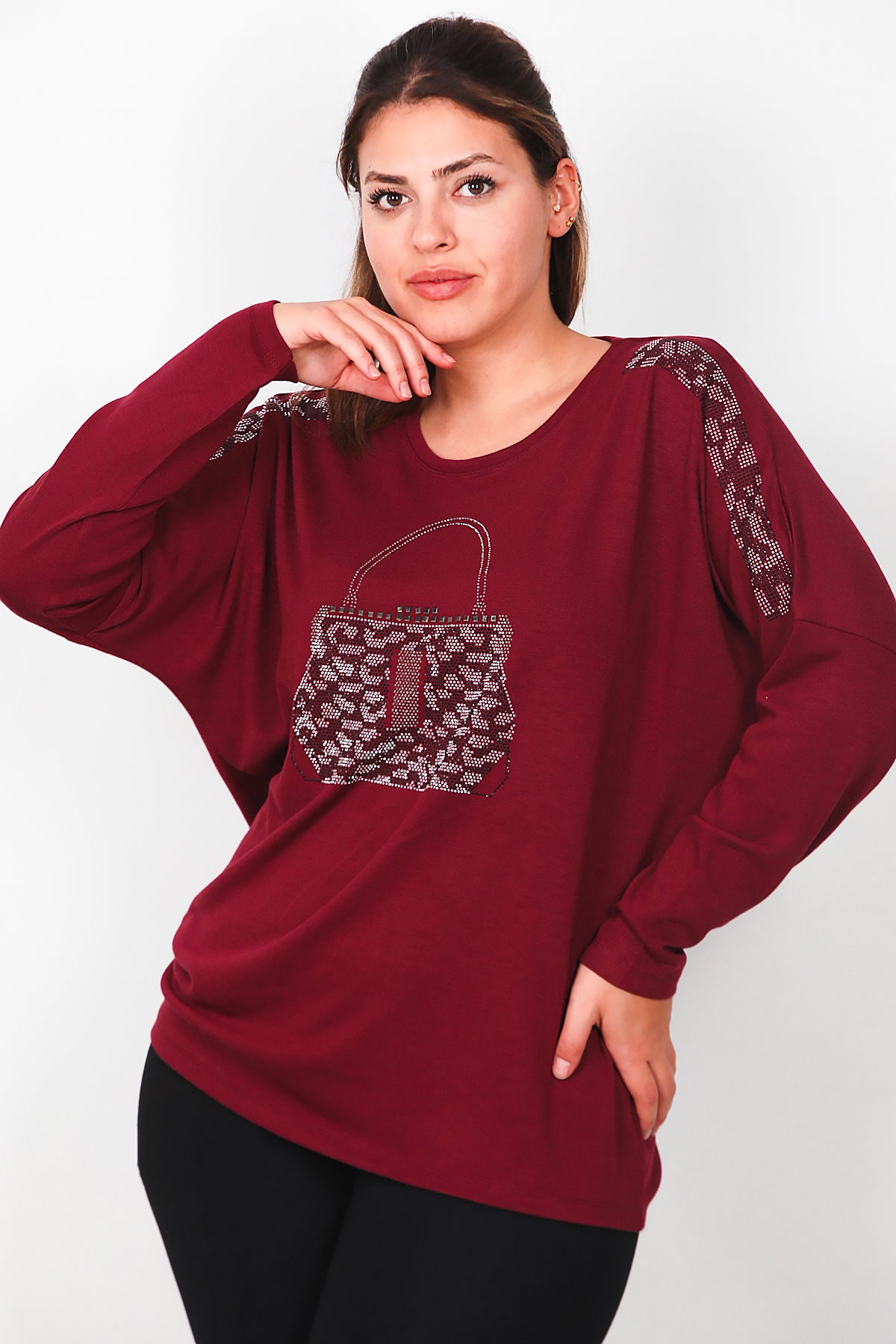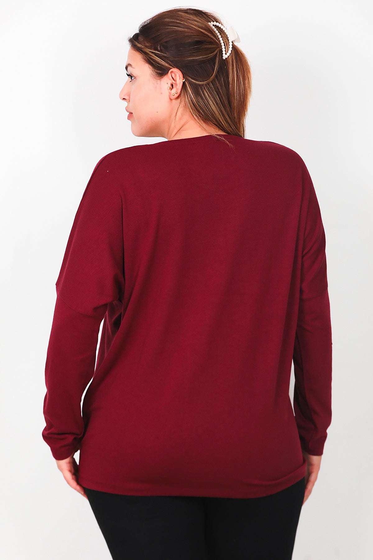 Büyük Beden Ön Çanta Baskılı Uzun Kol Bluz Bordo