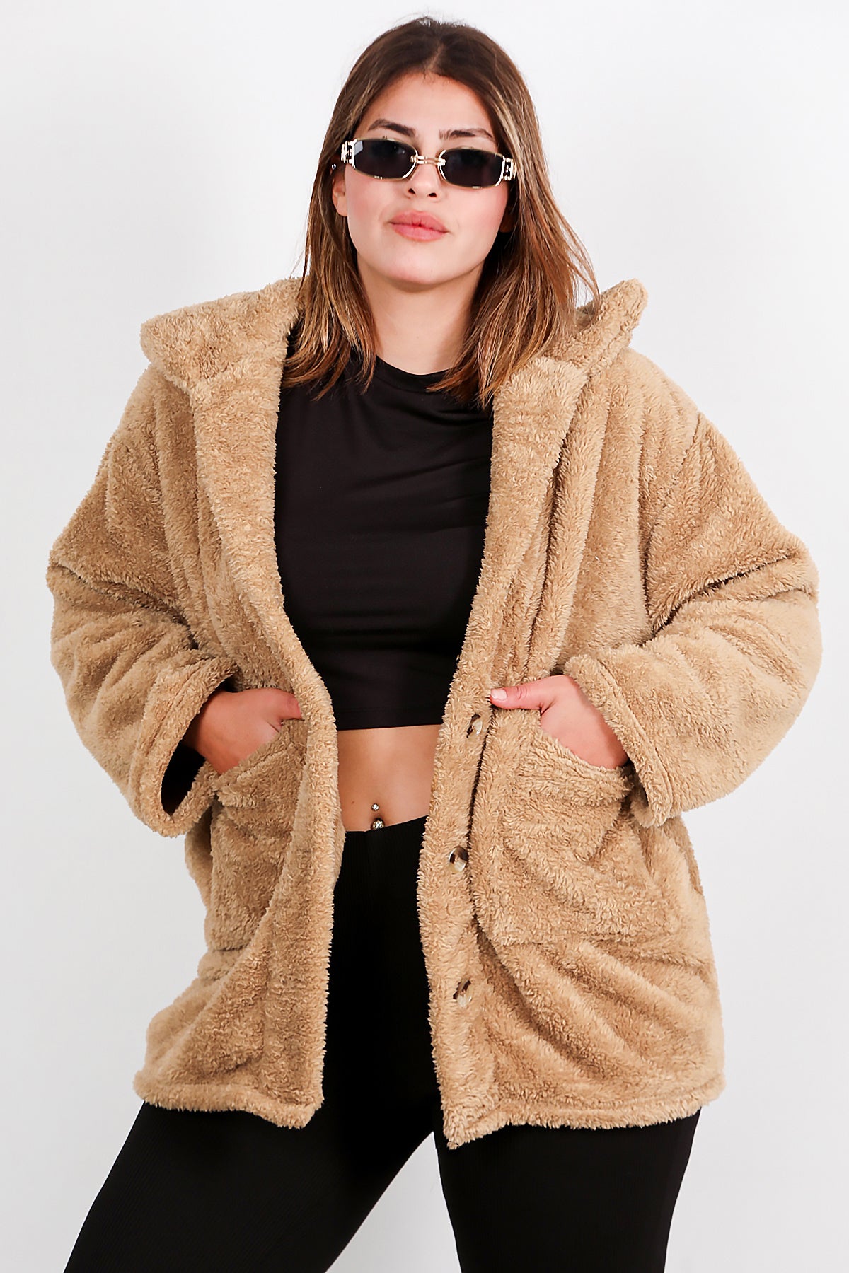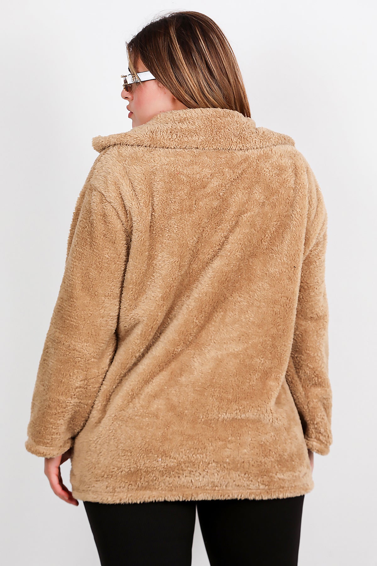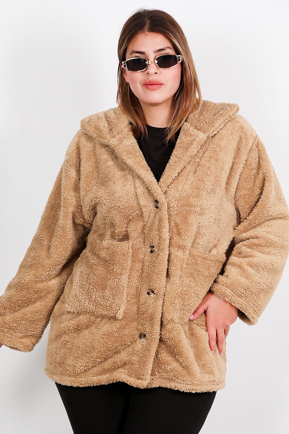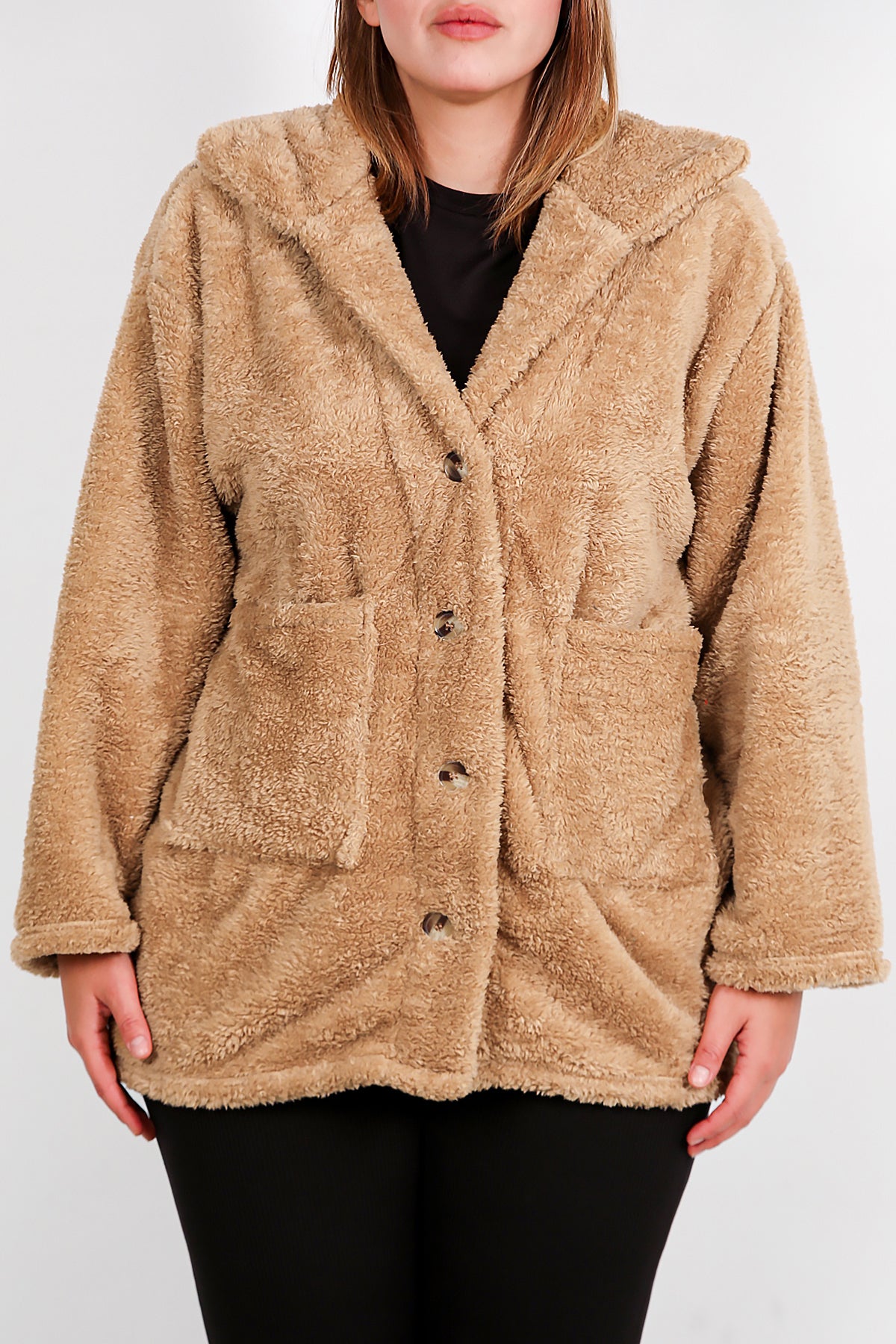 Büyük Beden Önü Düğmeli Peluş Ceket Bej