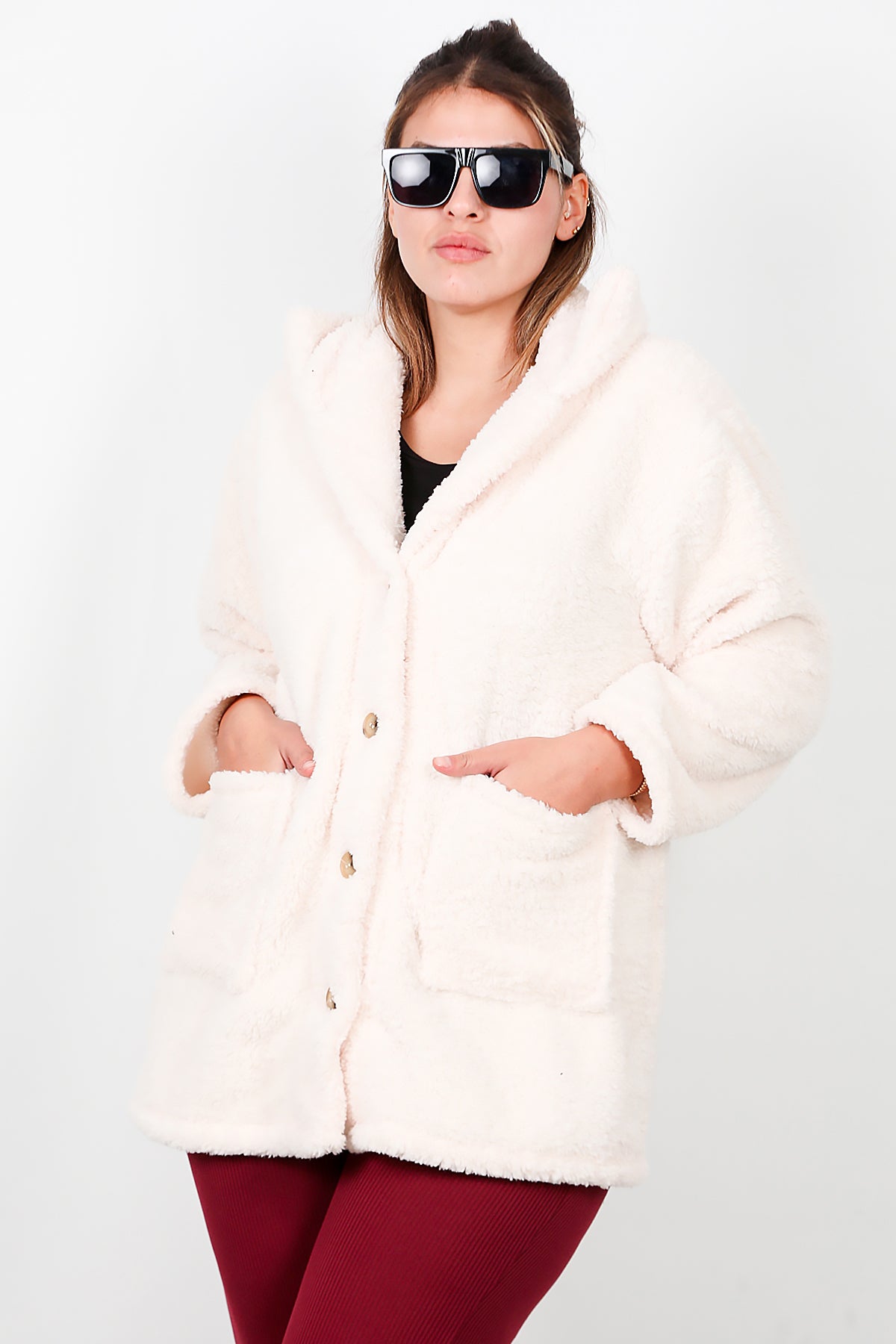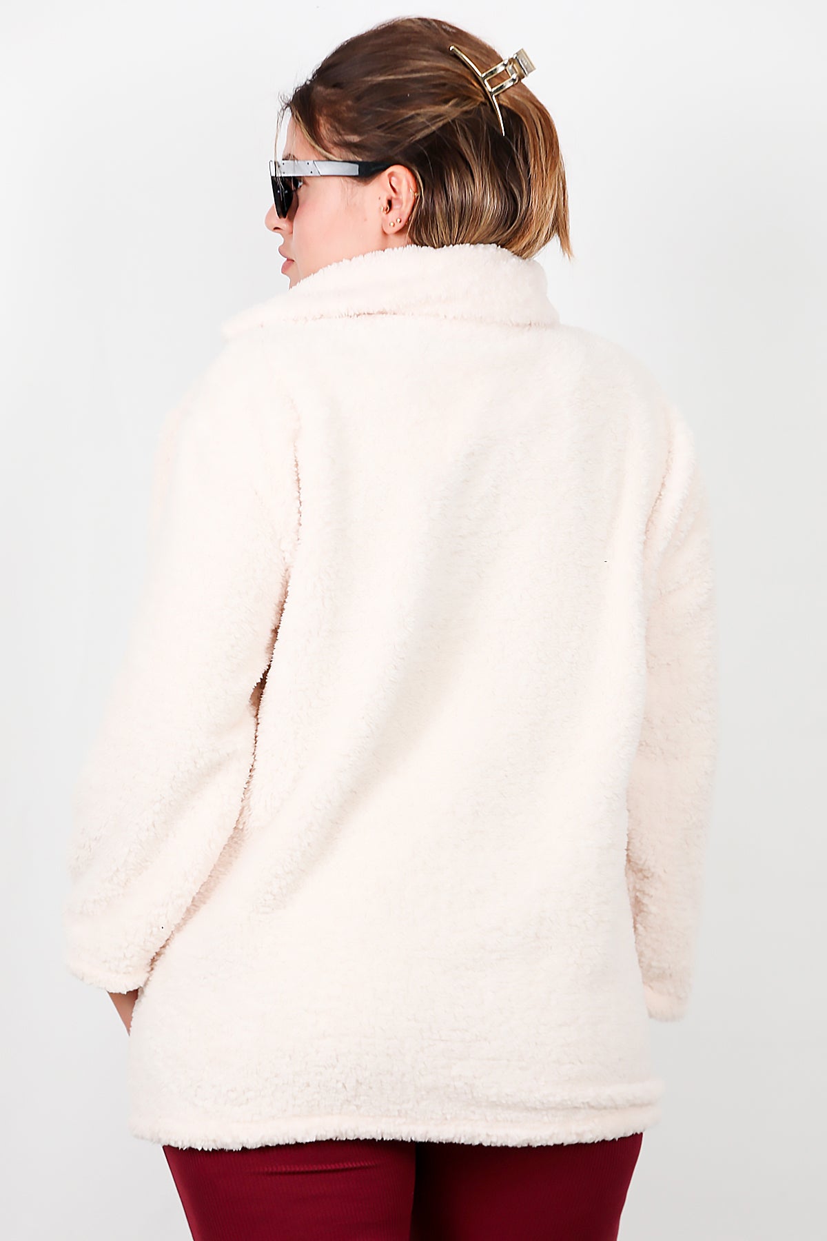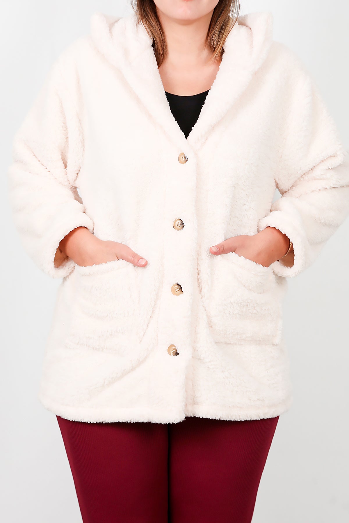 Büyük Beden Önü Düğmeli Peluş Ceket Krem