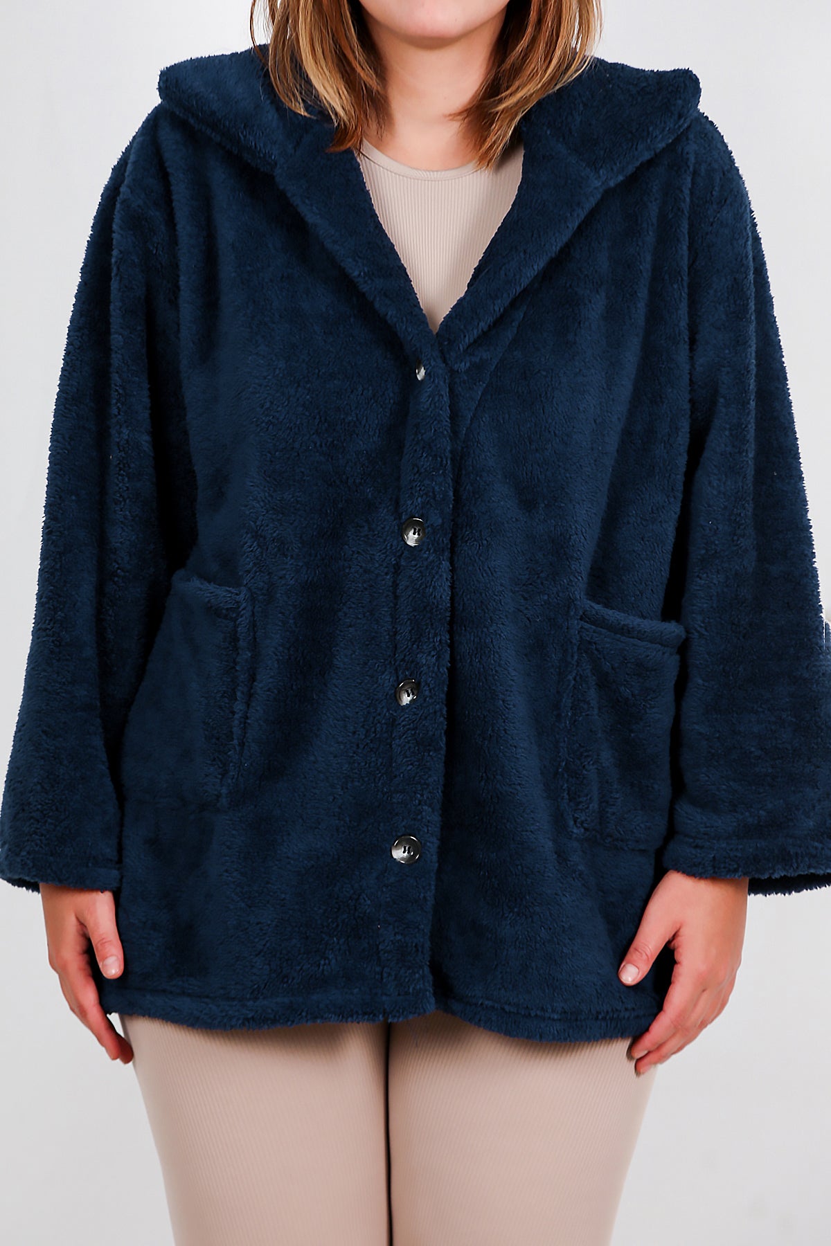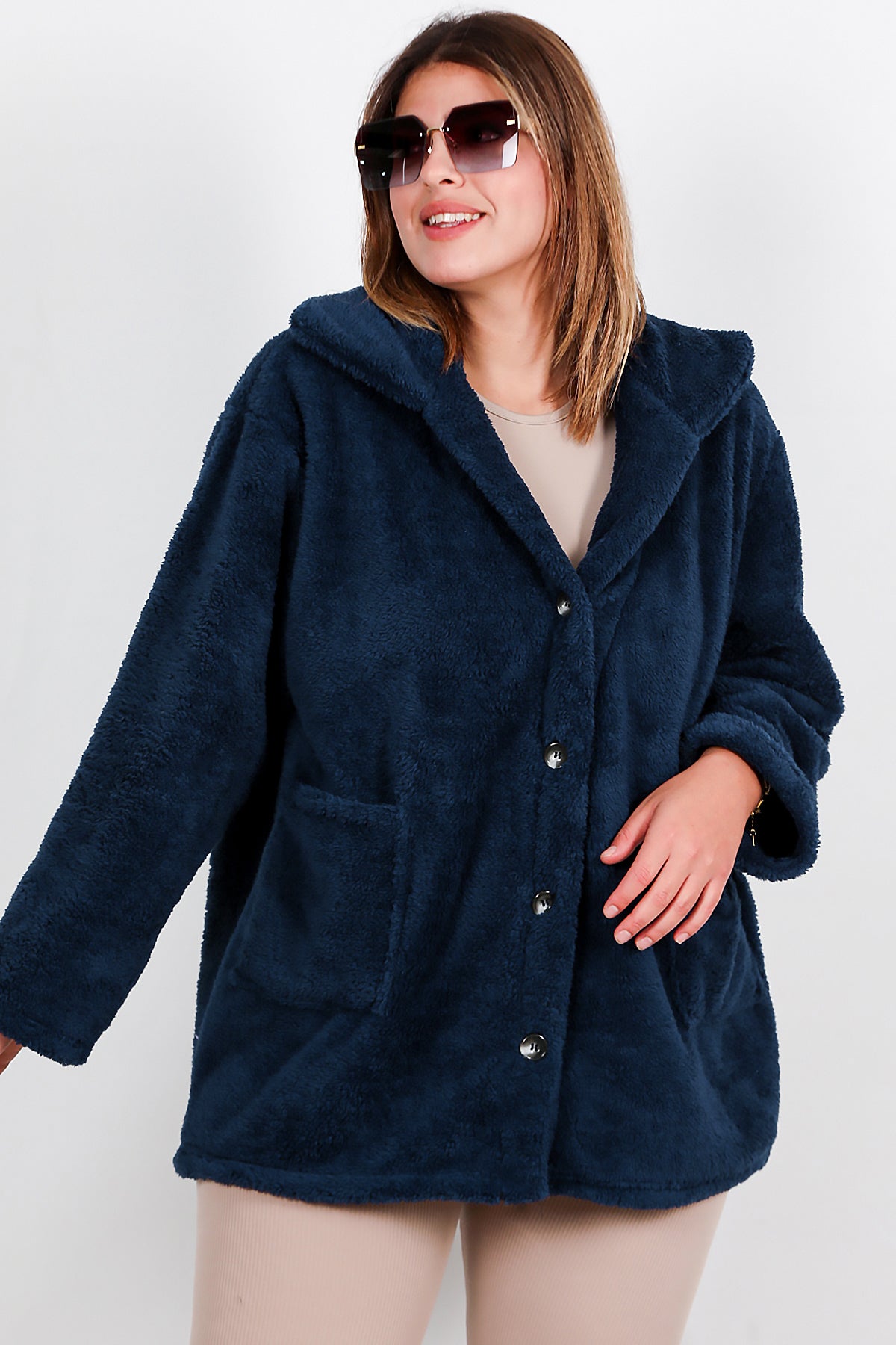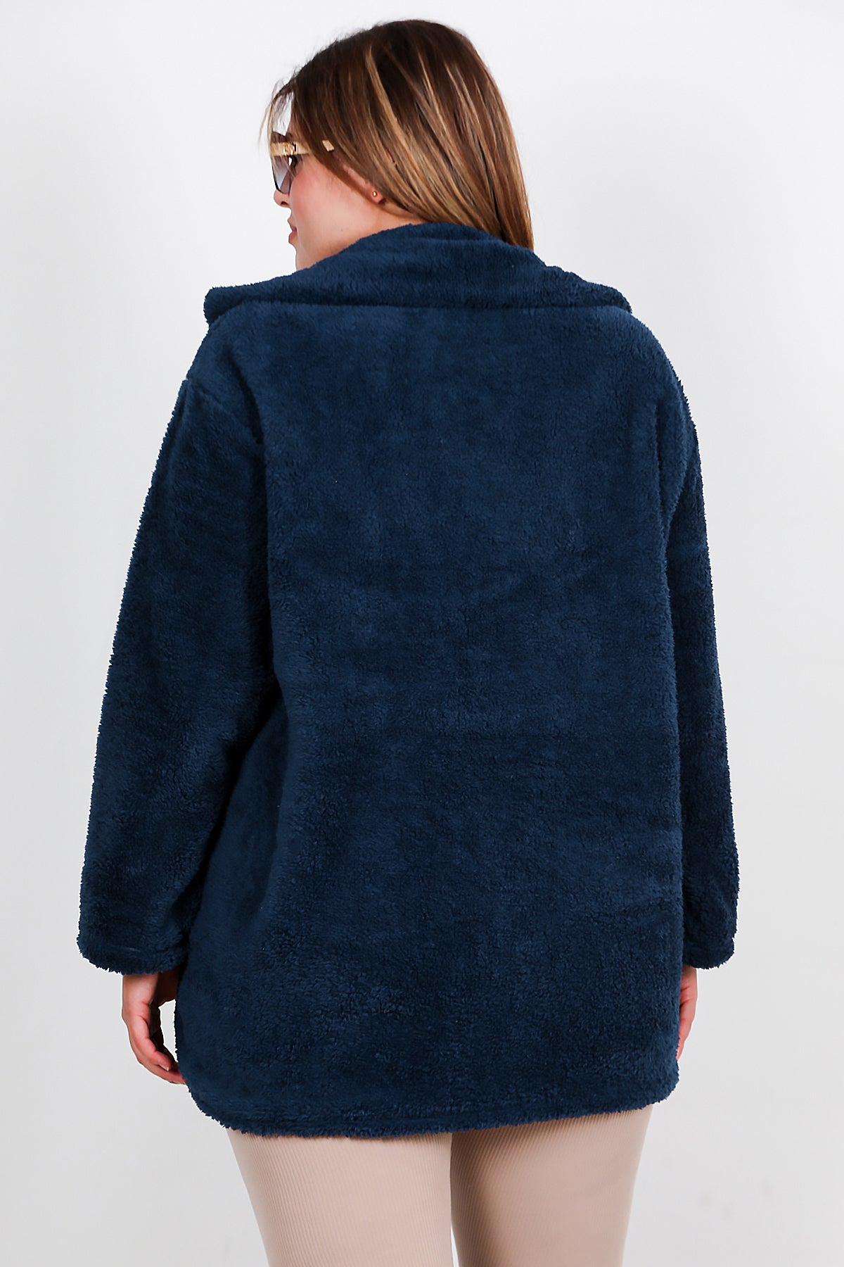 Büyük Beden Önü Düğmeli Peluş Ceket Lacivert