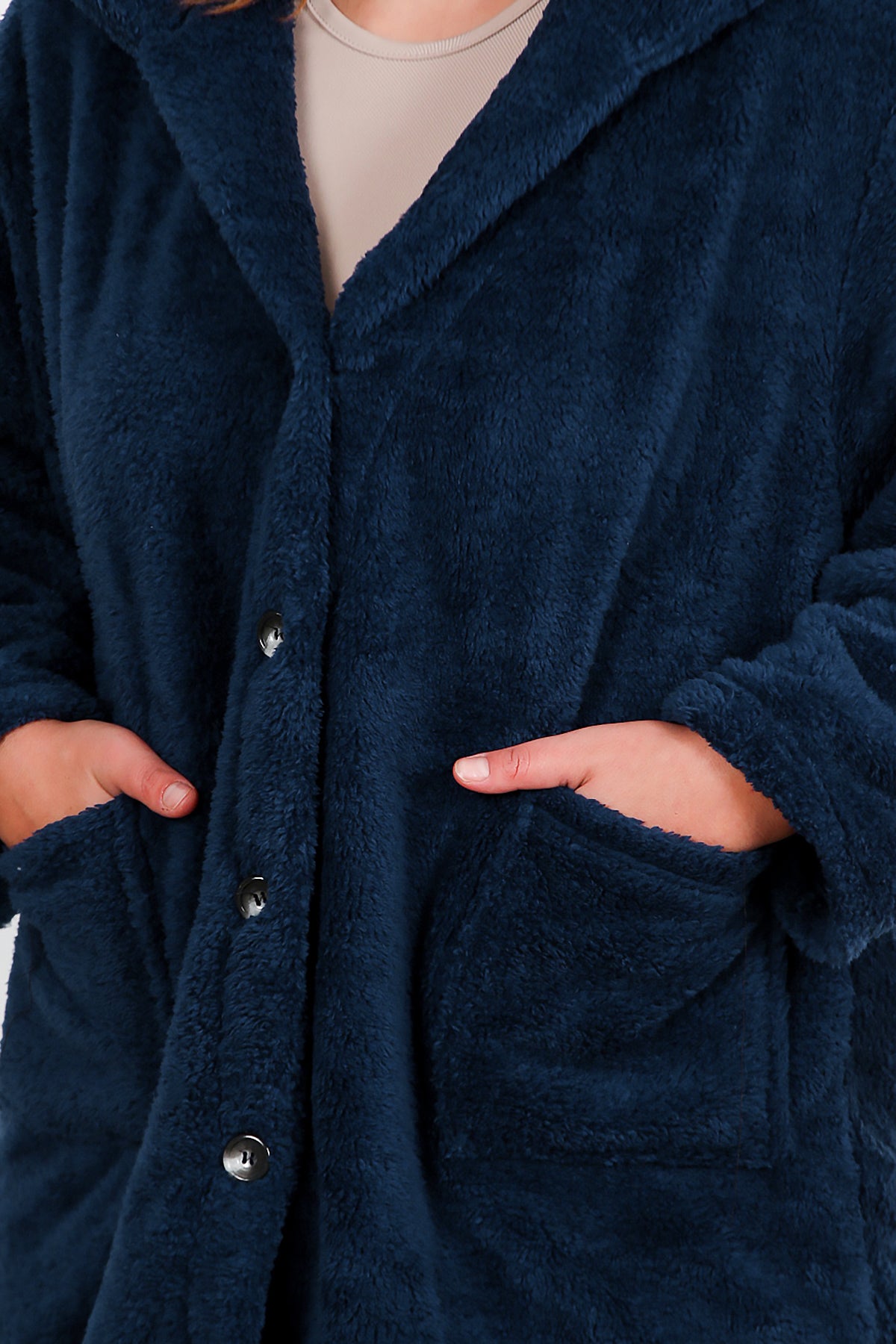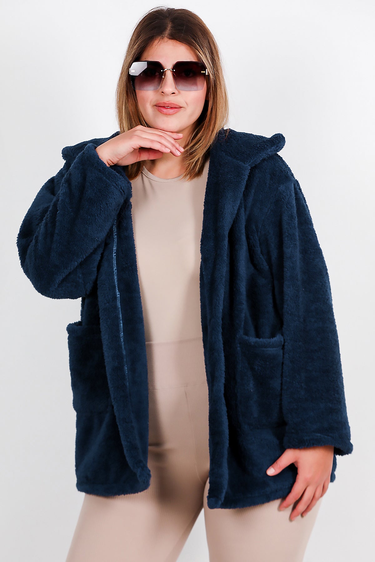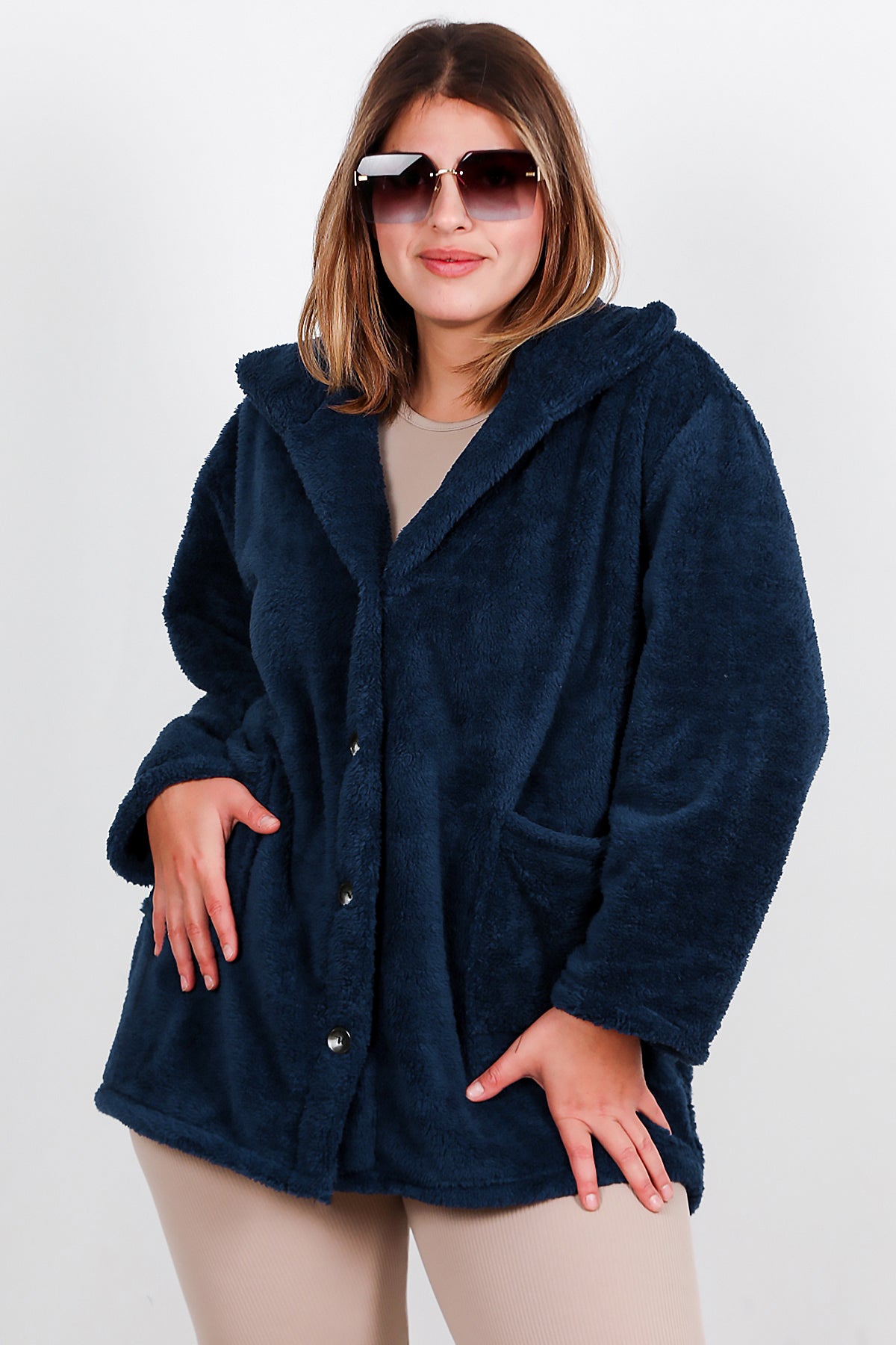 Büyük Beden Önü Düğmeli Peluş Ceket Lacivert