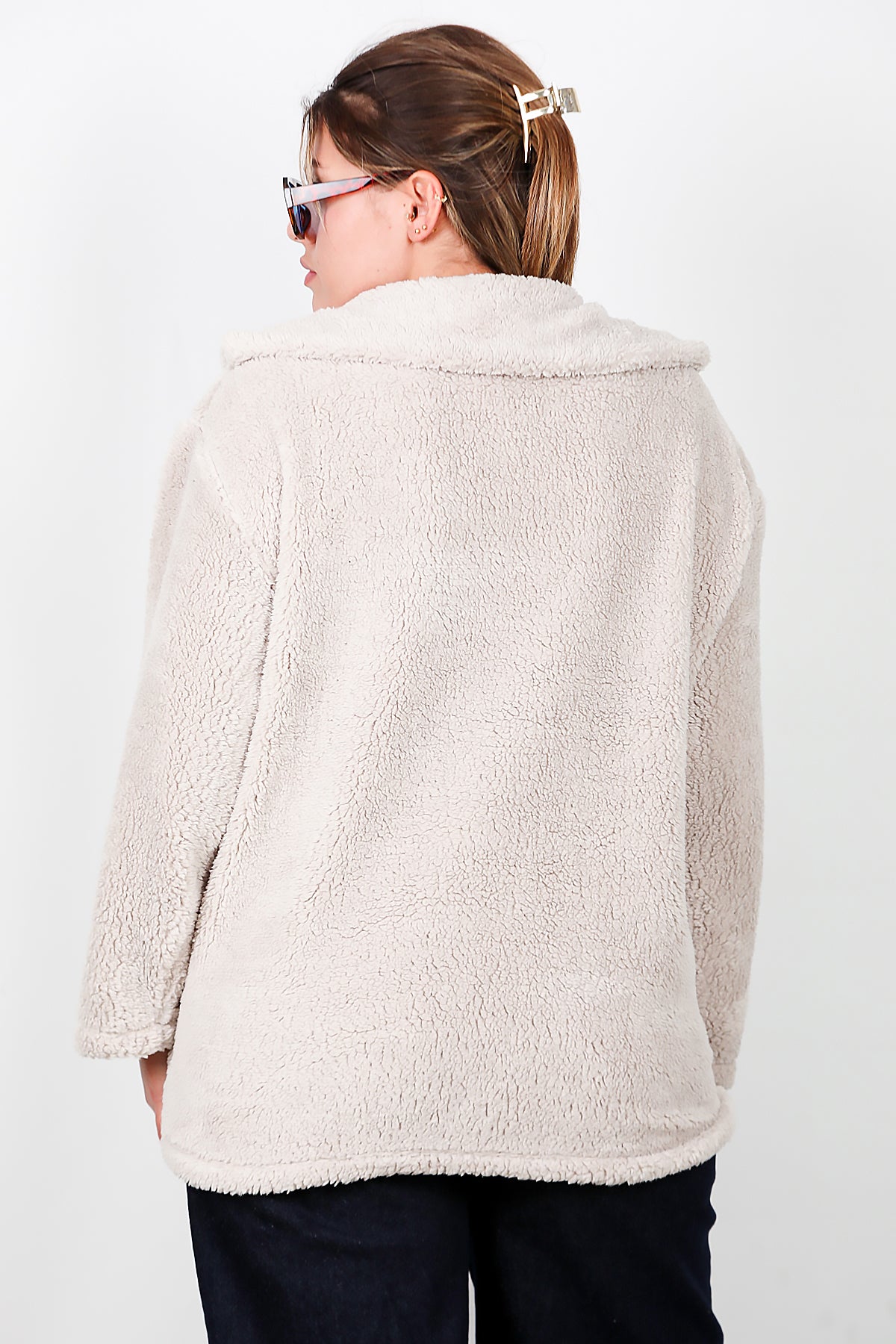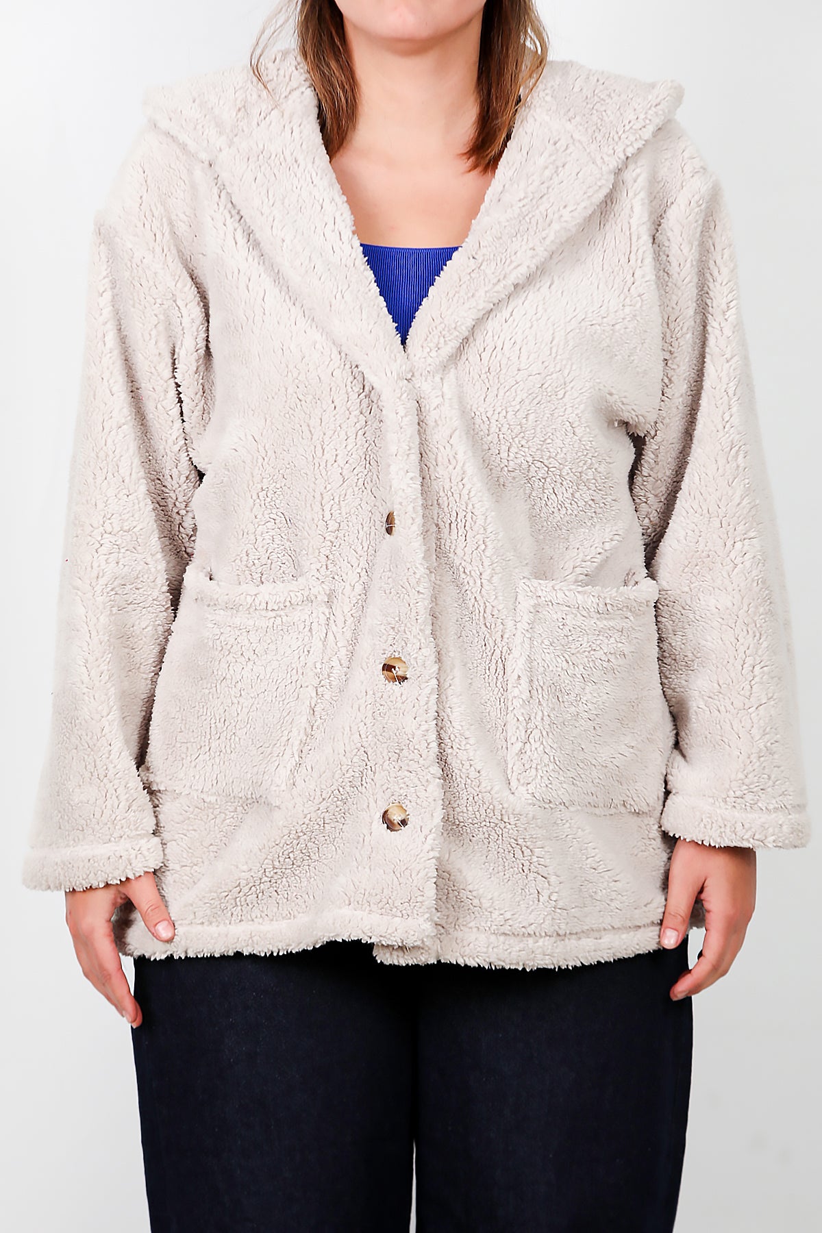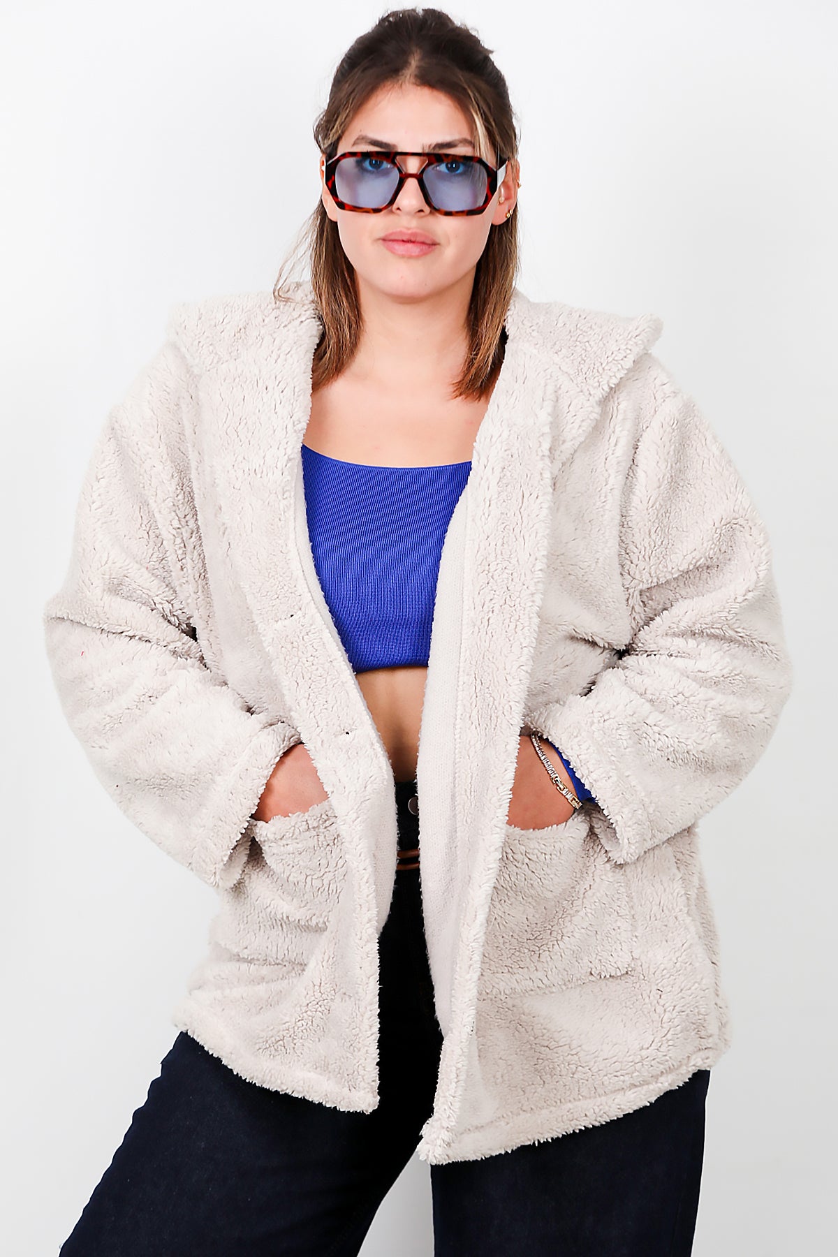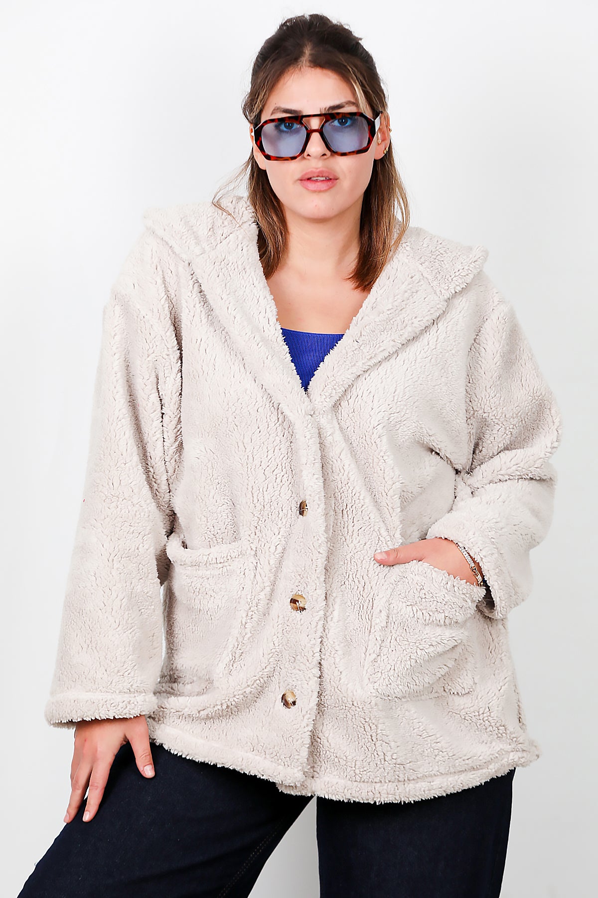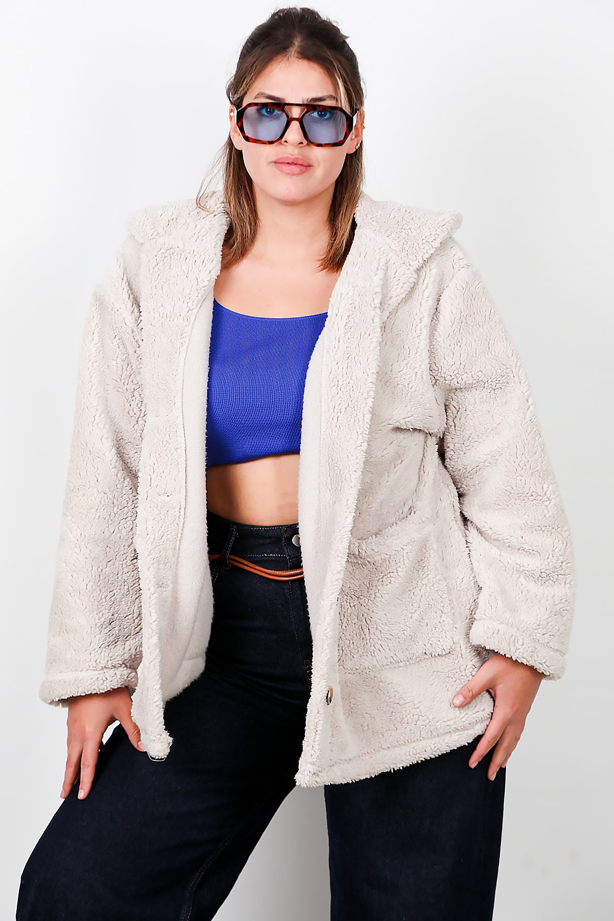 Büyük Beden Önü Düğmeli Peluş Ceket Taş