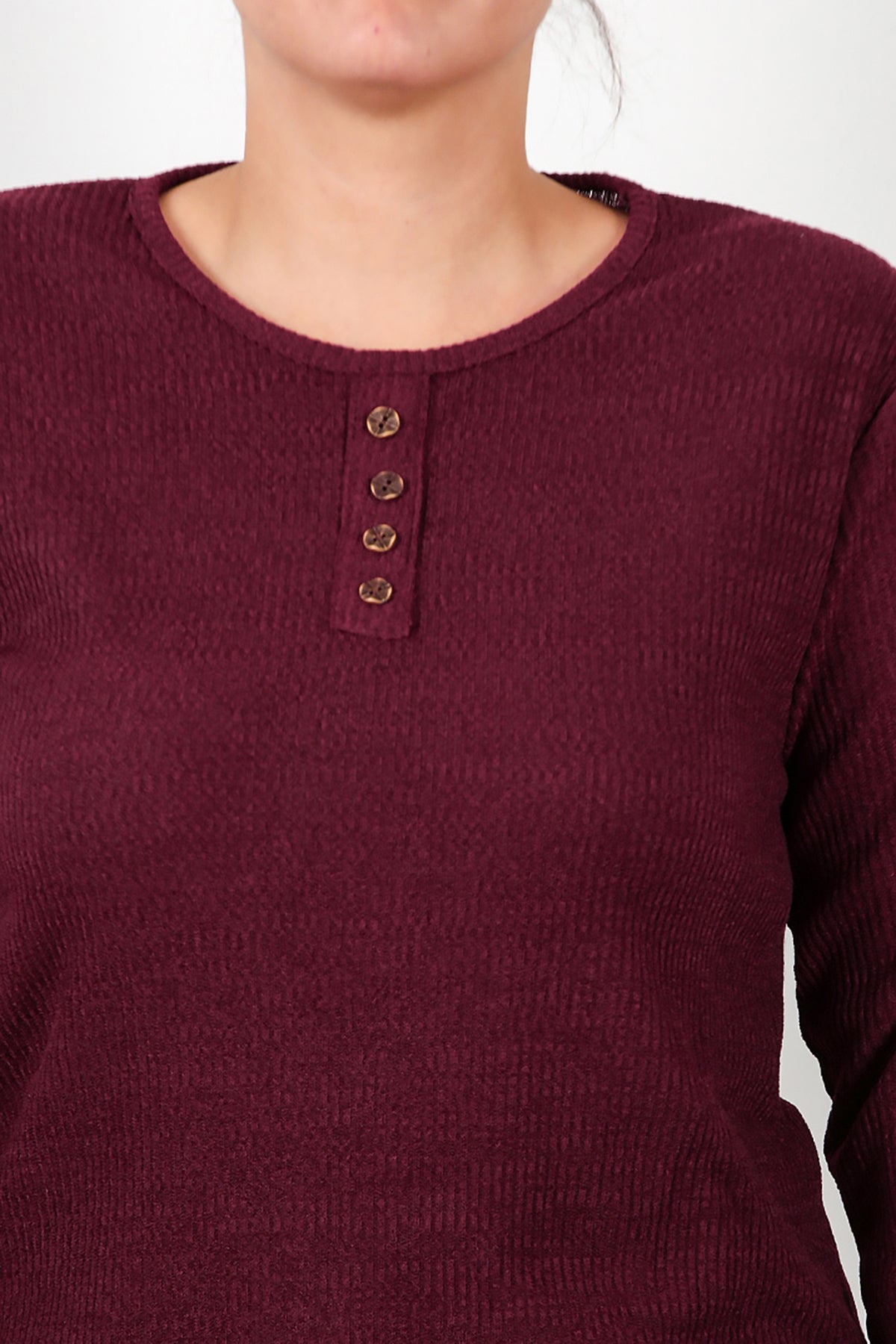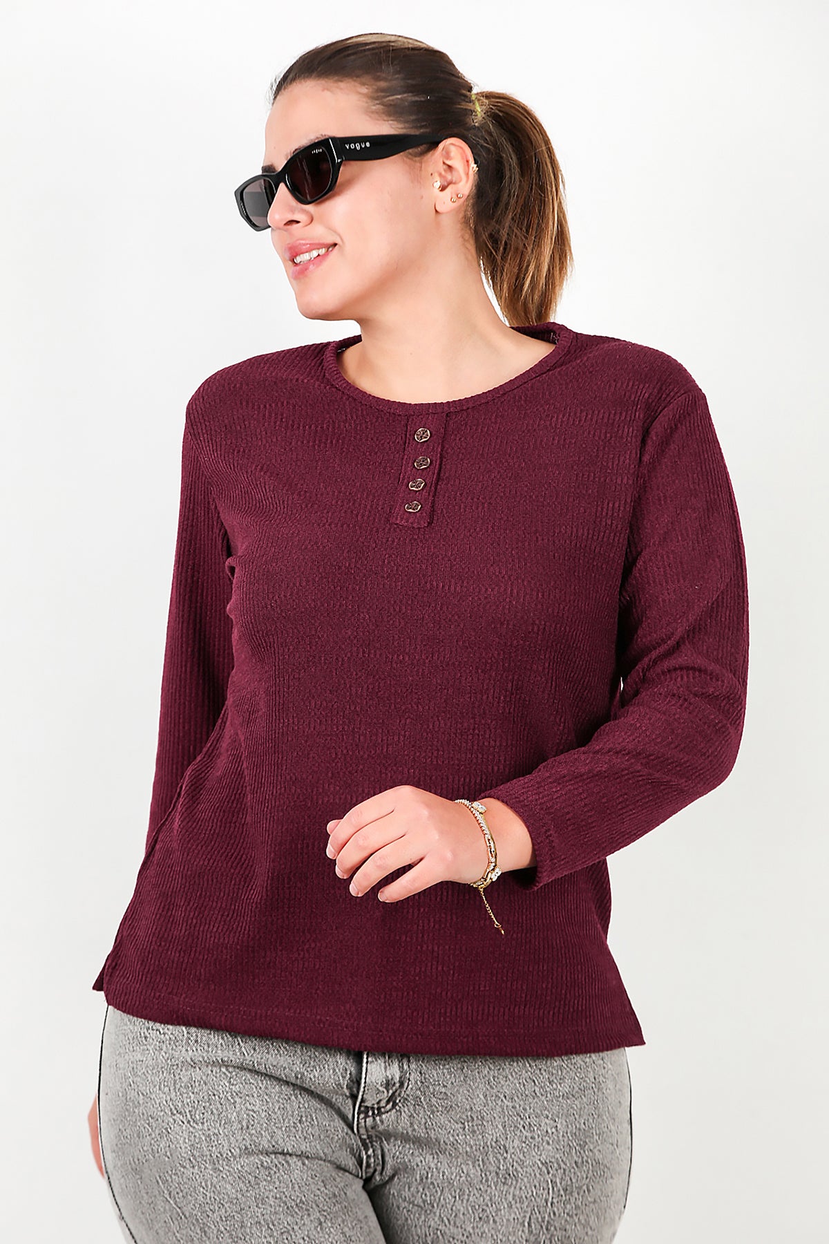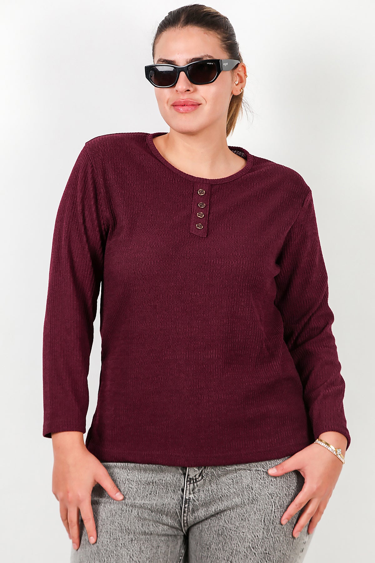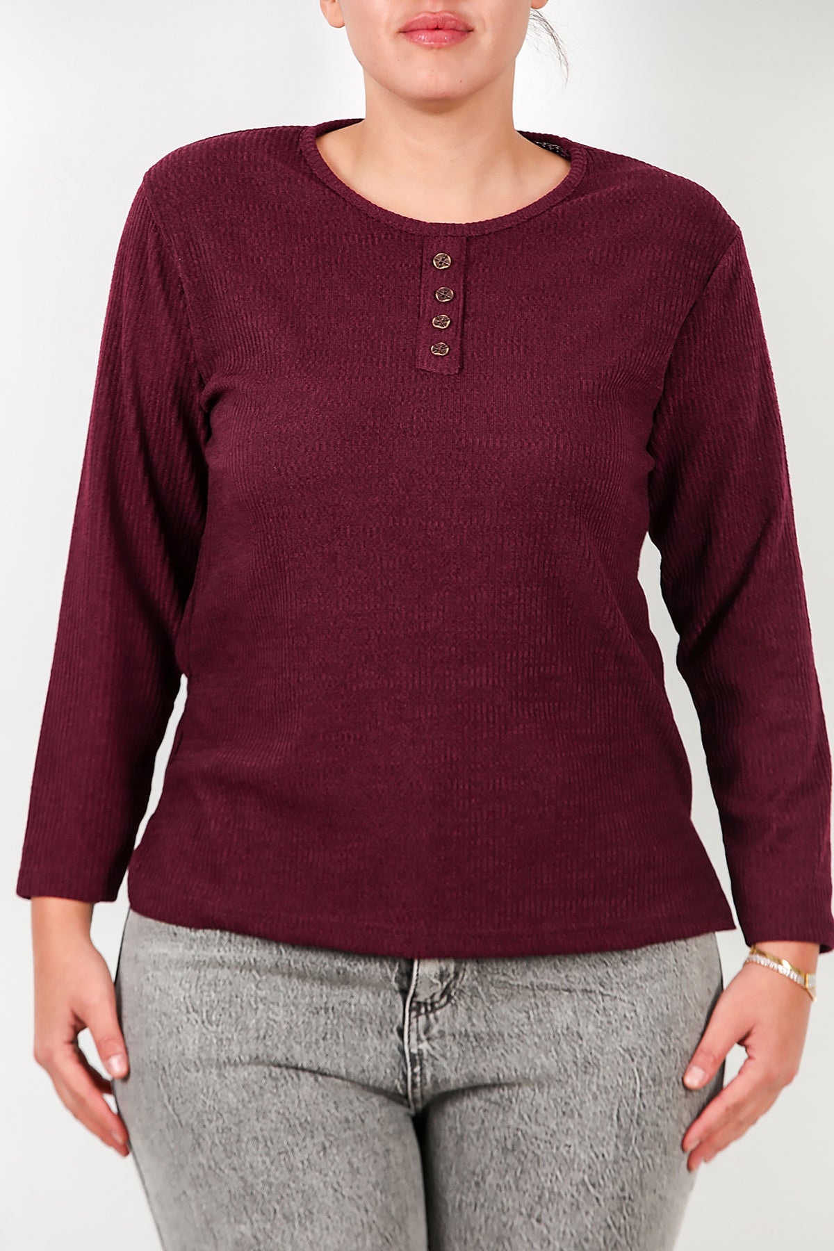 Büyük Beden Önü Düğmeli Triko Bluz Bordo