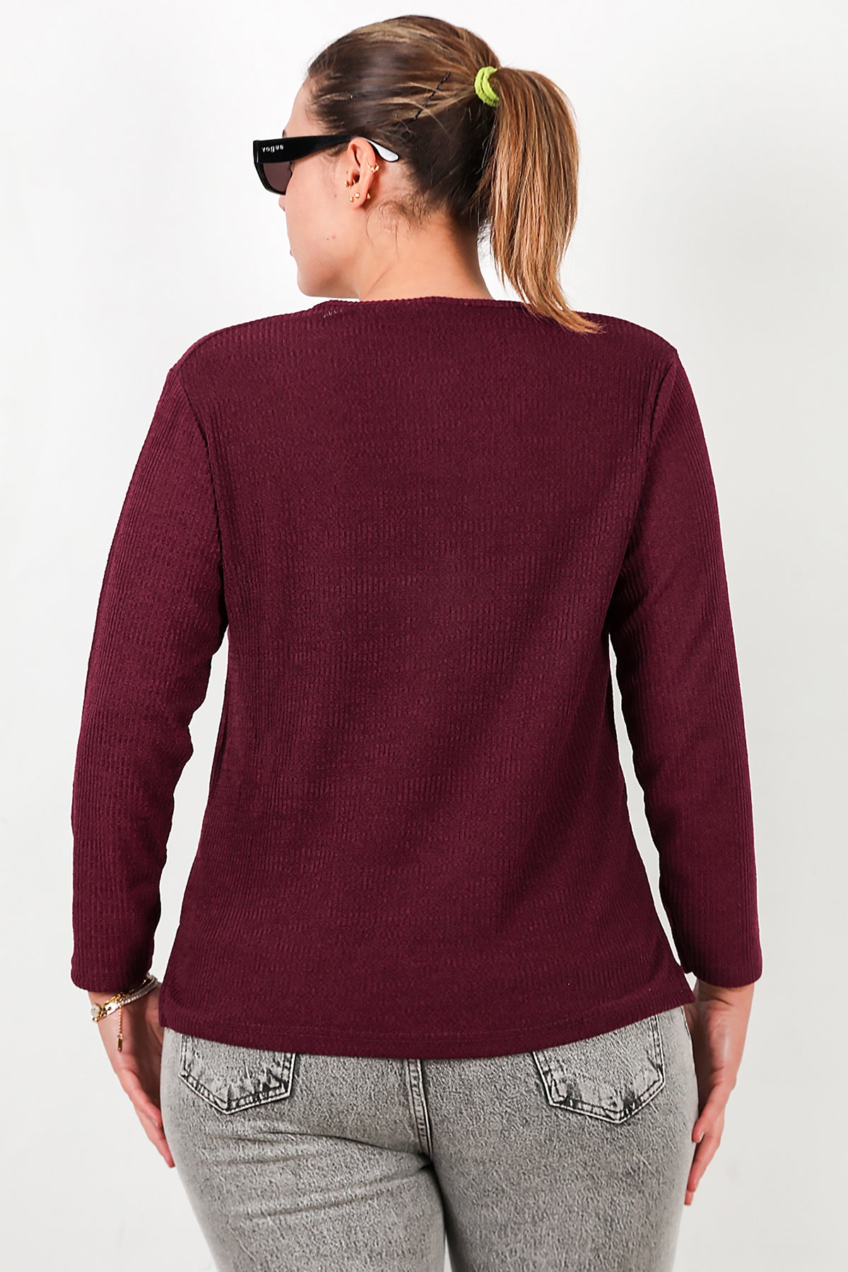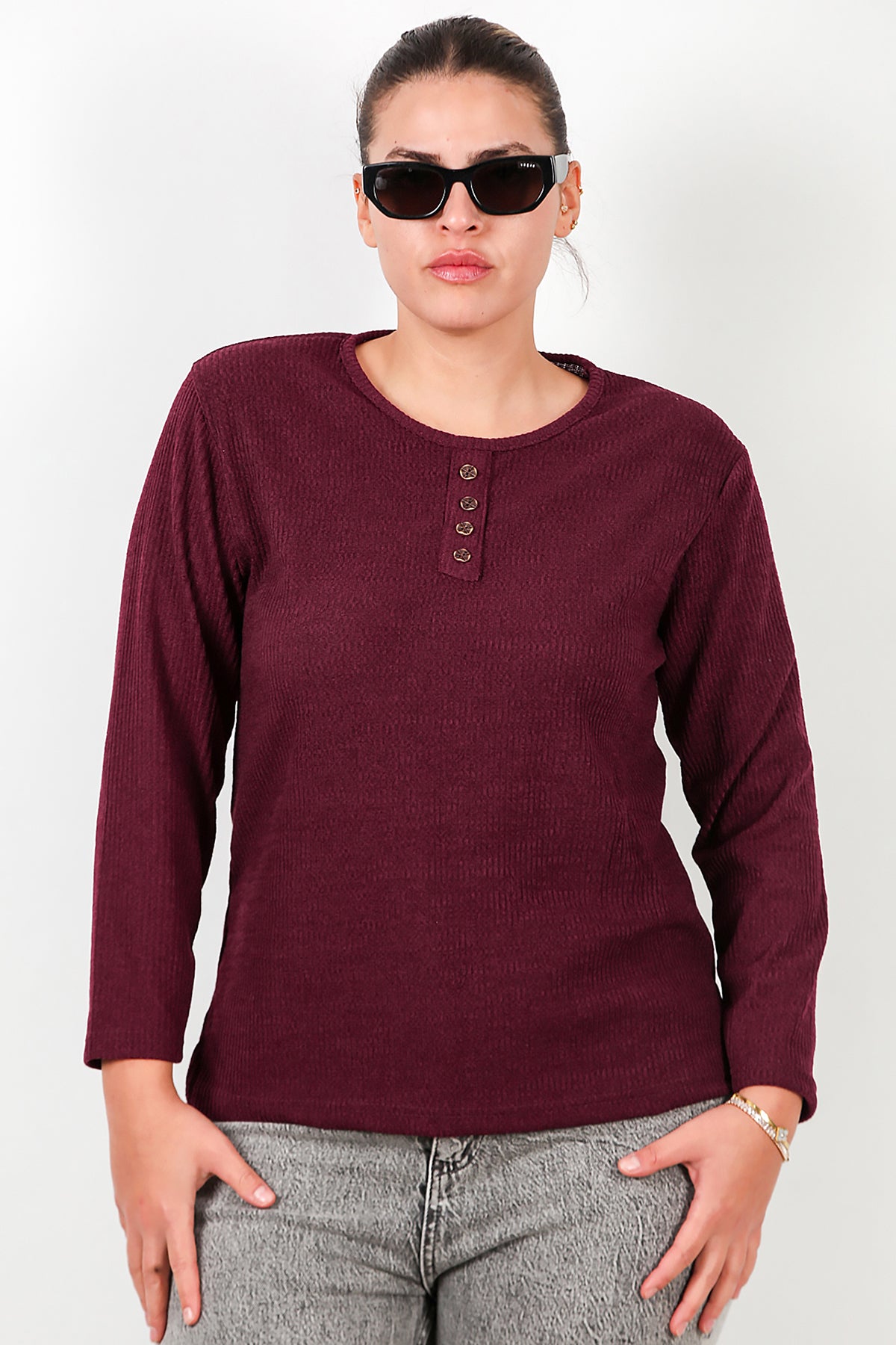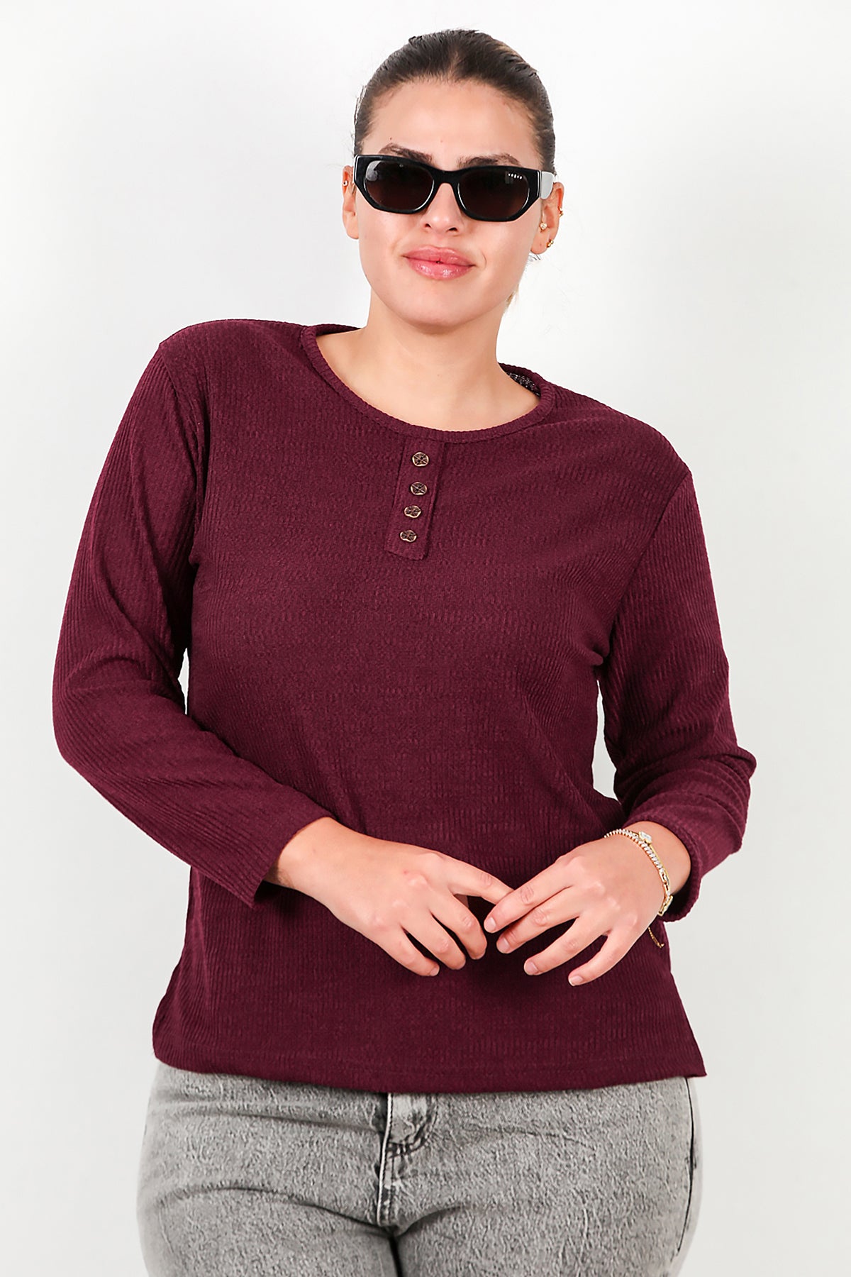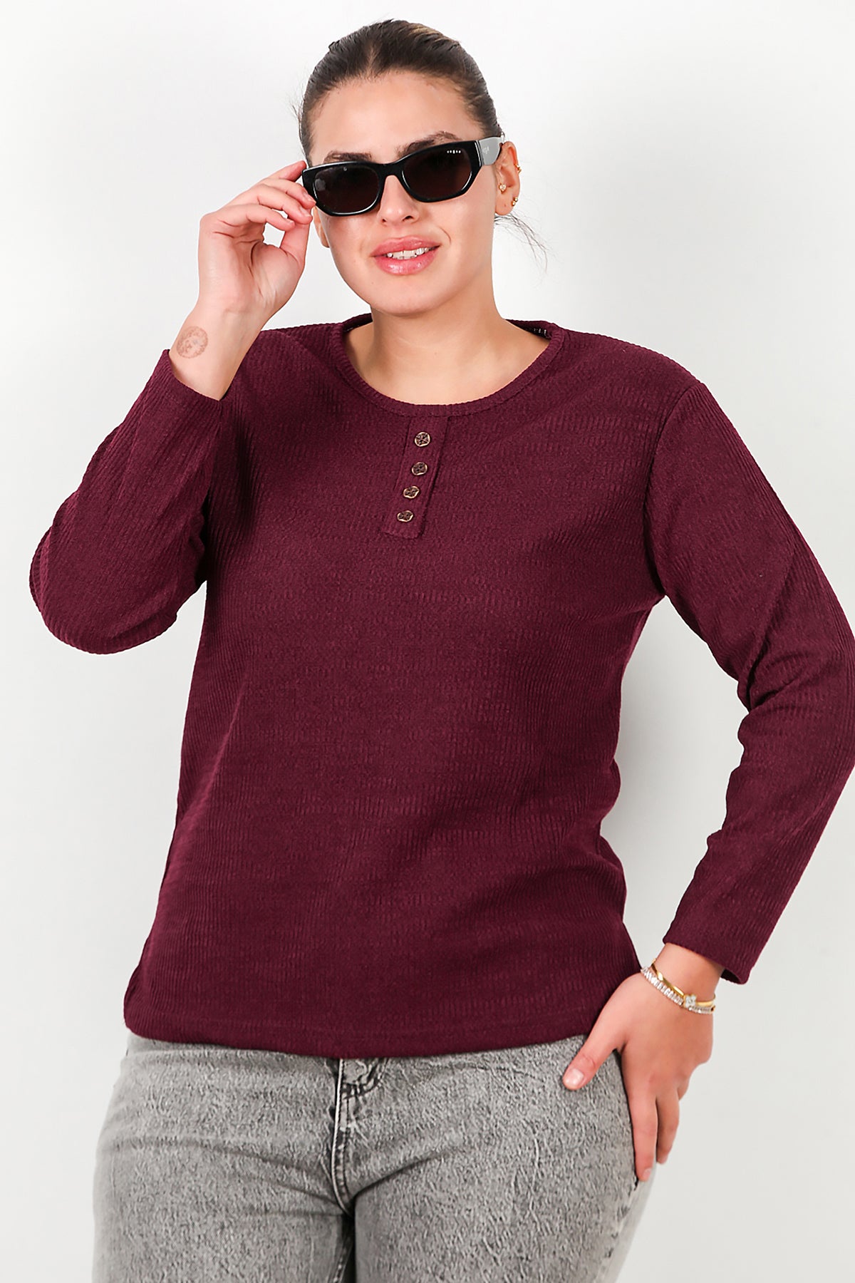 Büyük Beden Önü Düğmeli Triko Bluz Bordo