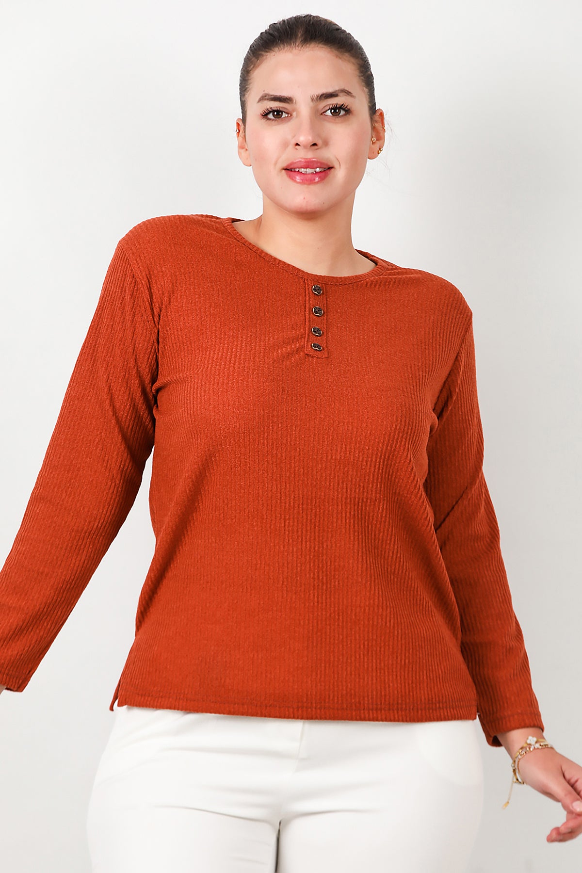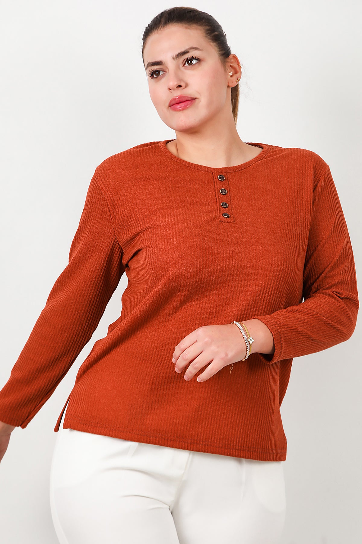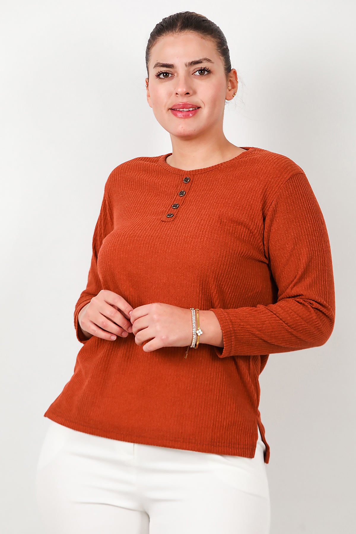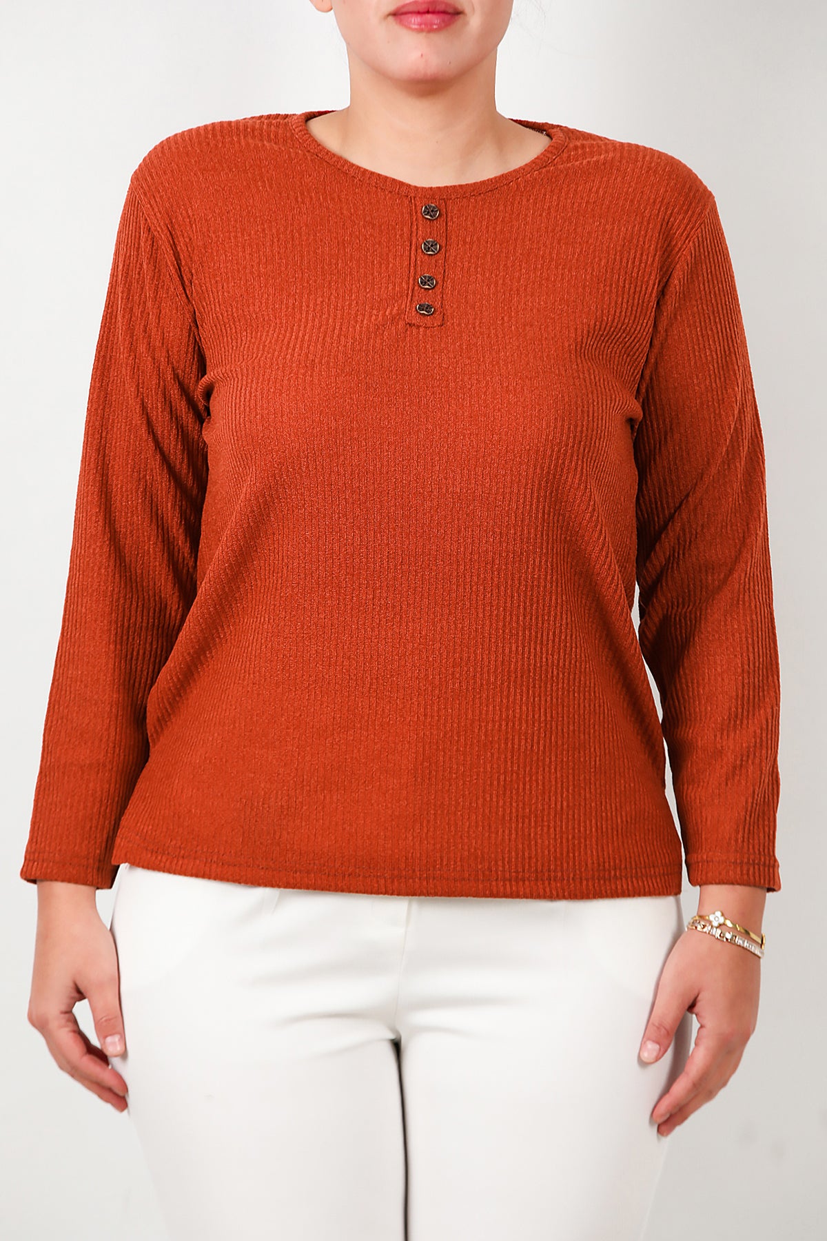 Büyük Beden Önü Düğmeli Triko Bluz Kiremit