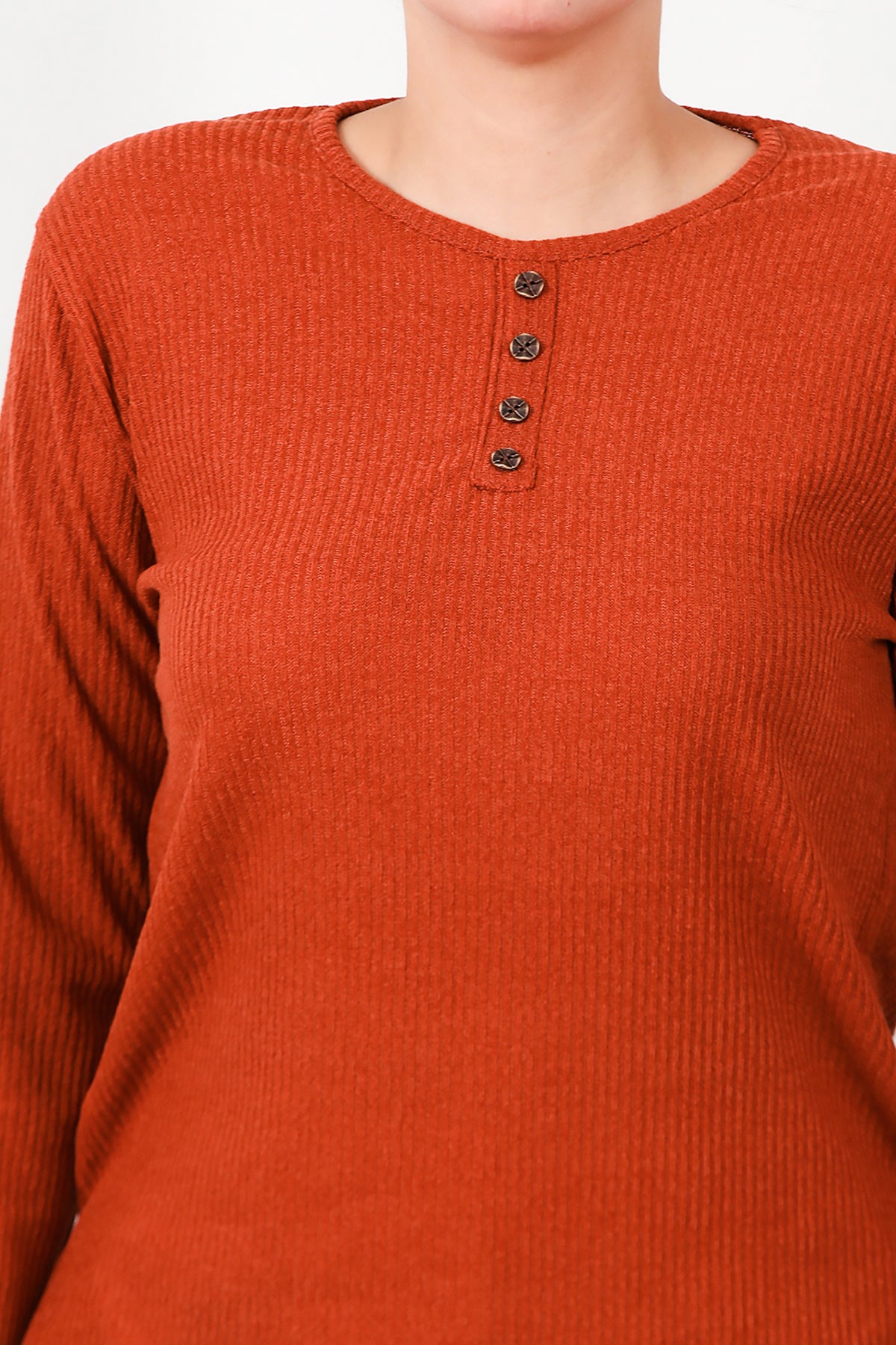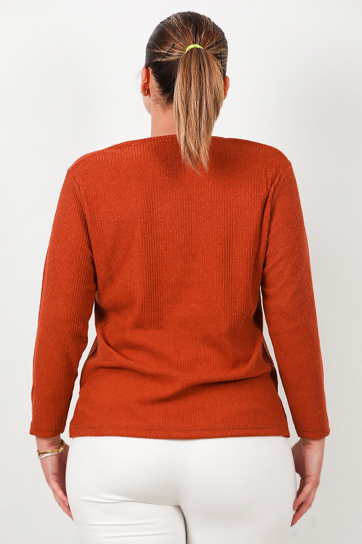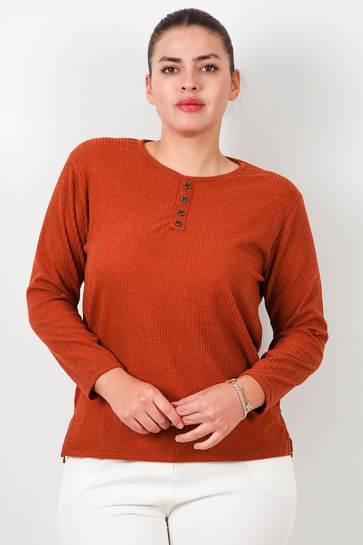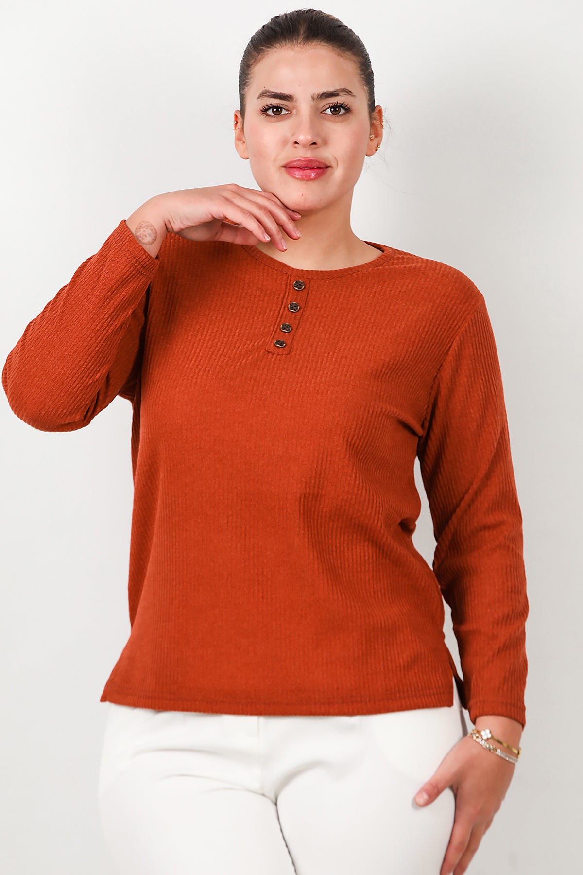 Büyük Beden Önü Düğmeli Triko Bluz Kiremit