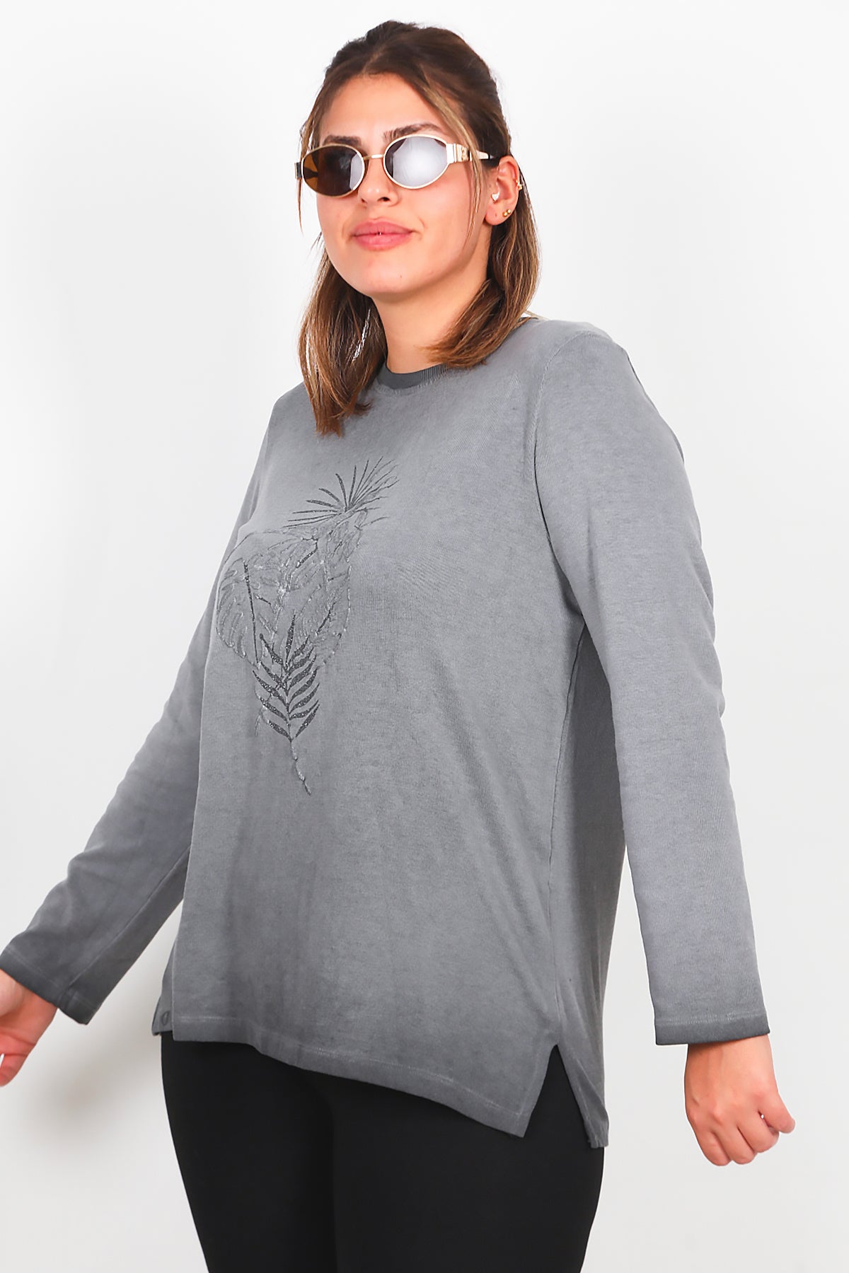 Büyük Beden Önü Kabartmalı Bluz Gri