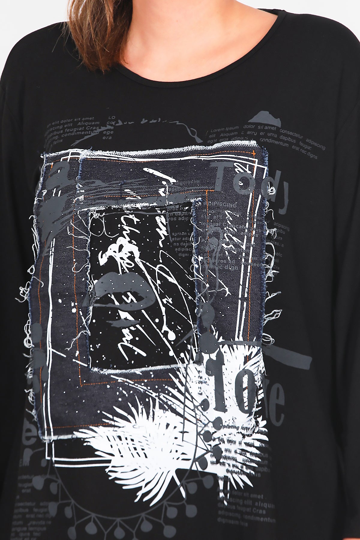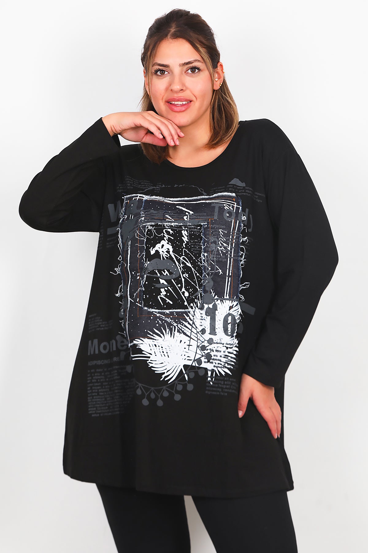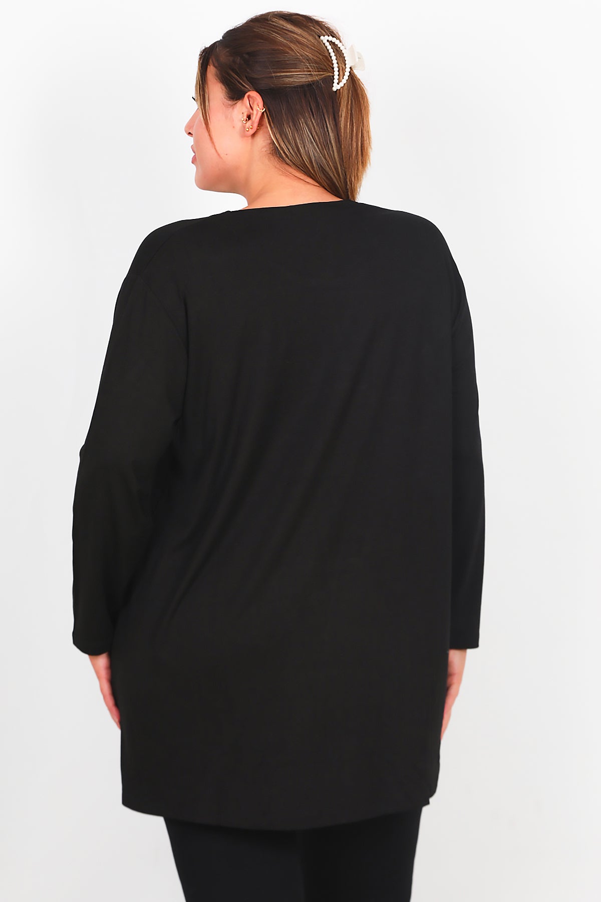 Büyük Beden Önü Kot Detay Uzun Kollu Bluz Siyah