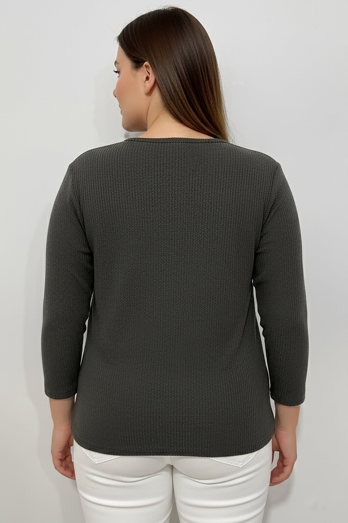 Büyük Beden Önü Renkli Düğmeli Triko Bluz Haki