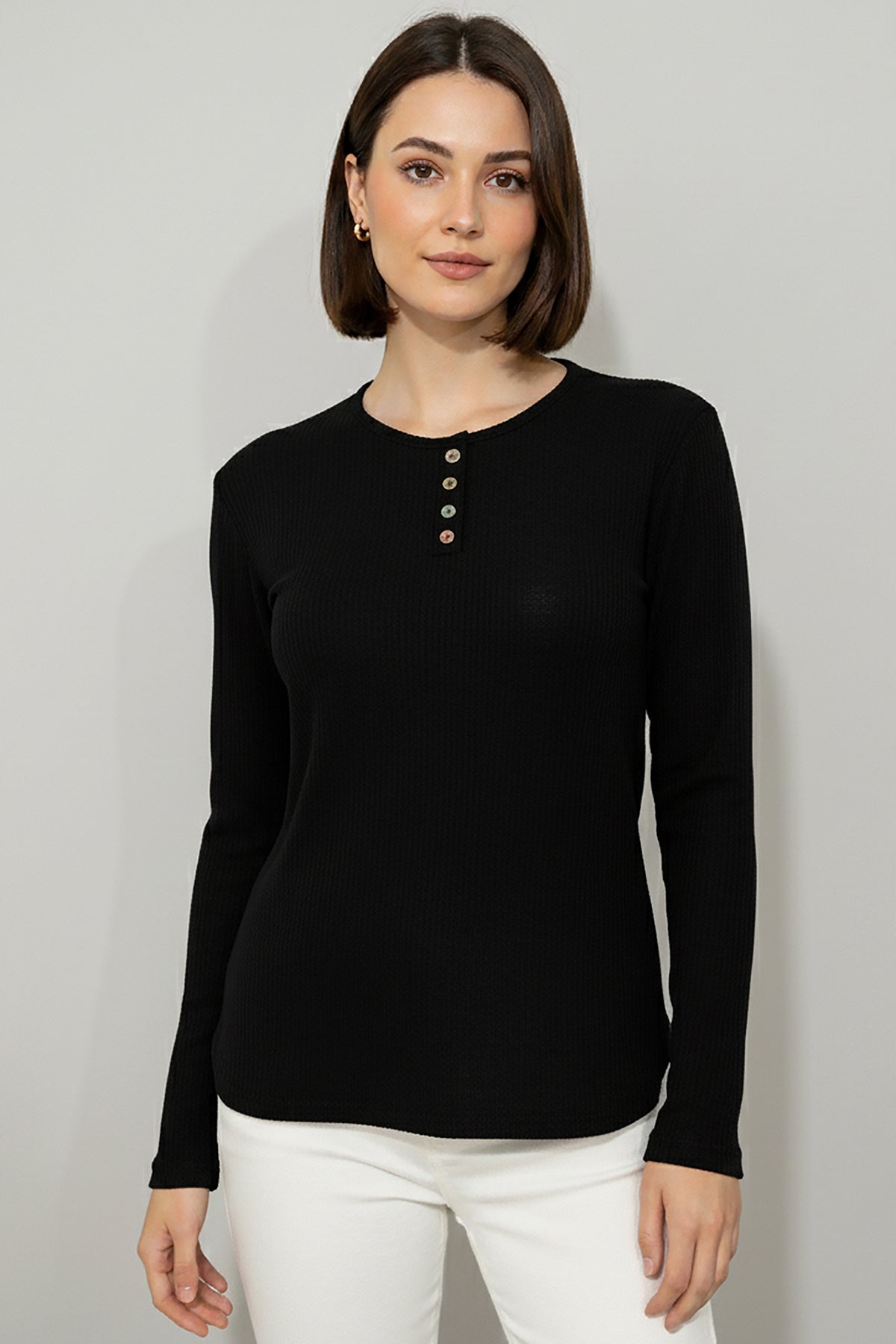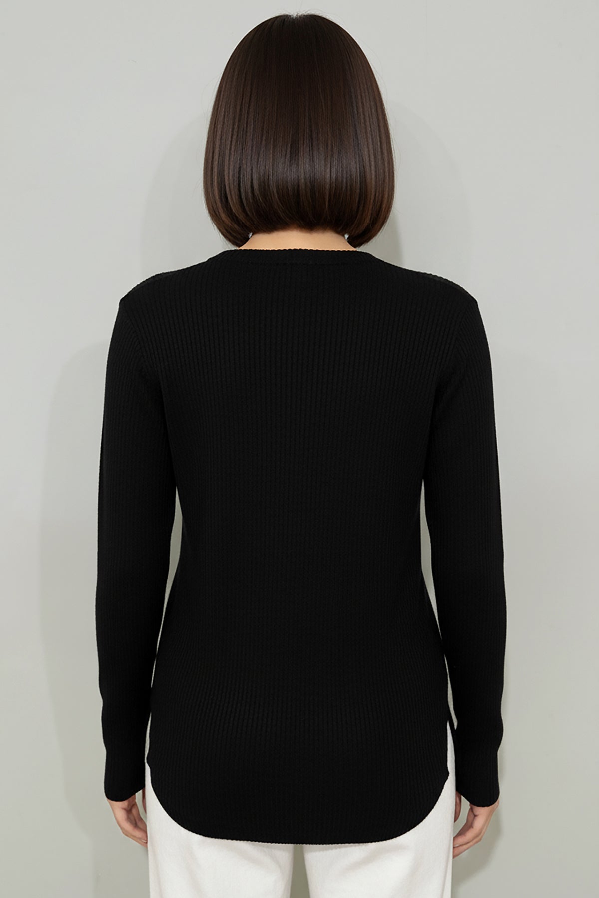 Büyük Beden Önü Renkli Düğmeli Triko Bluz Siyah