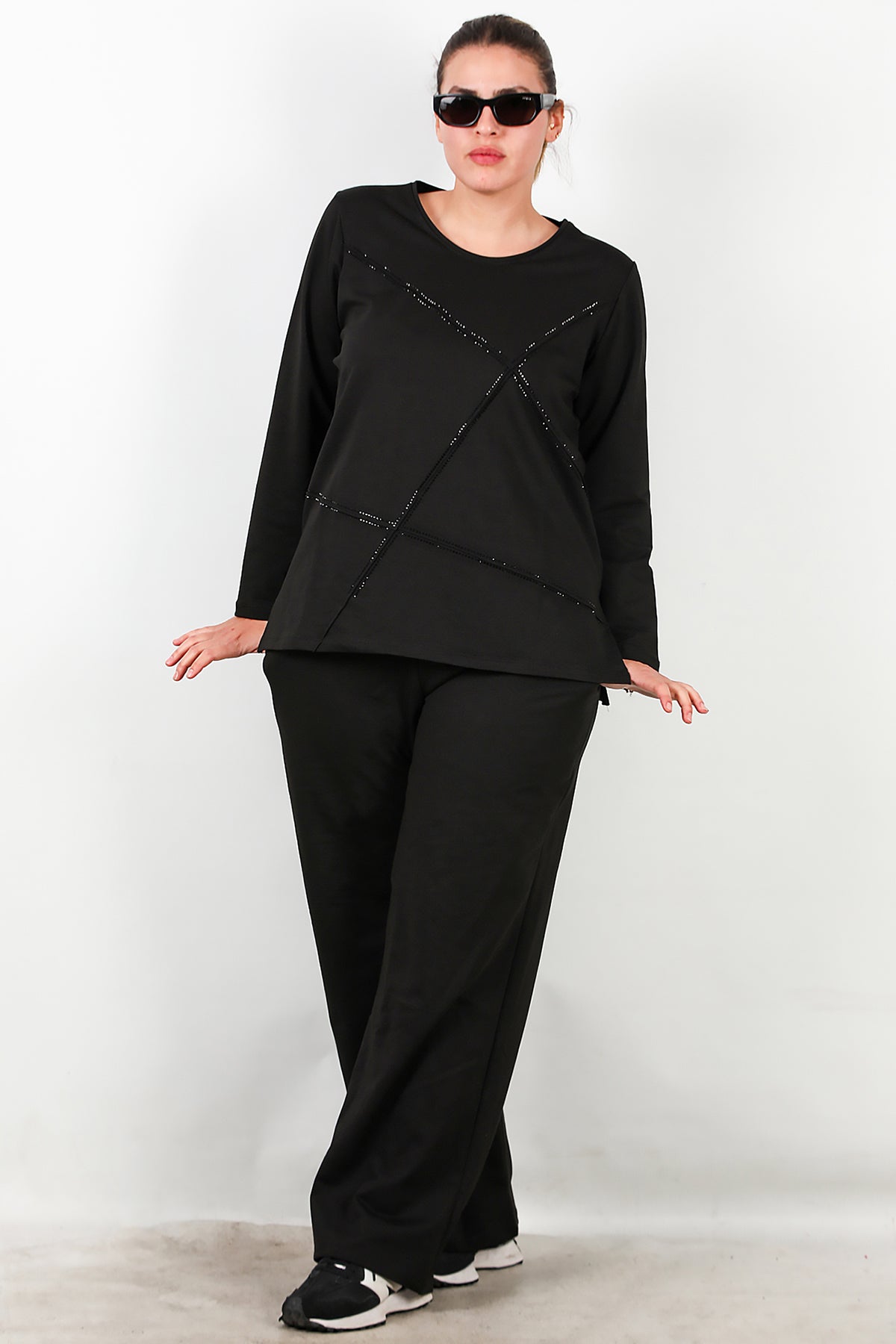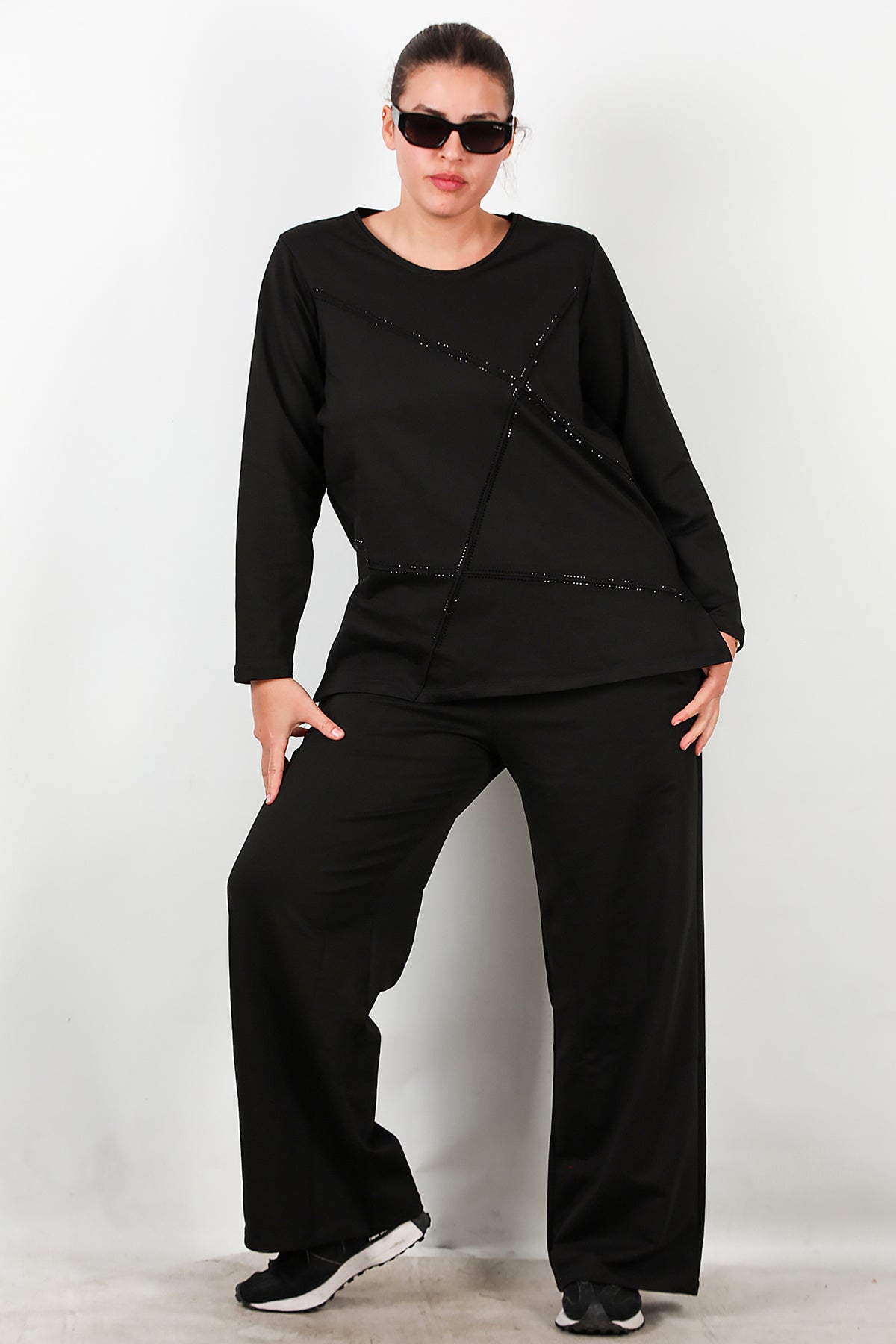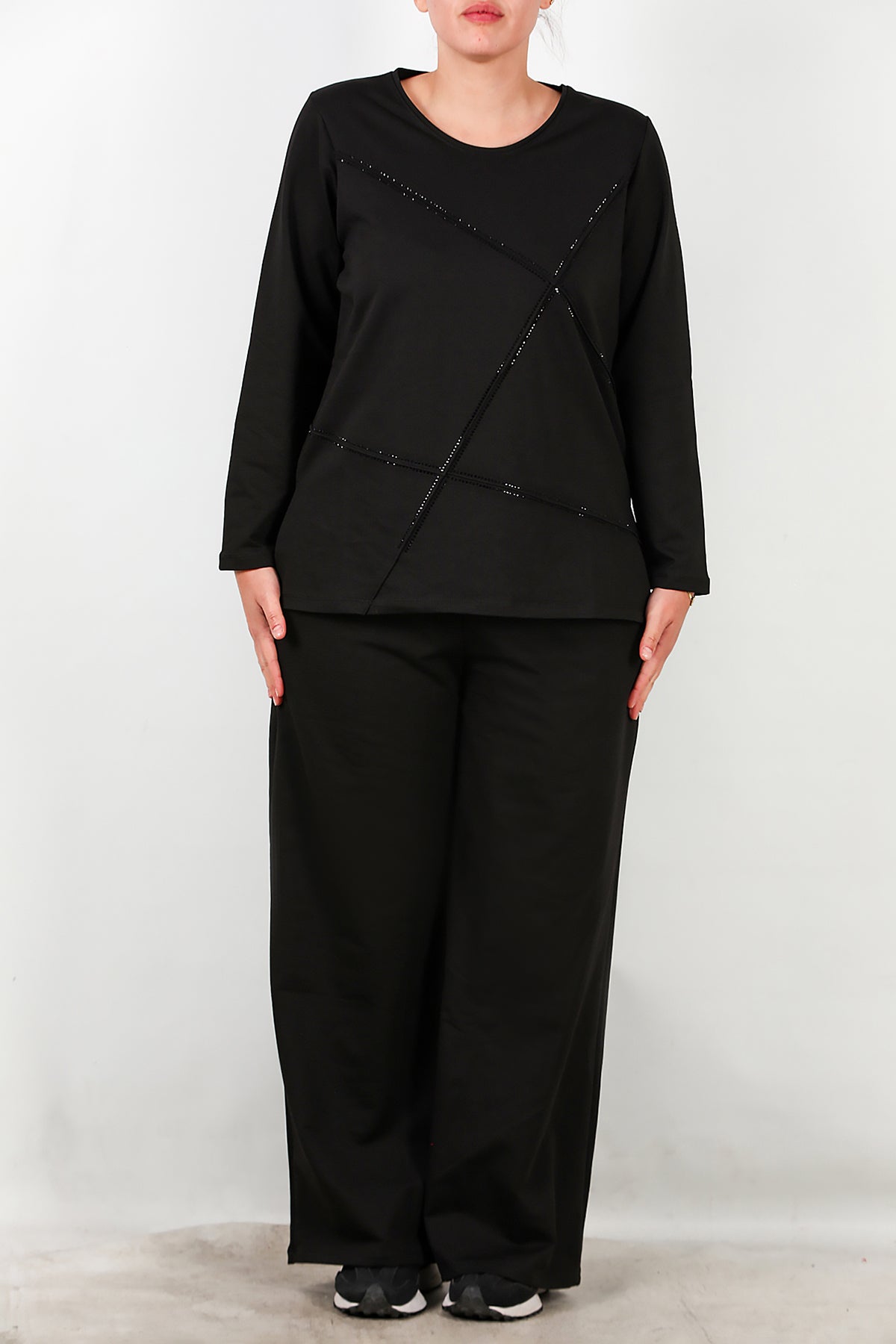Büyük Beden Önü Taş İşlemeli Takım Siyah