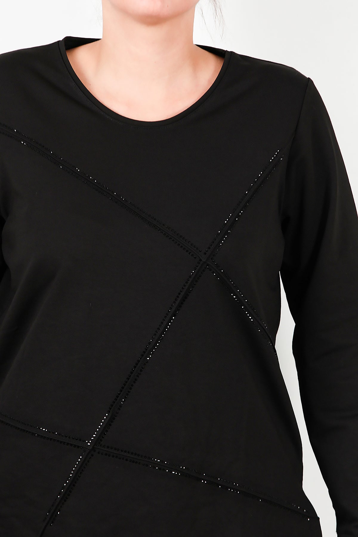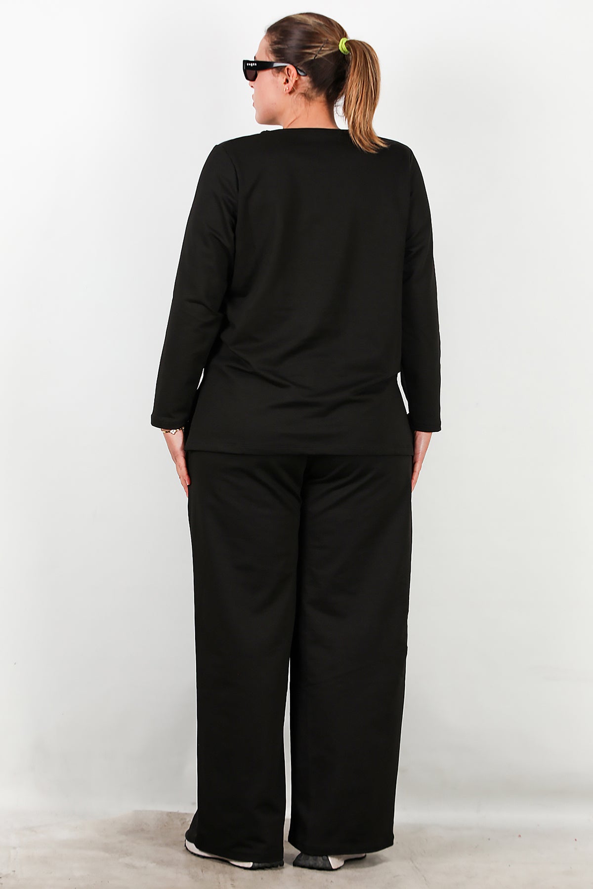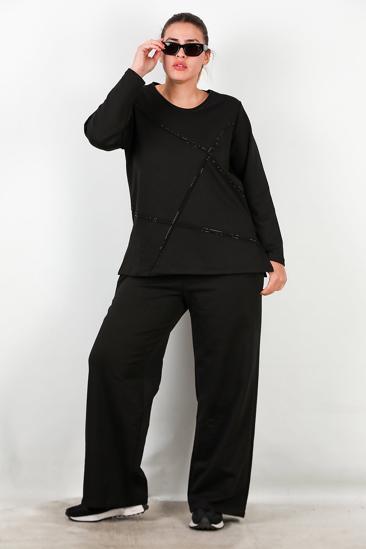 Büyük Beden Önü Taş İşlemeli Takım Siyah