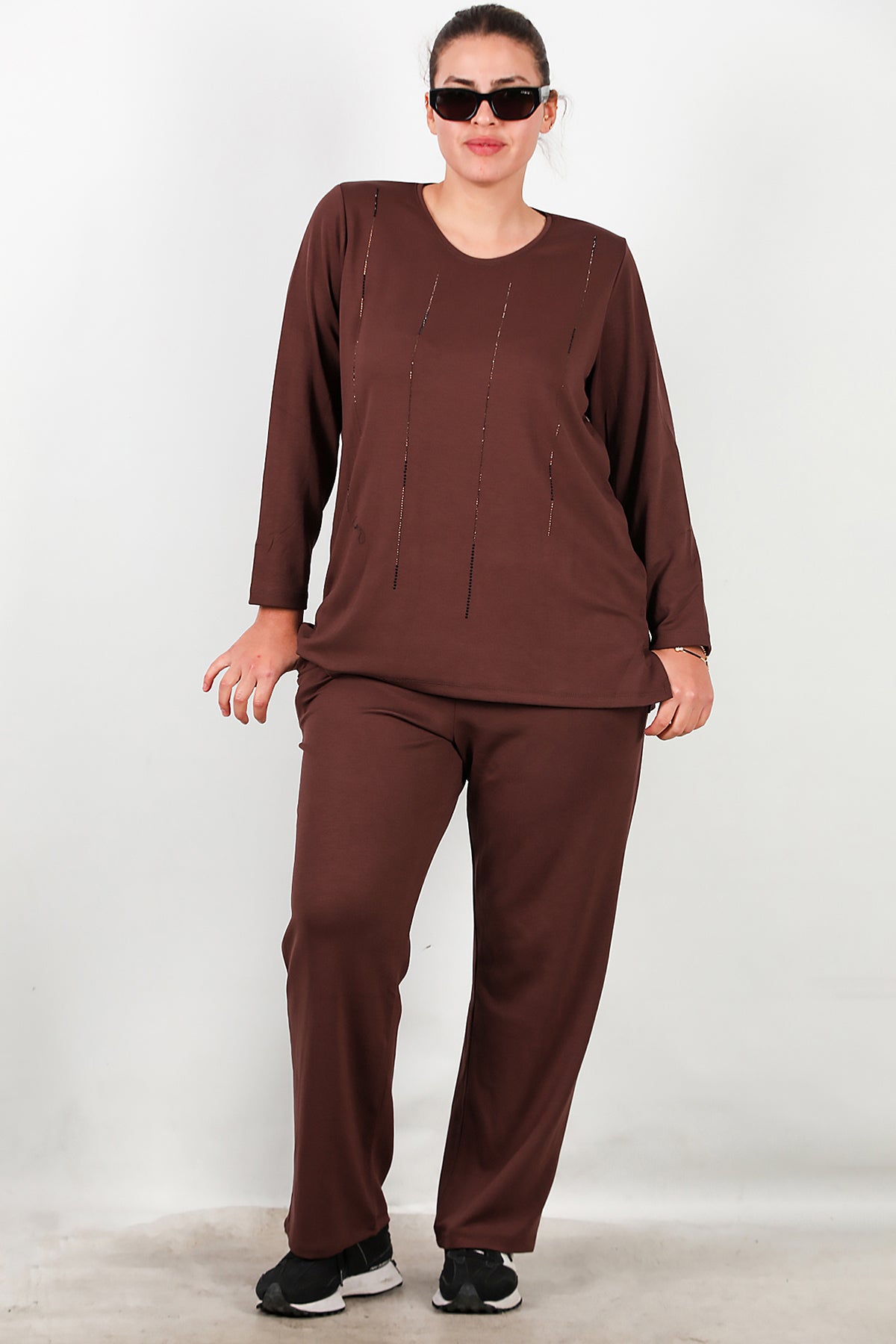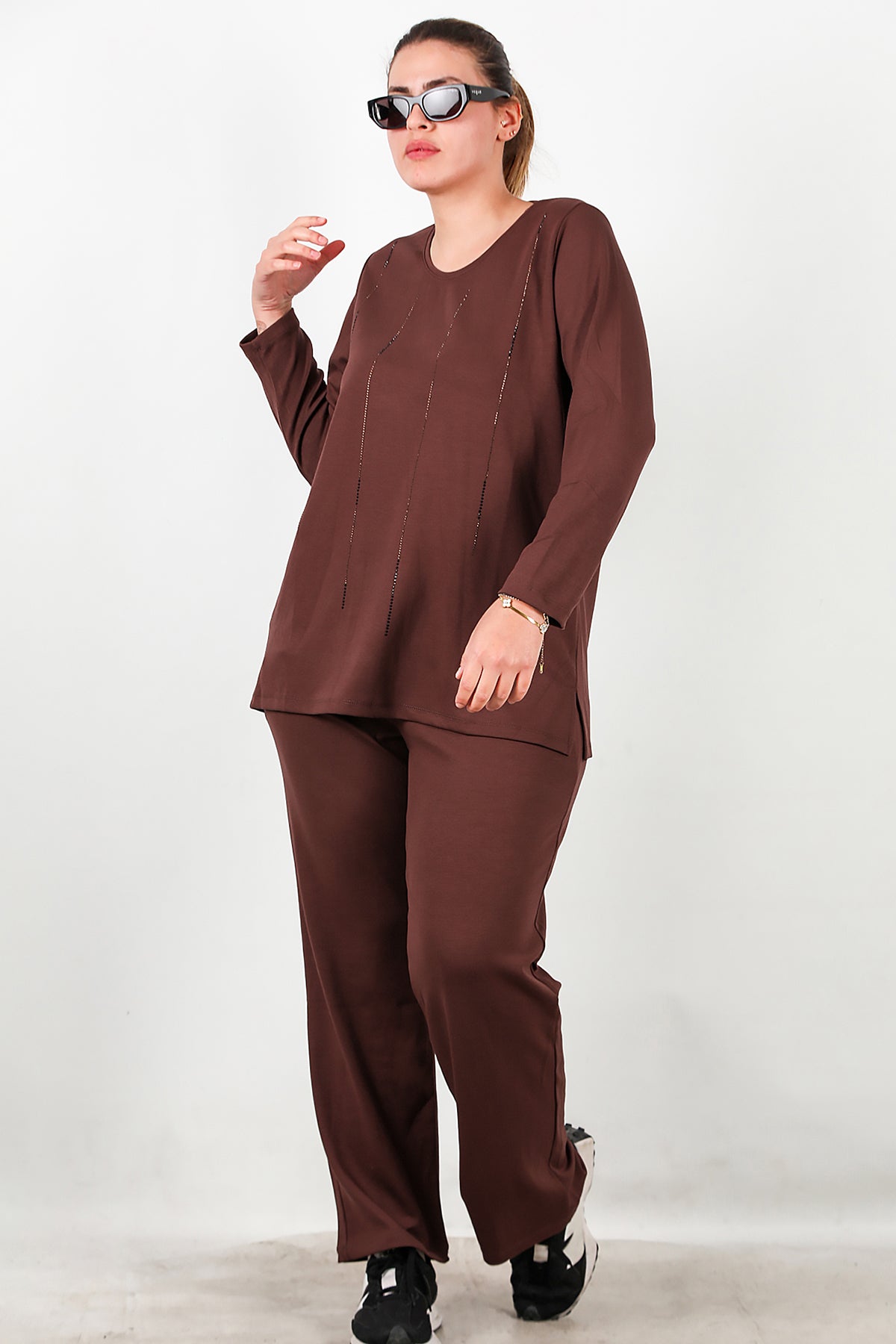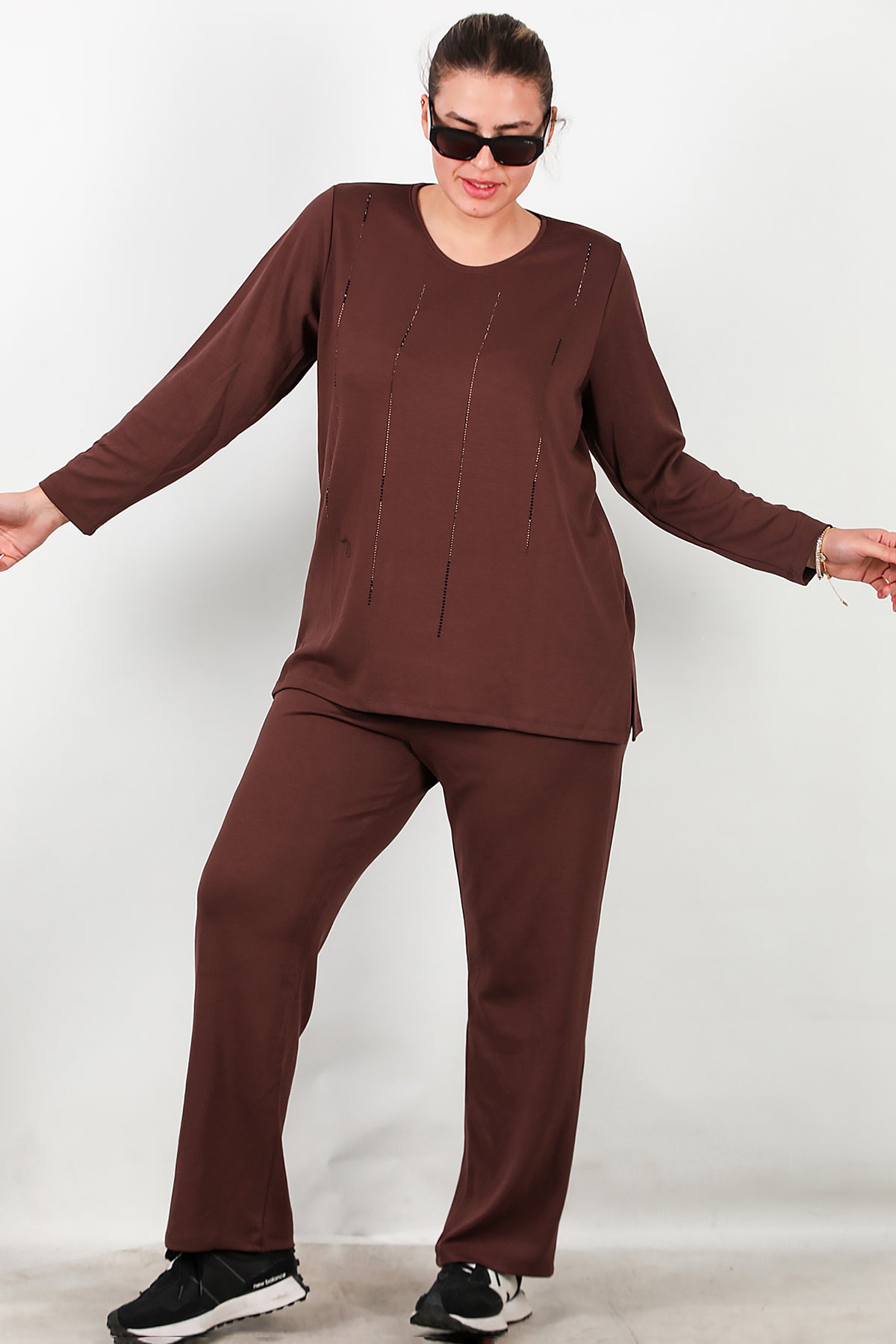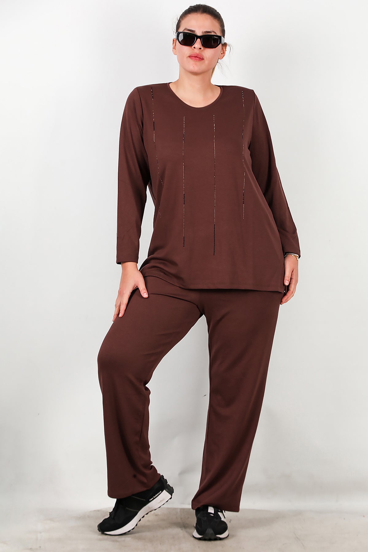 Büyük Beden Önü Taş İşlemeli Takım Kahverengi