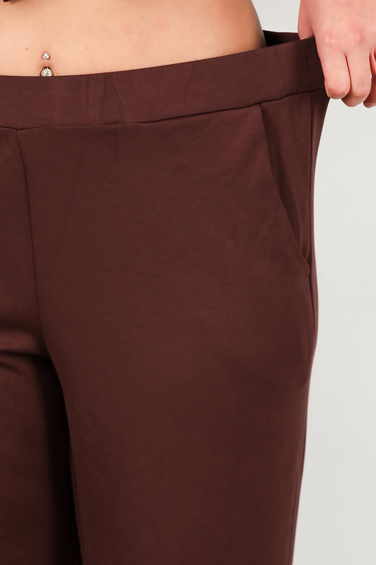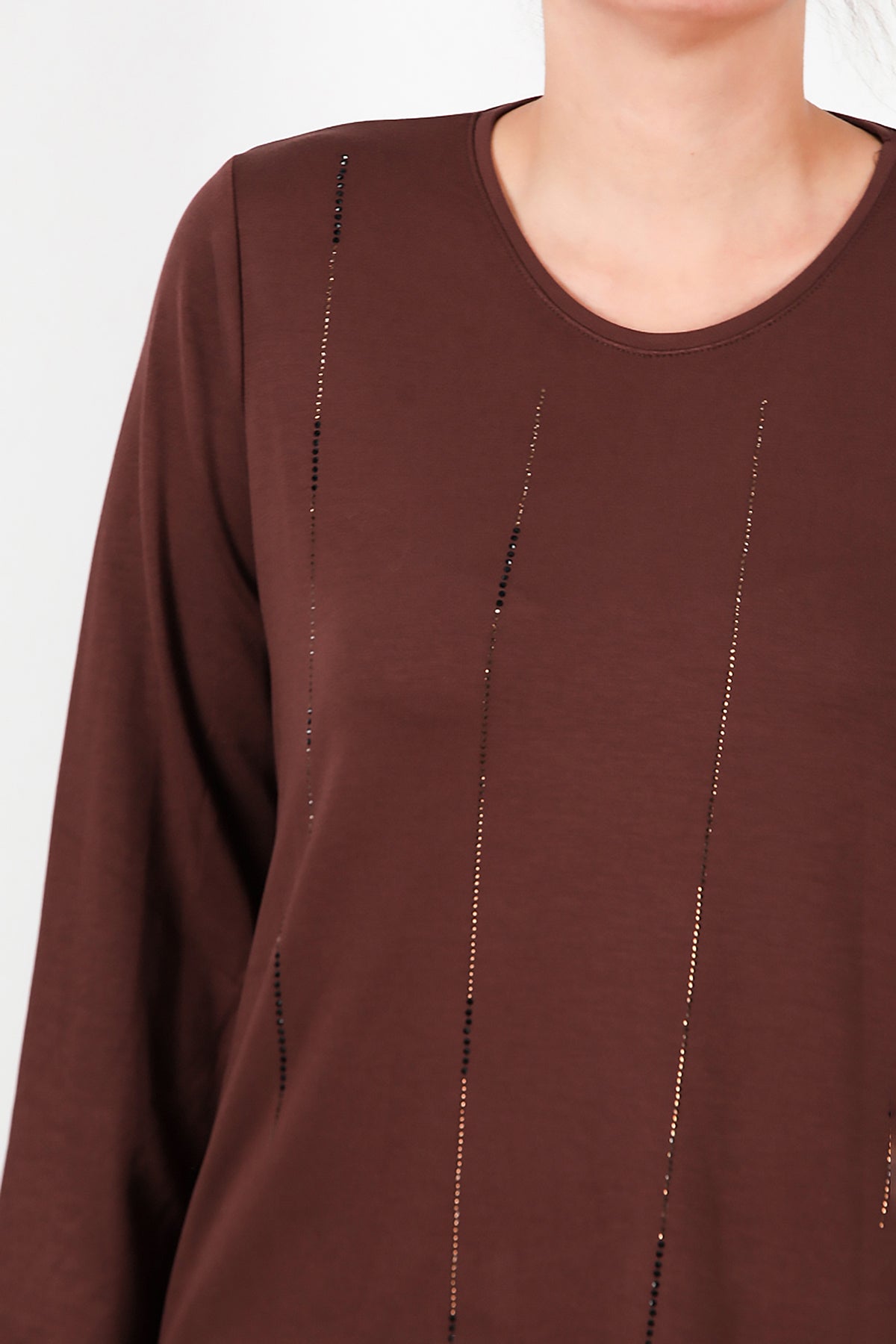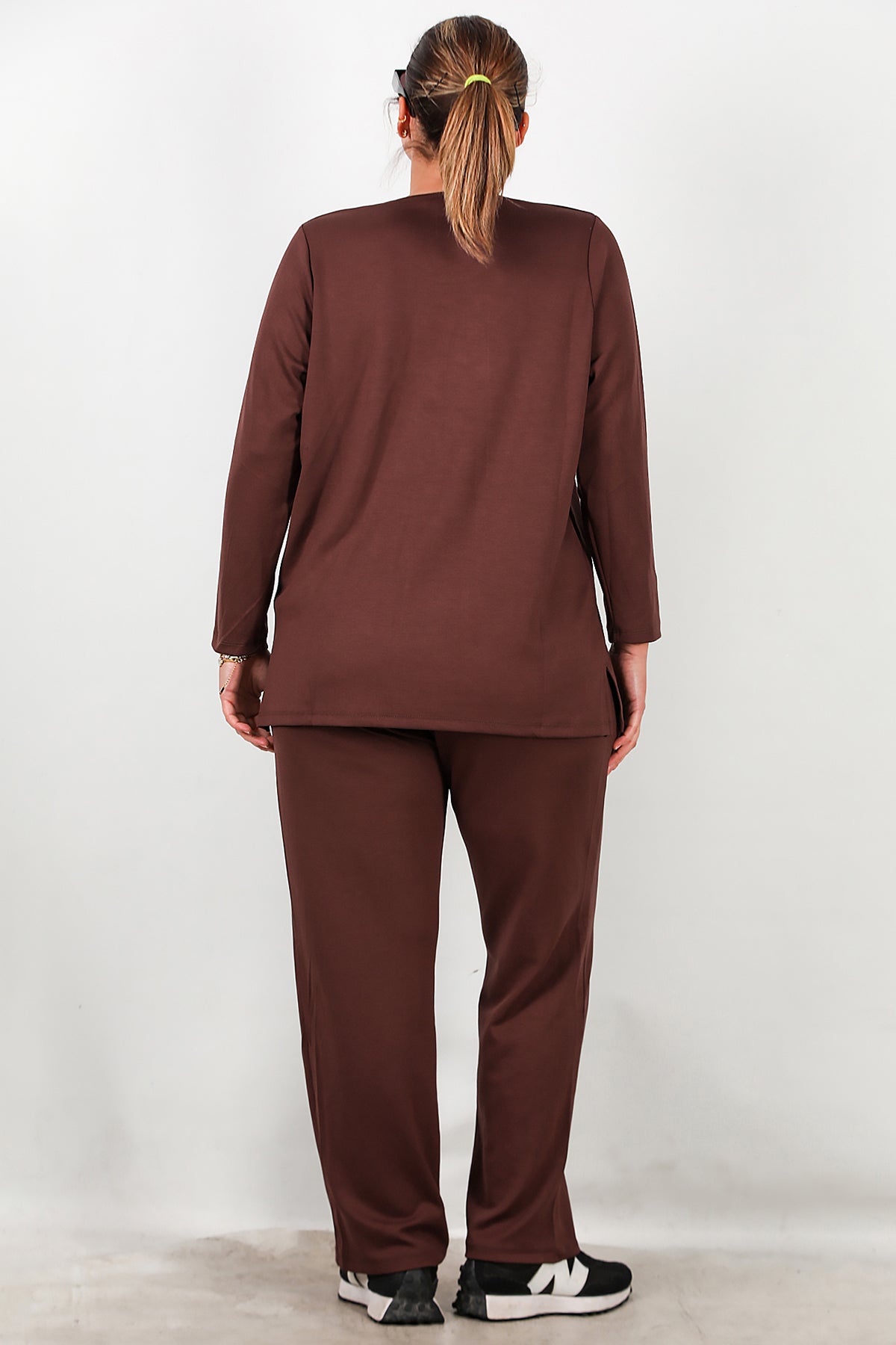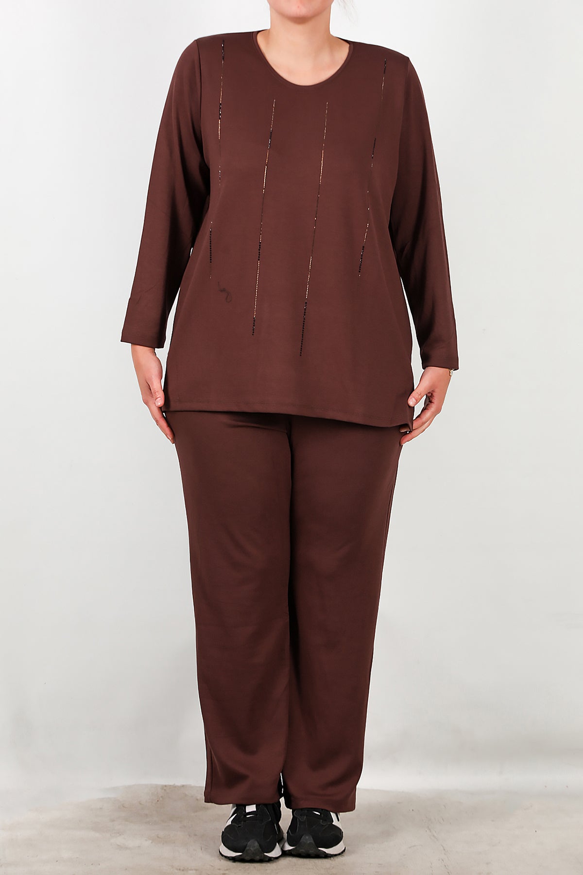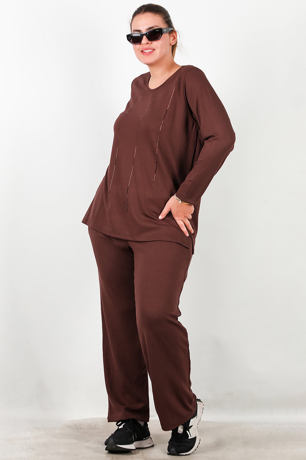 Büyük Beden Önü Taş İşlemeli Takım Kahverengi