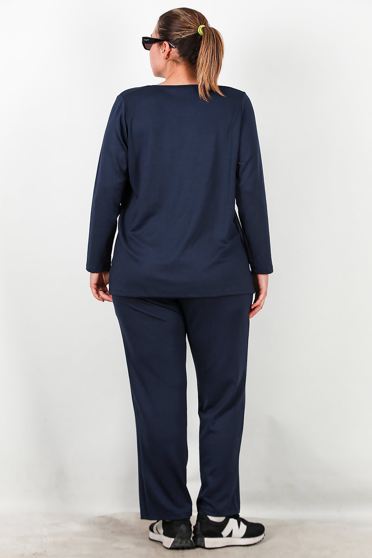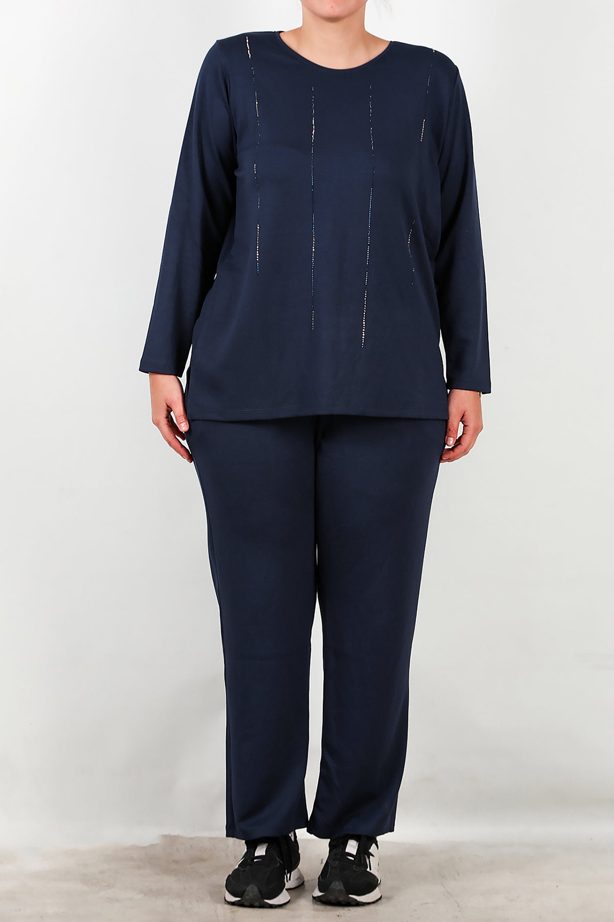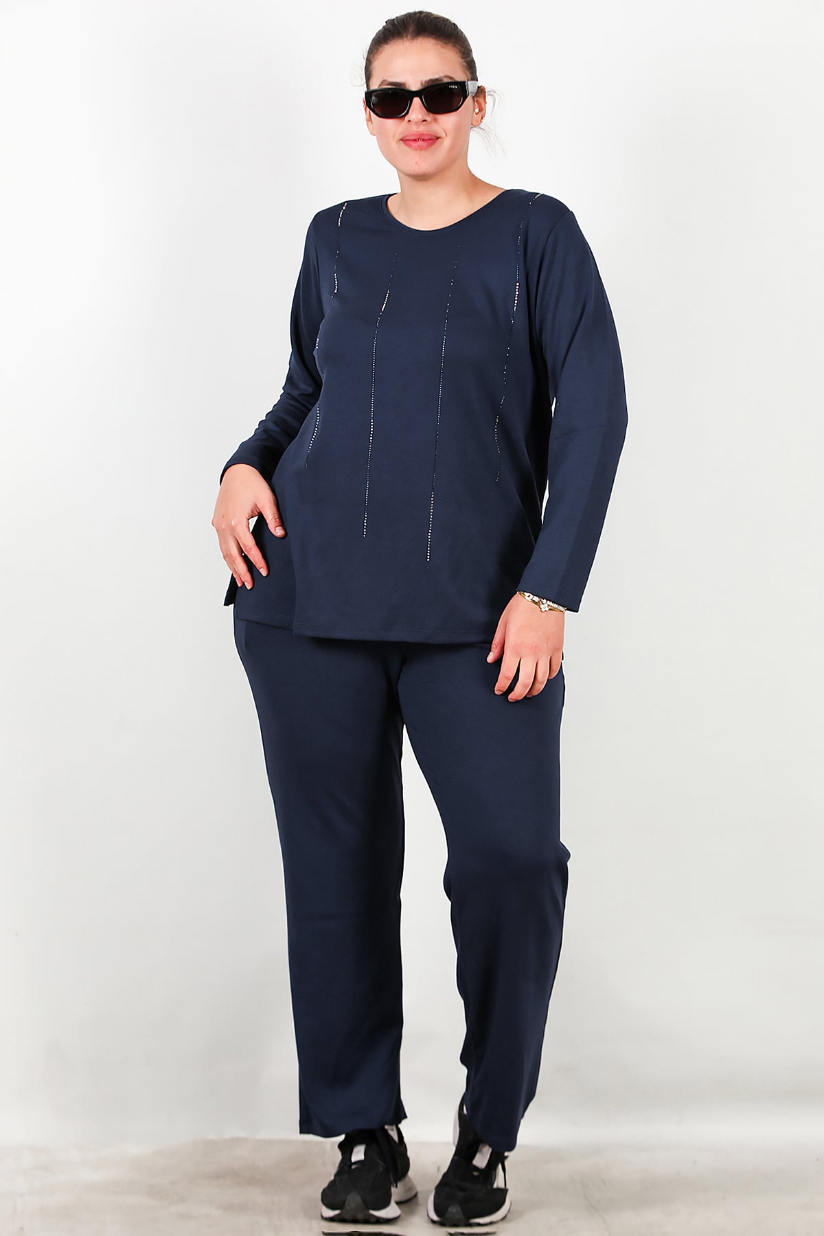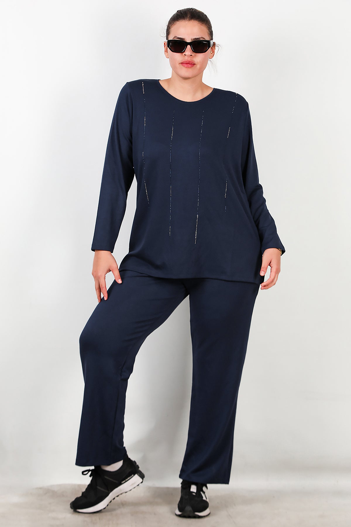 Büyük Beden Önü Taş İşlemeli Takım Lacivert