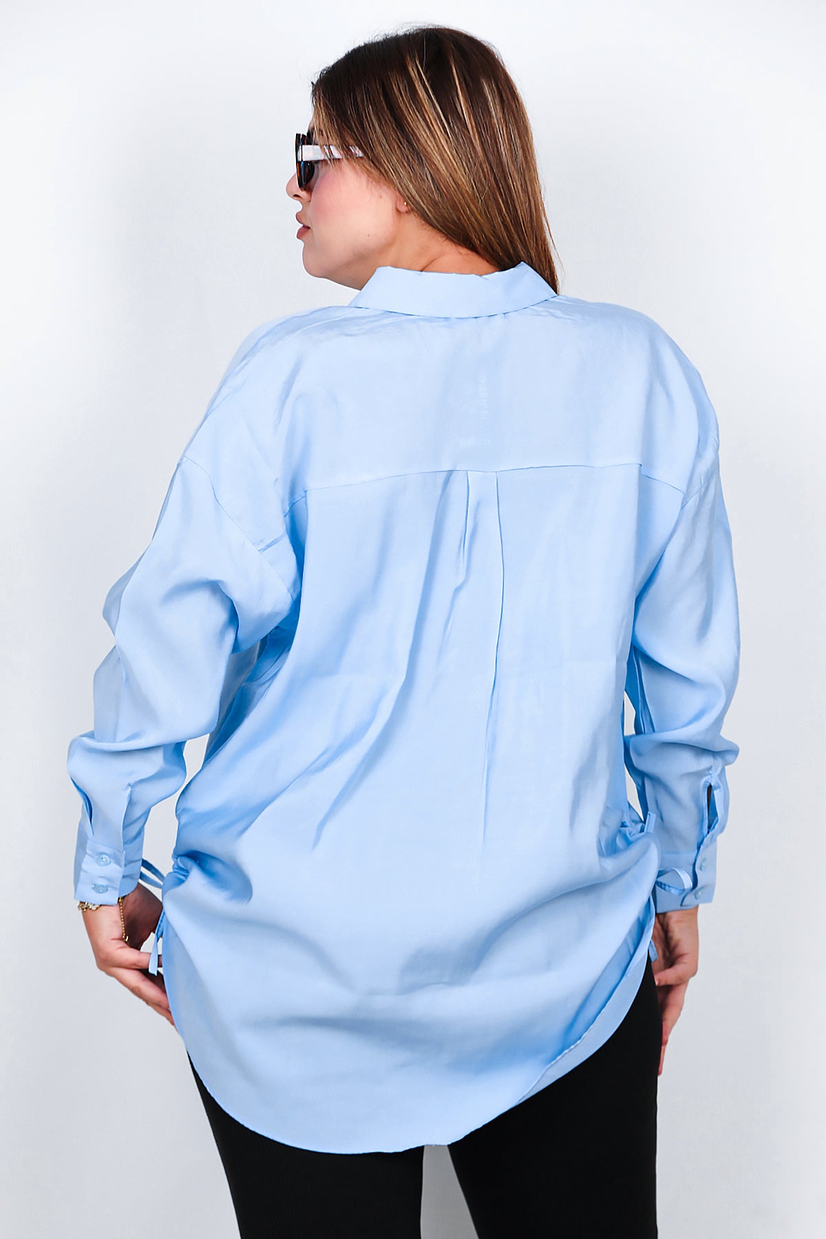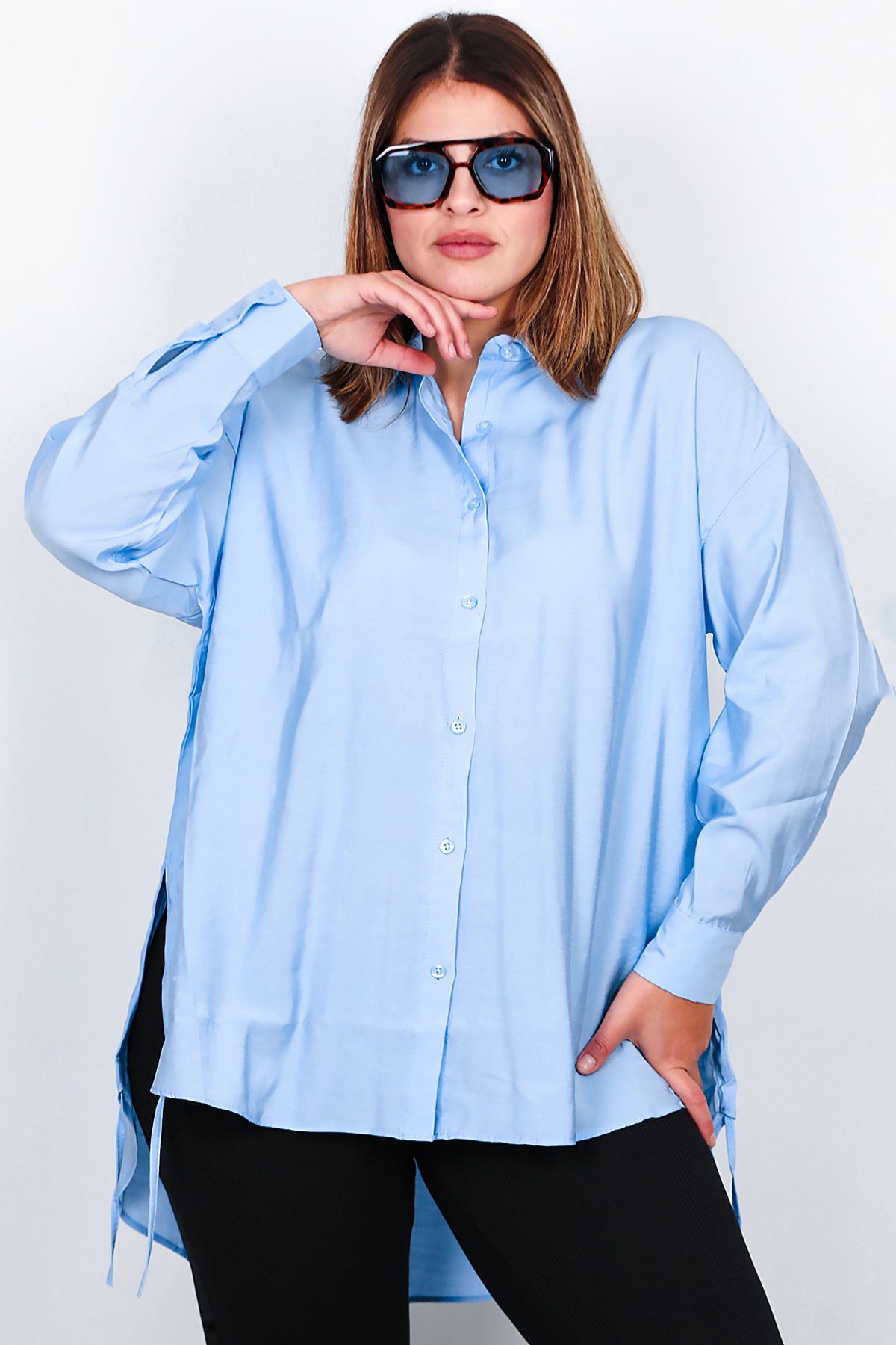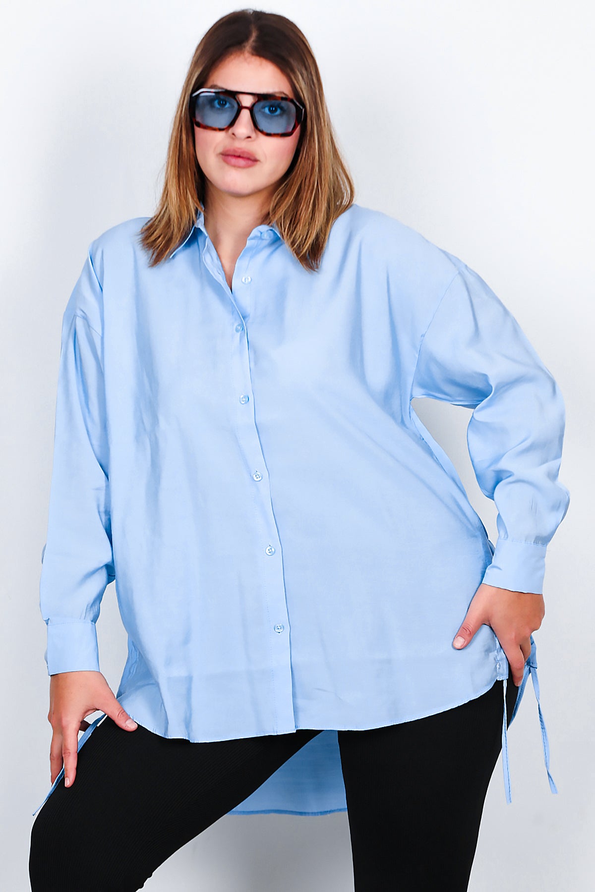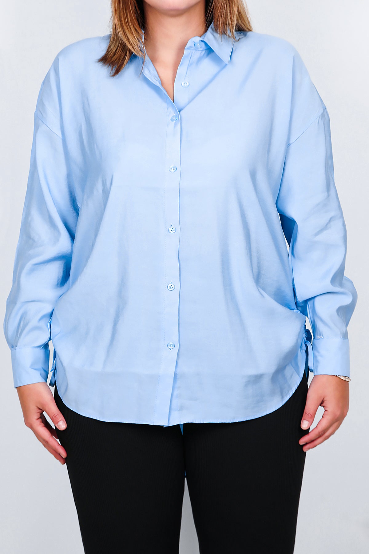 Büyük Beden Oversize Yan Bağcıklı Gömlek Buz Mavi