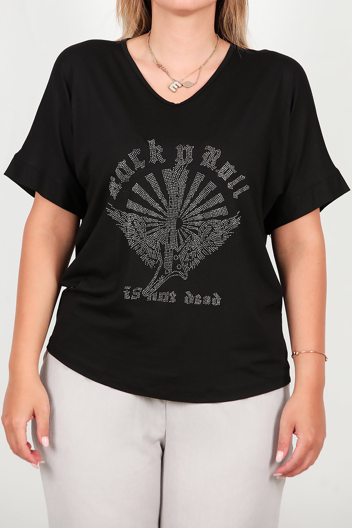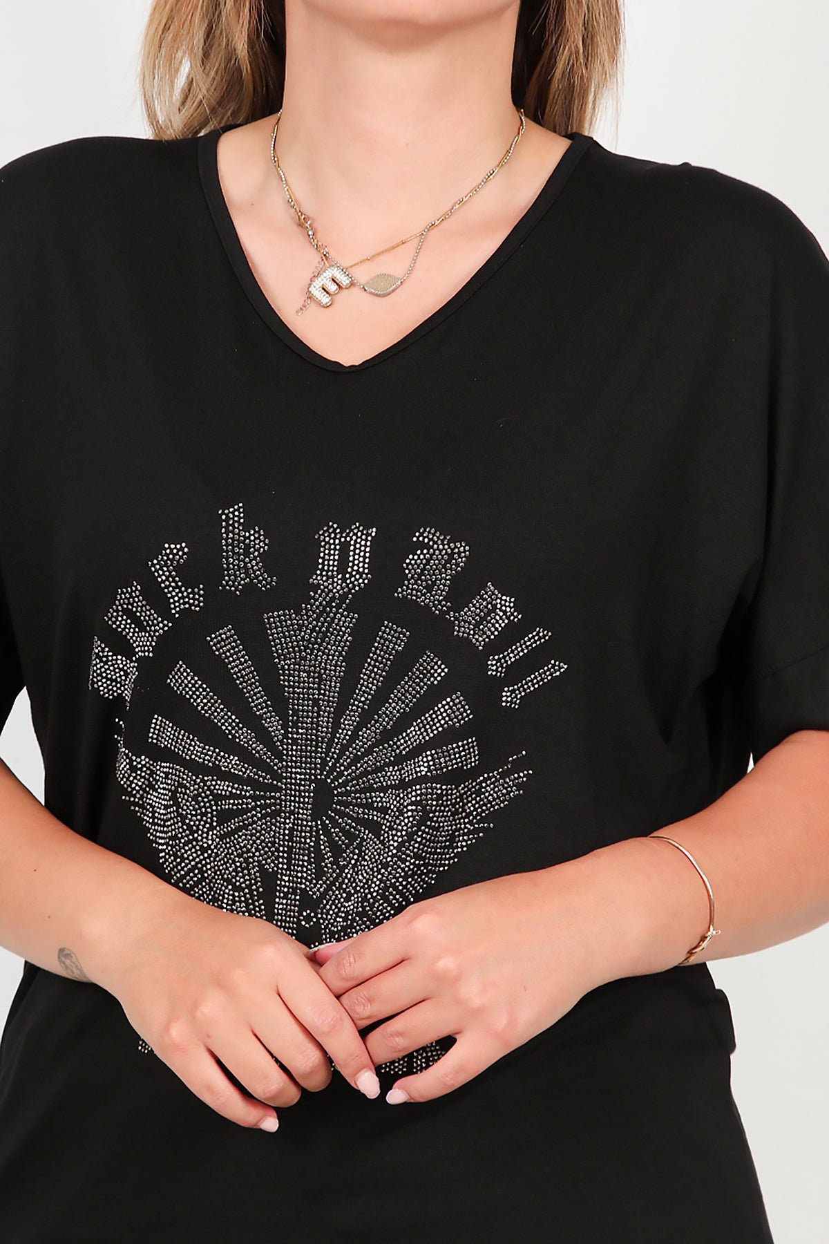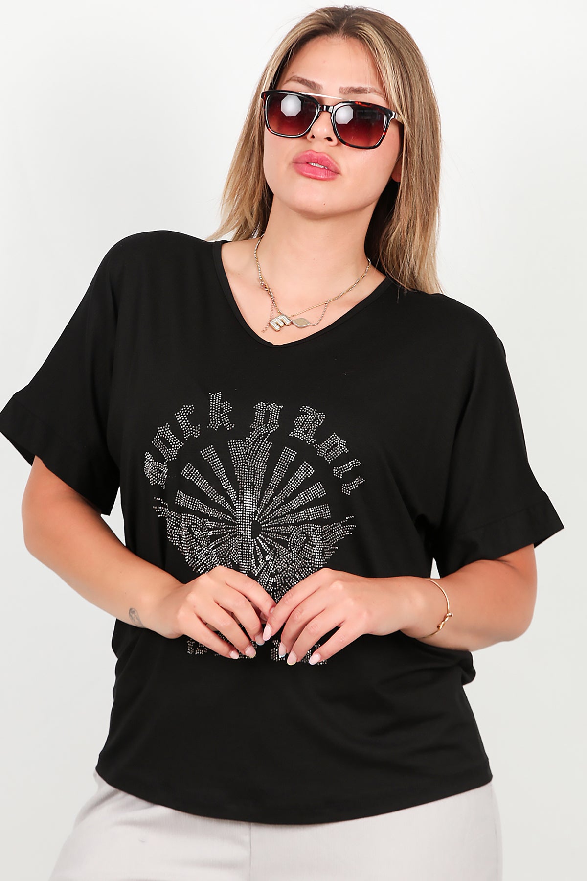 Büyük Beden Taş İşlemeli Bluz Siyah