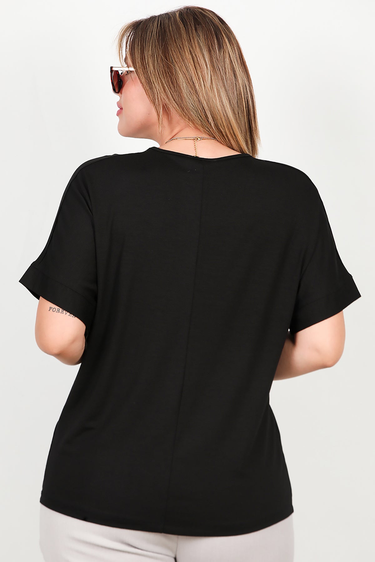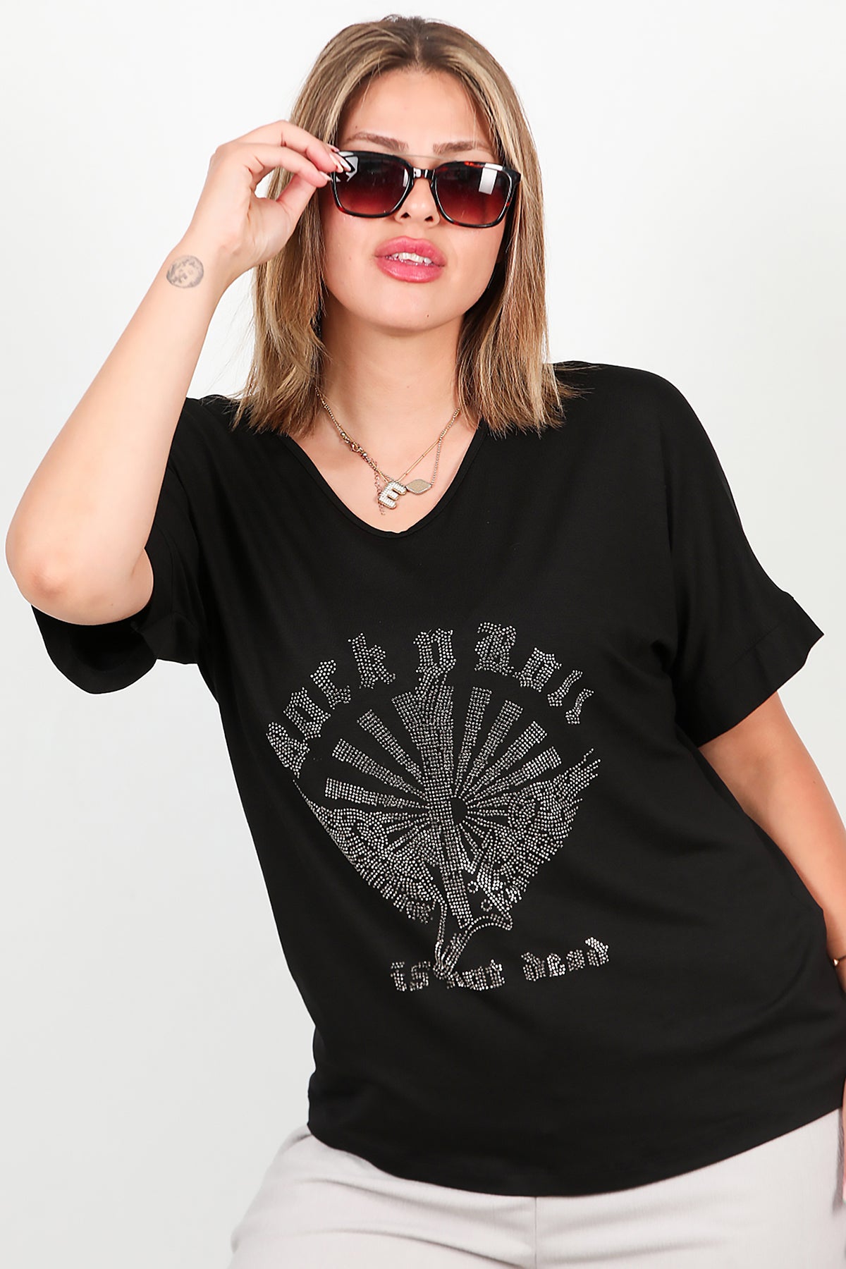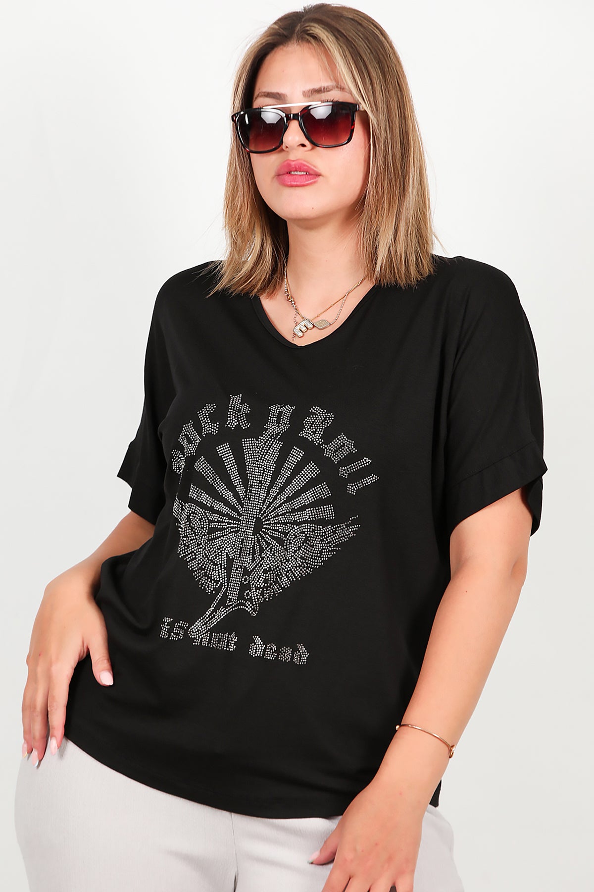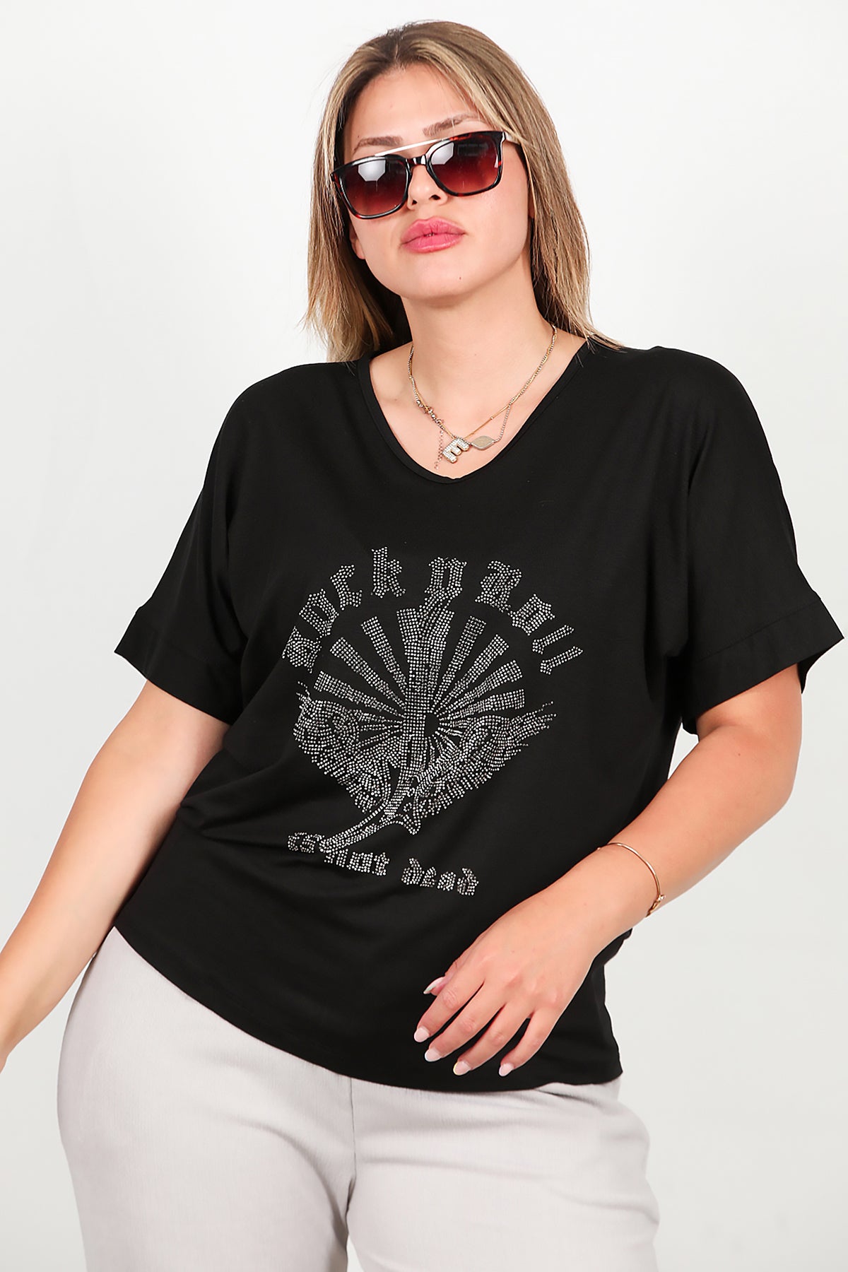 Büyük Beden Taş İşlemeli Bluz Siyah