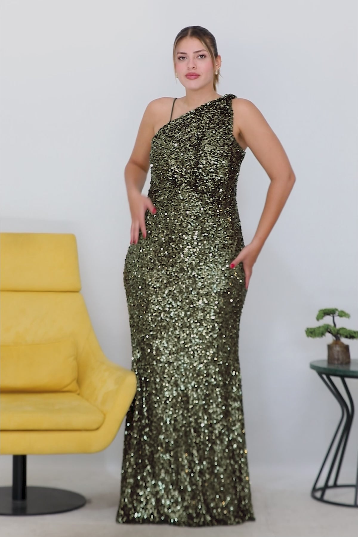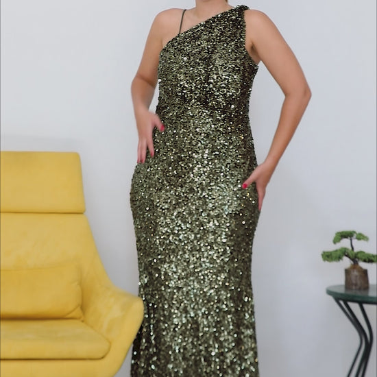Büyük Beden Tek Omuz Uzun Pullu Abiye Yeşil