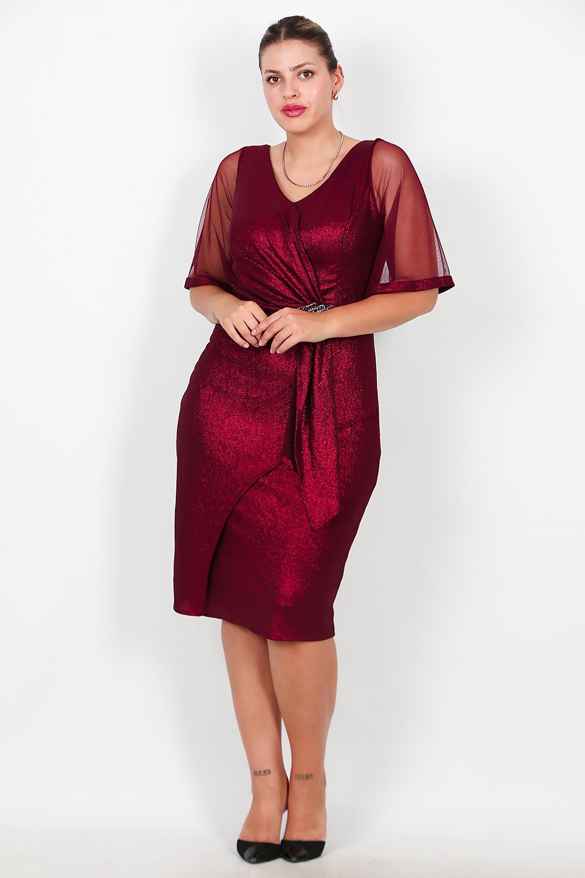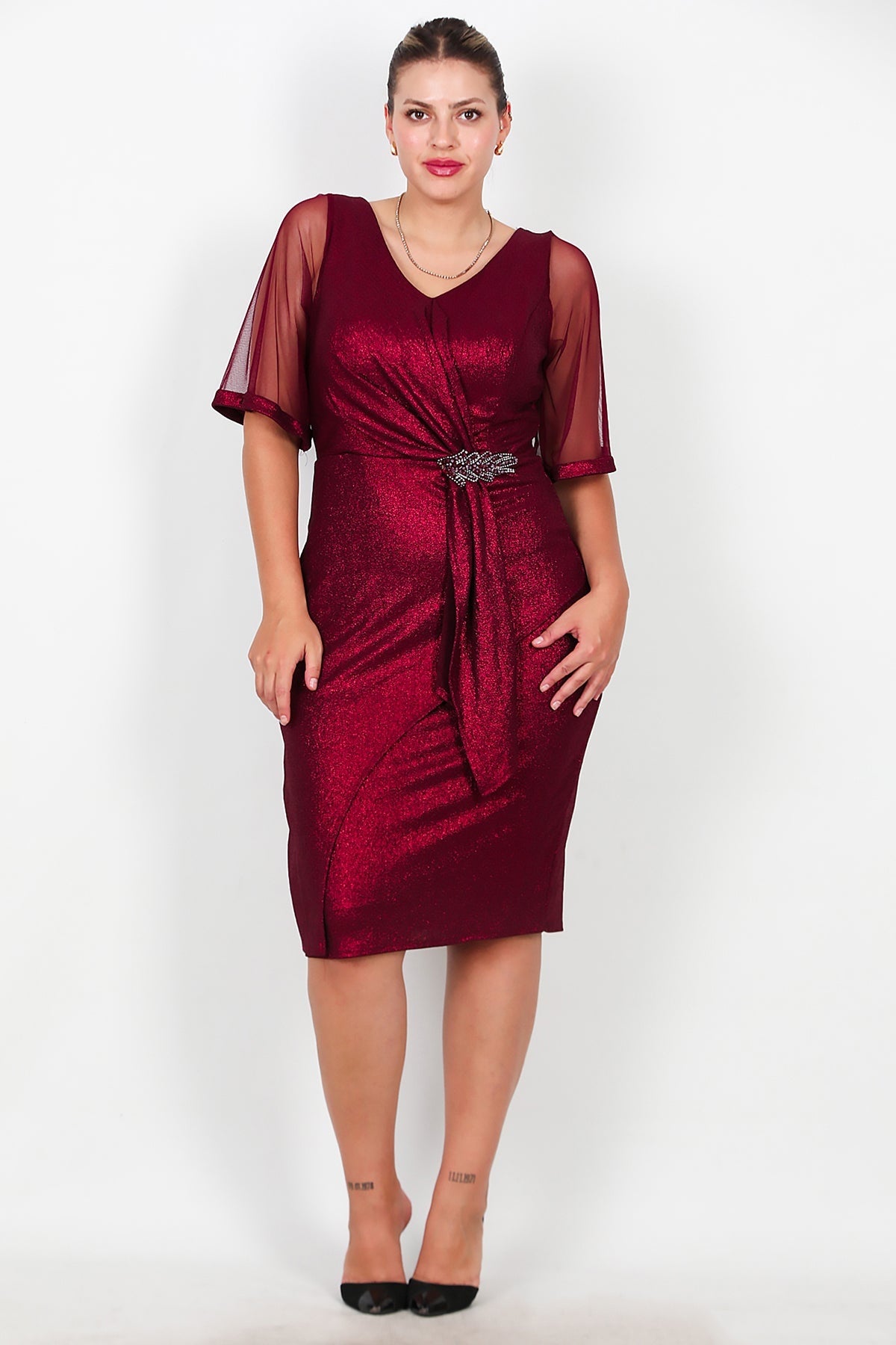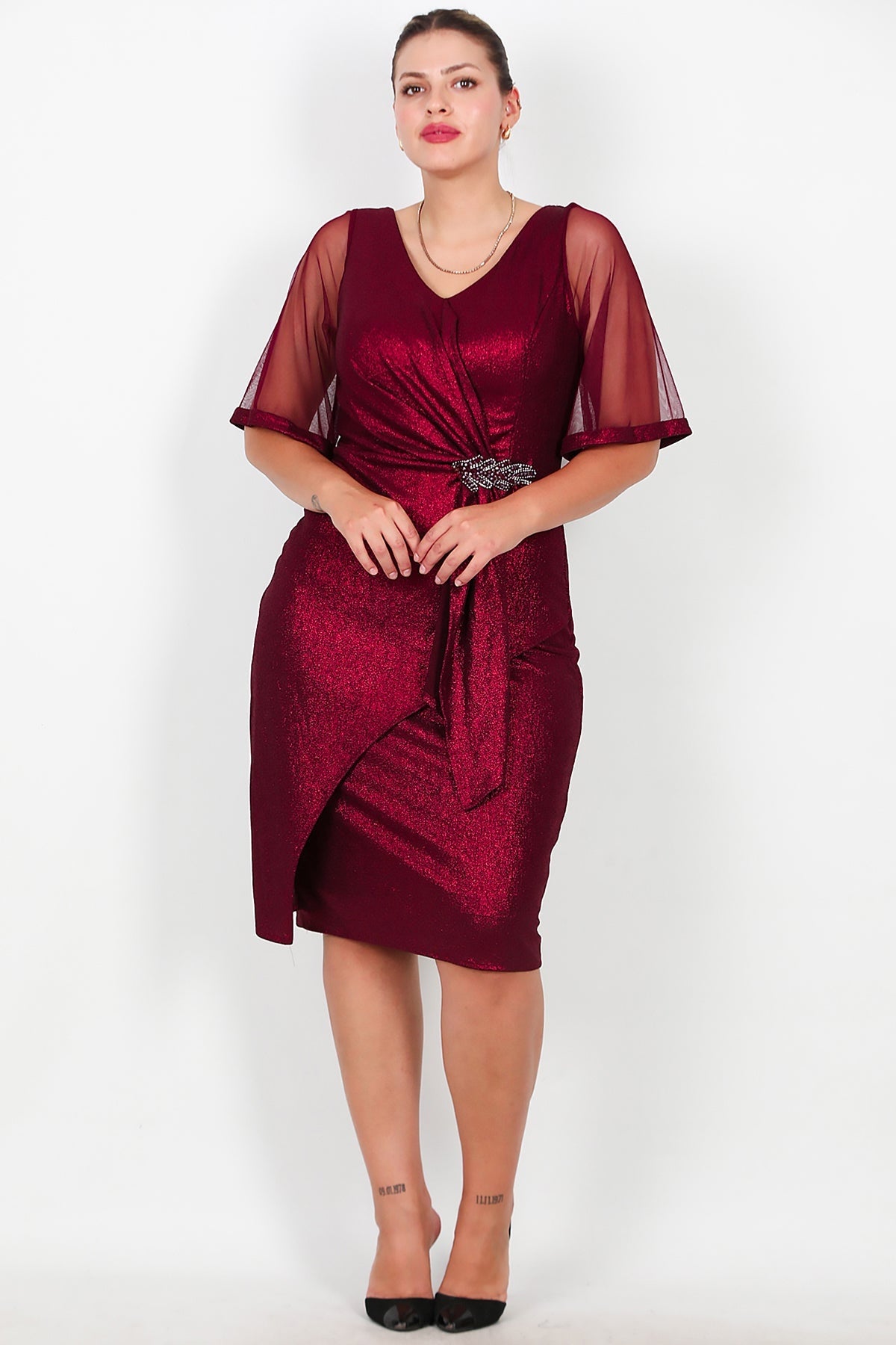 Büyük Beden Tül Kol Bel Aksesuarlı Midi Boy Abiye Bordo