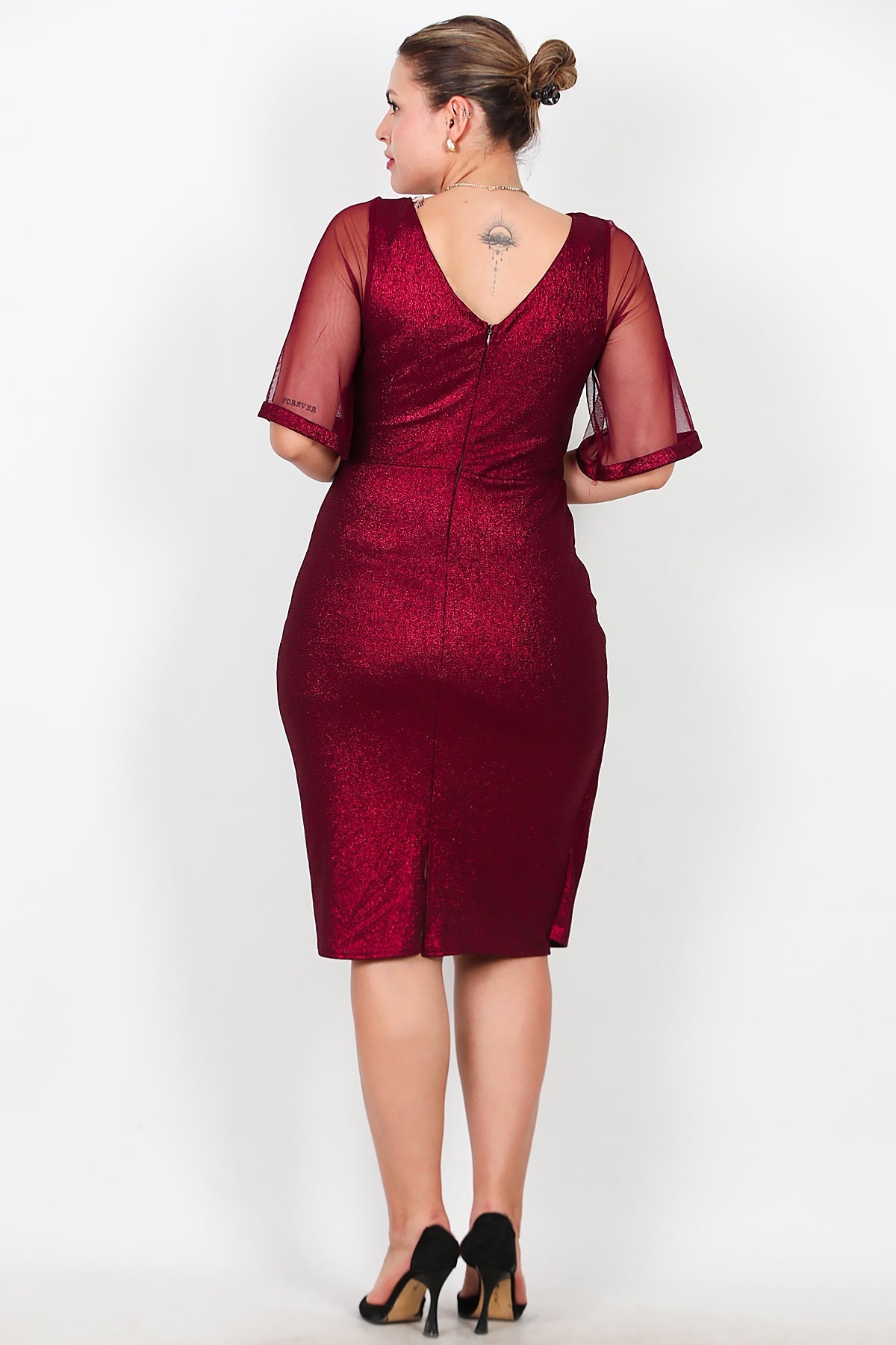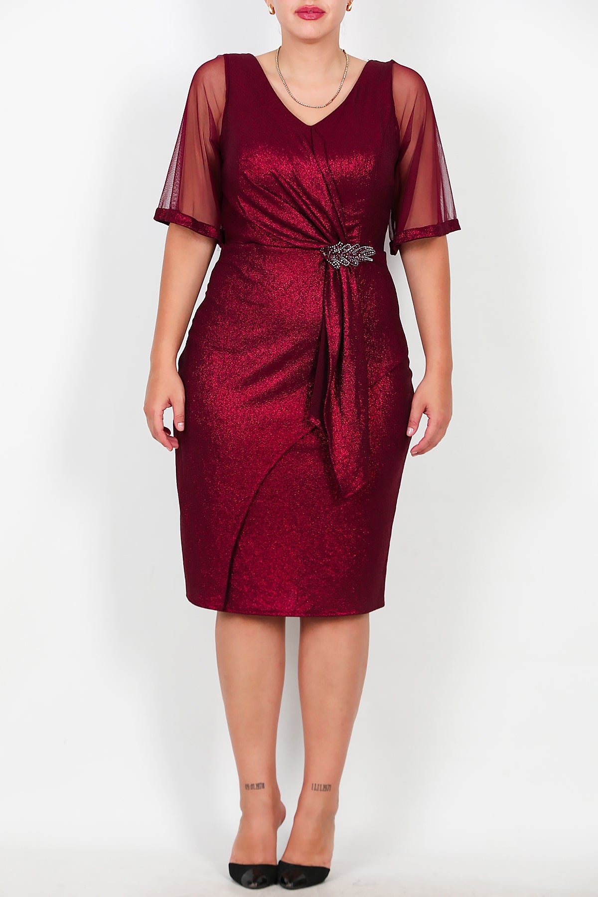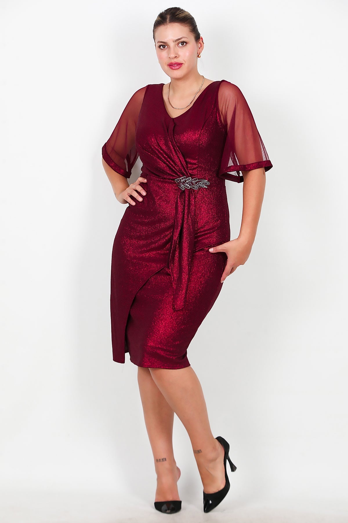 Büyük Beden Tül Kol Bel Aksesuarlı Midi Boy Abiye Bordo