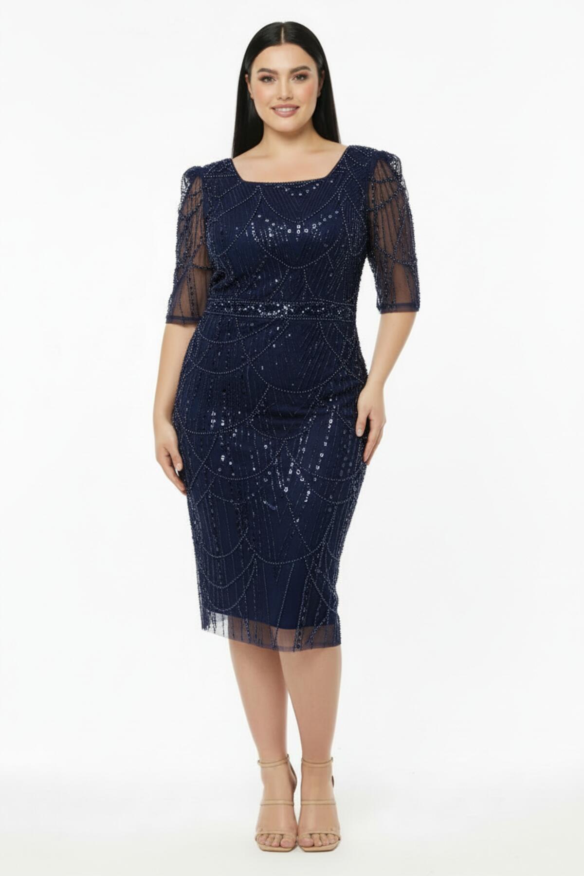 Büyük Beden Uzun Kol Kare Yaka Pullu Boncuklu Abiye Lacivert
