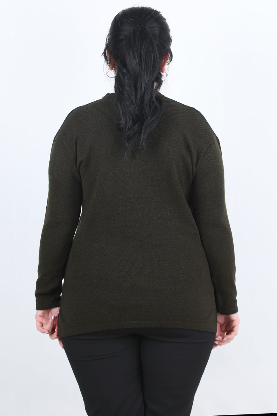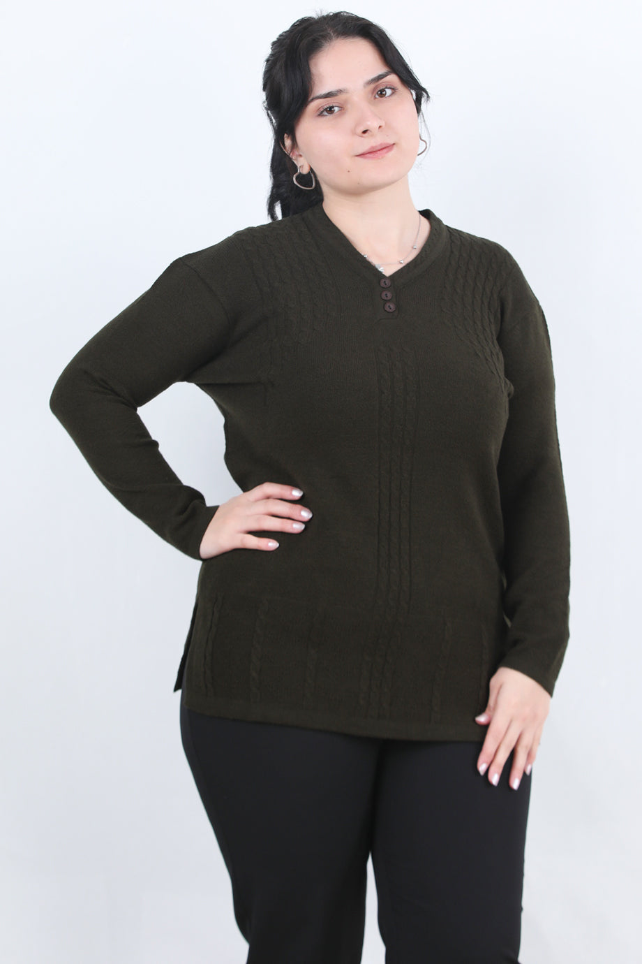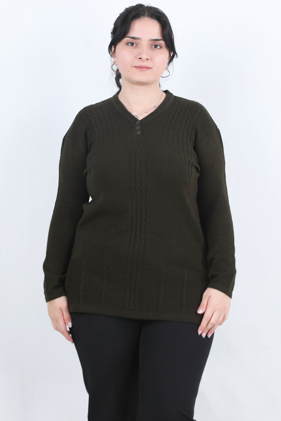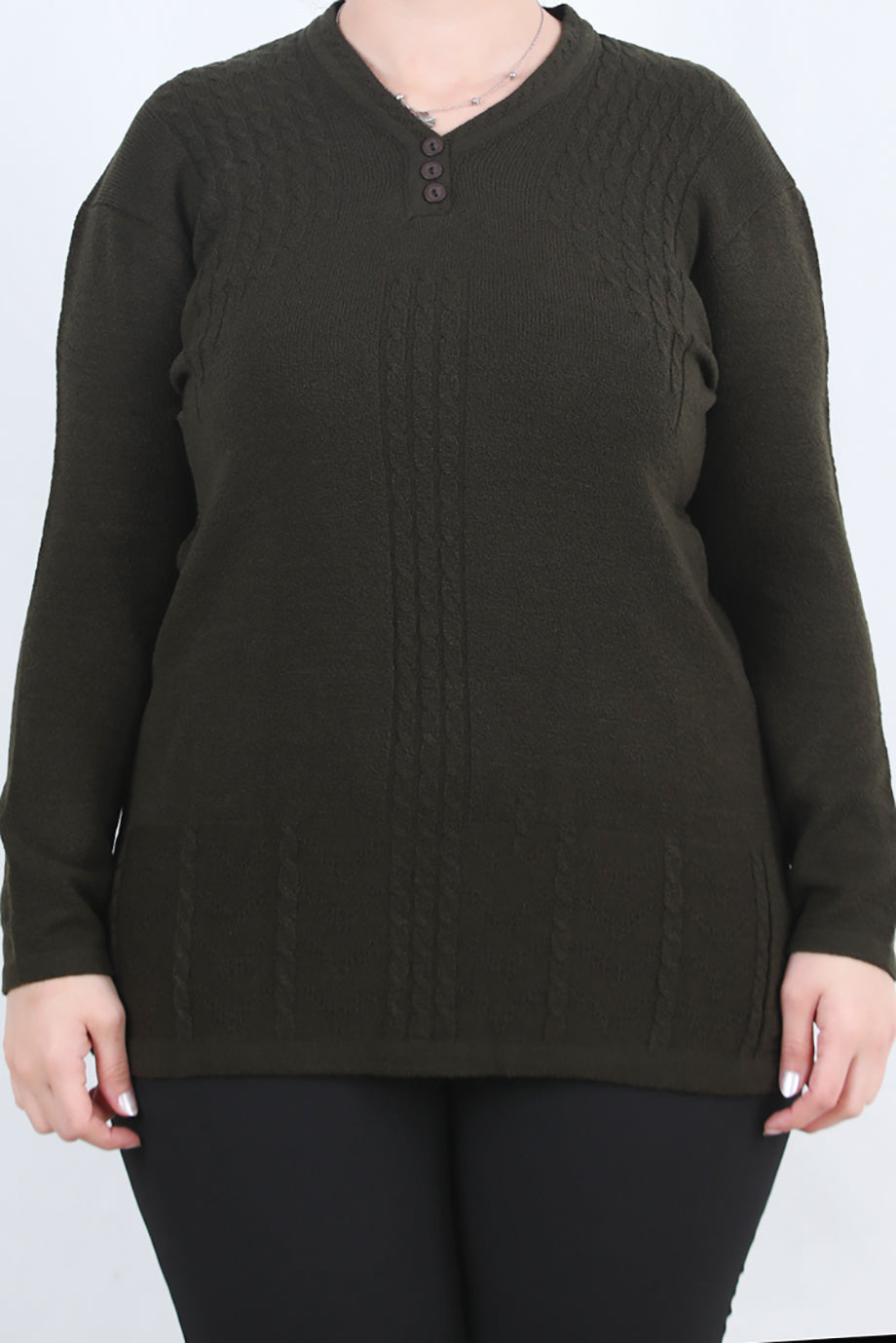 Curvyn Büyük Beden V Yaka 3 Düğmeli Bluz Haki