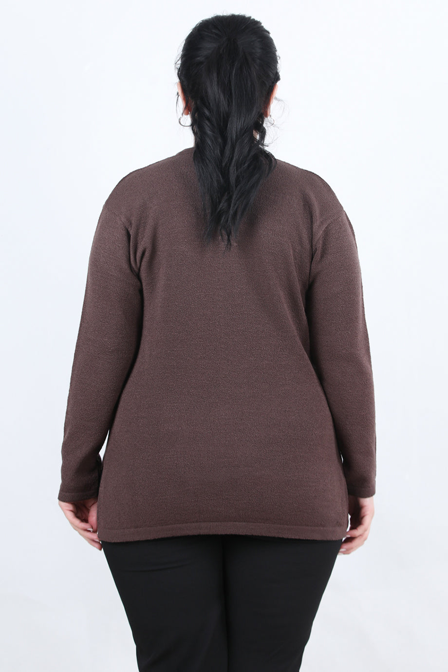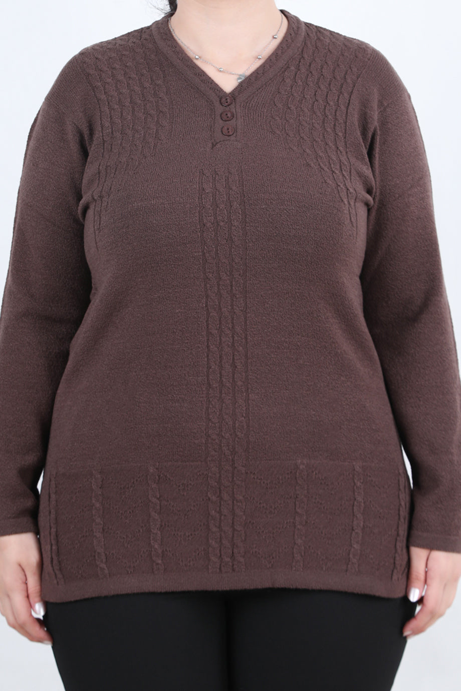 Curvyn Büyük Beden V Yaka 3 Düğmeli Bluz Kahverengi