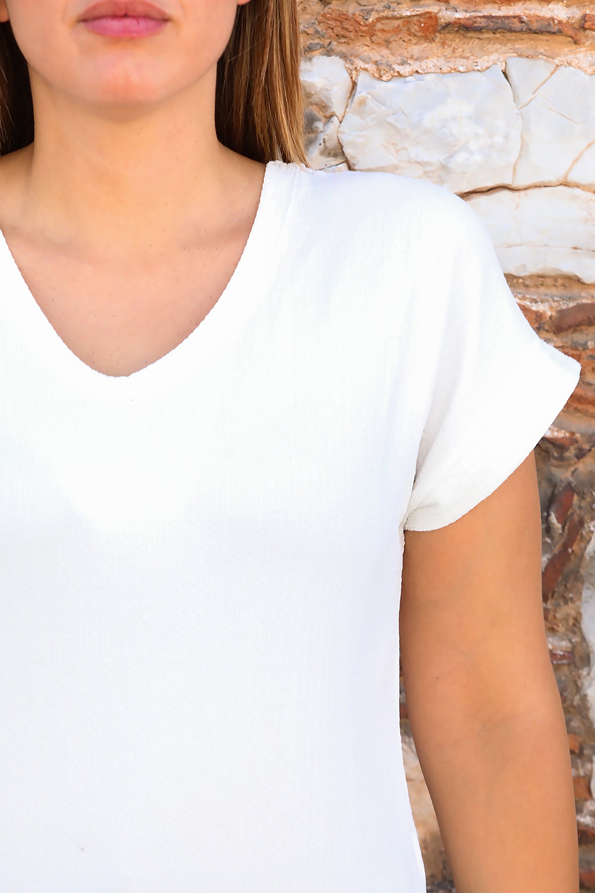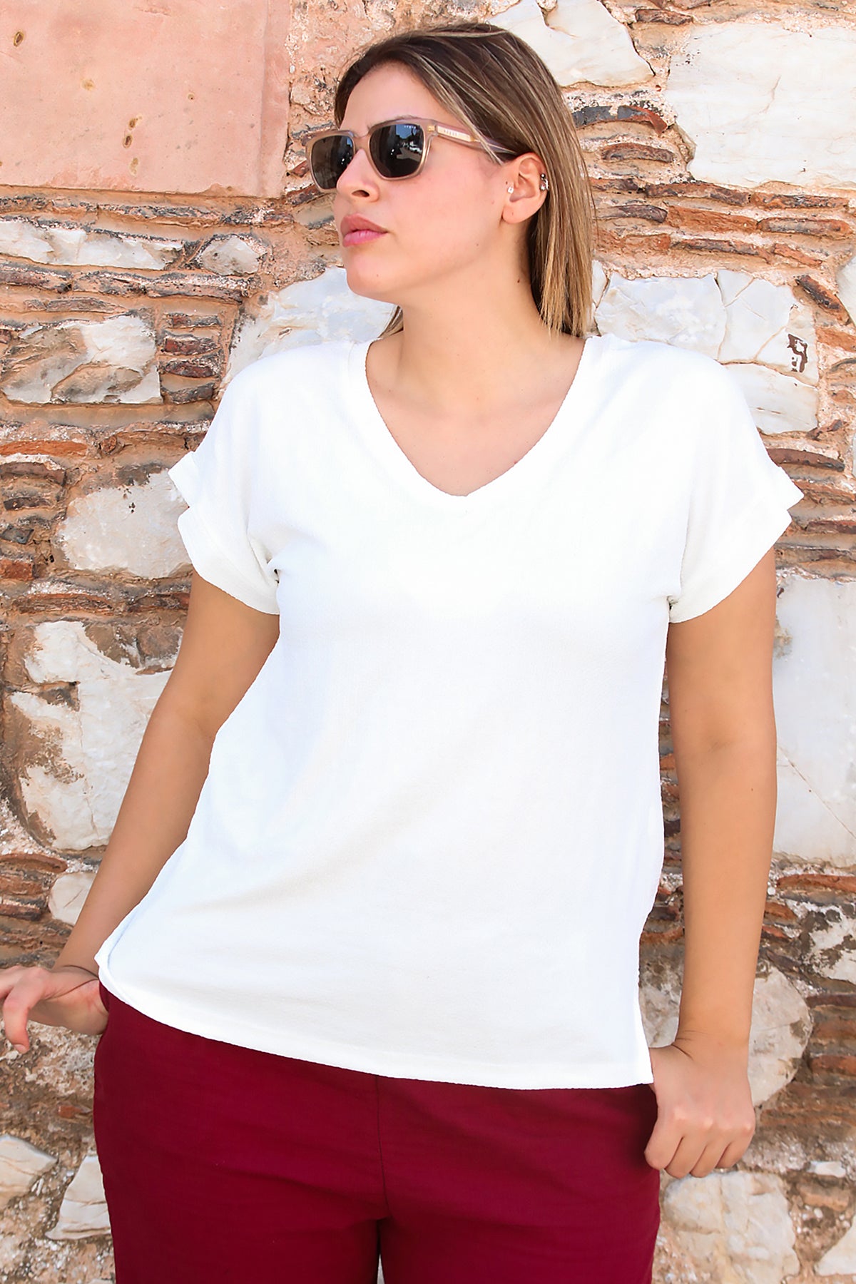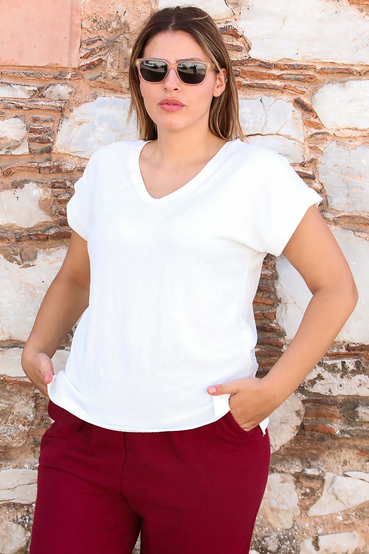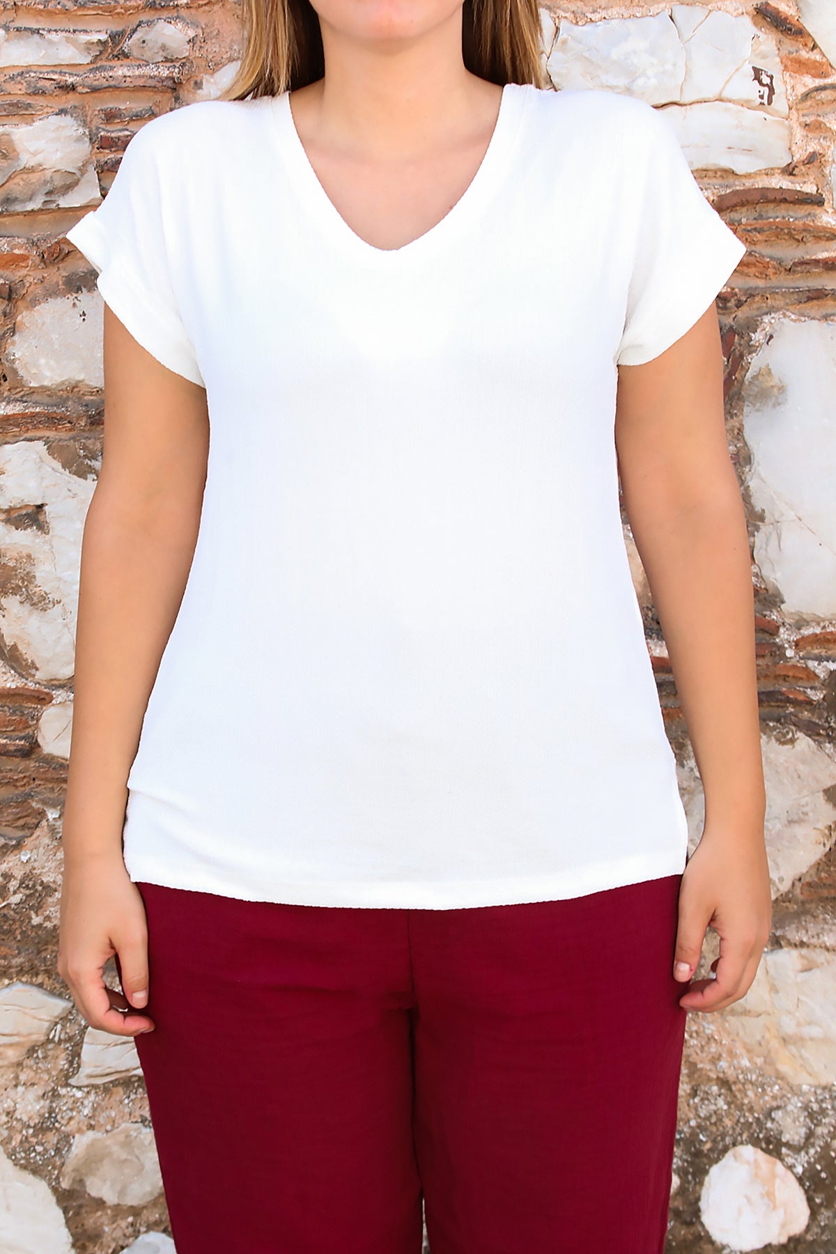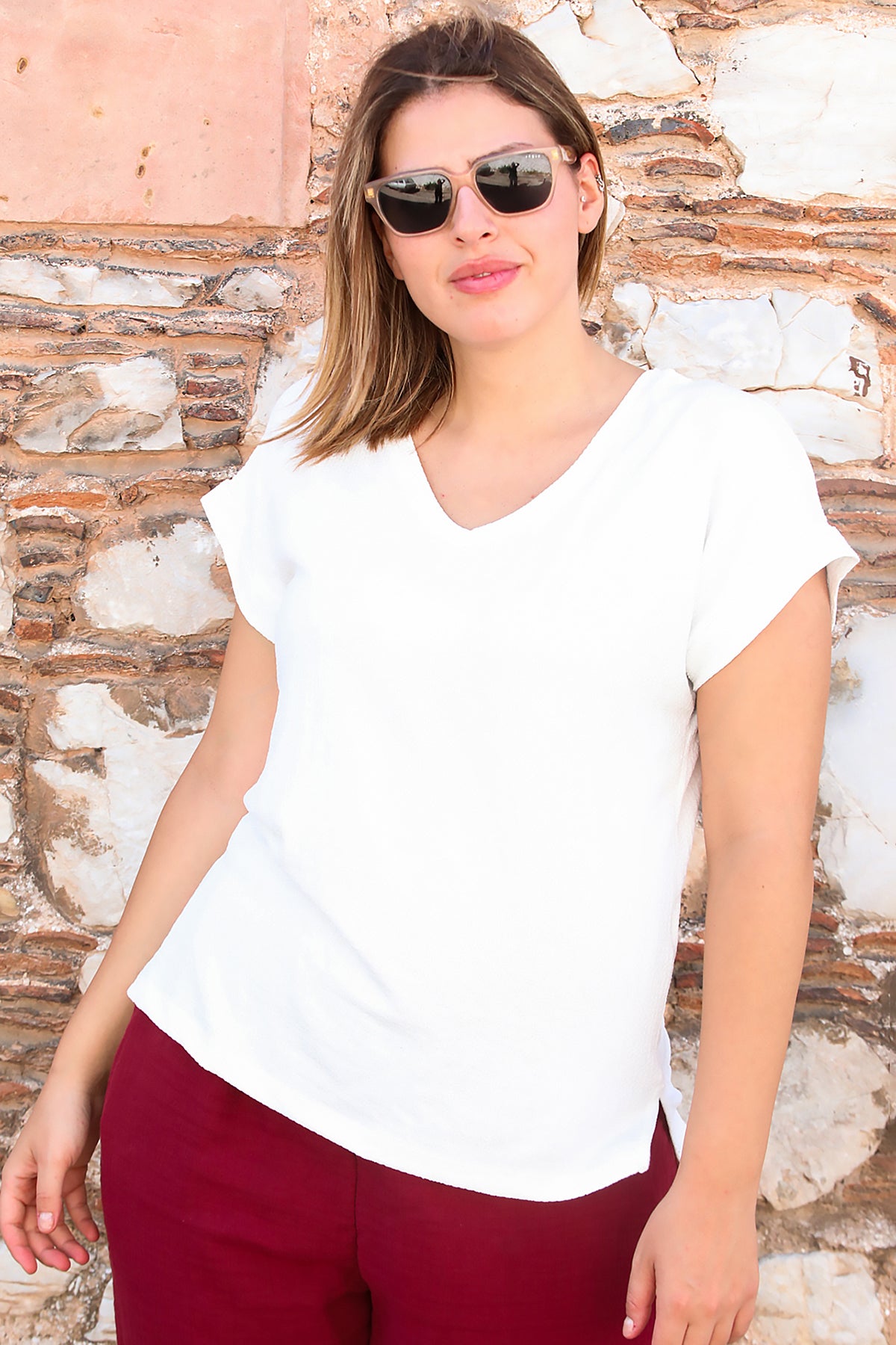 Büyük Beden V Yaka Bürümcük Bluz Ekru