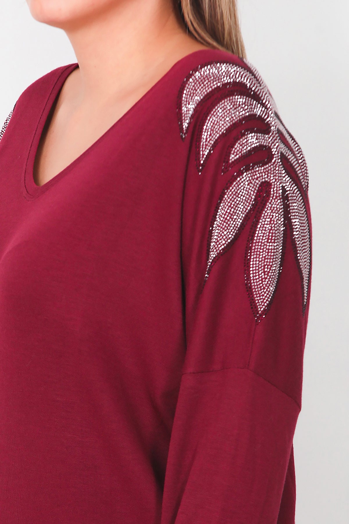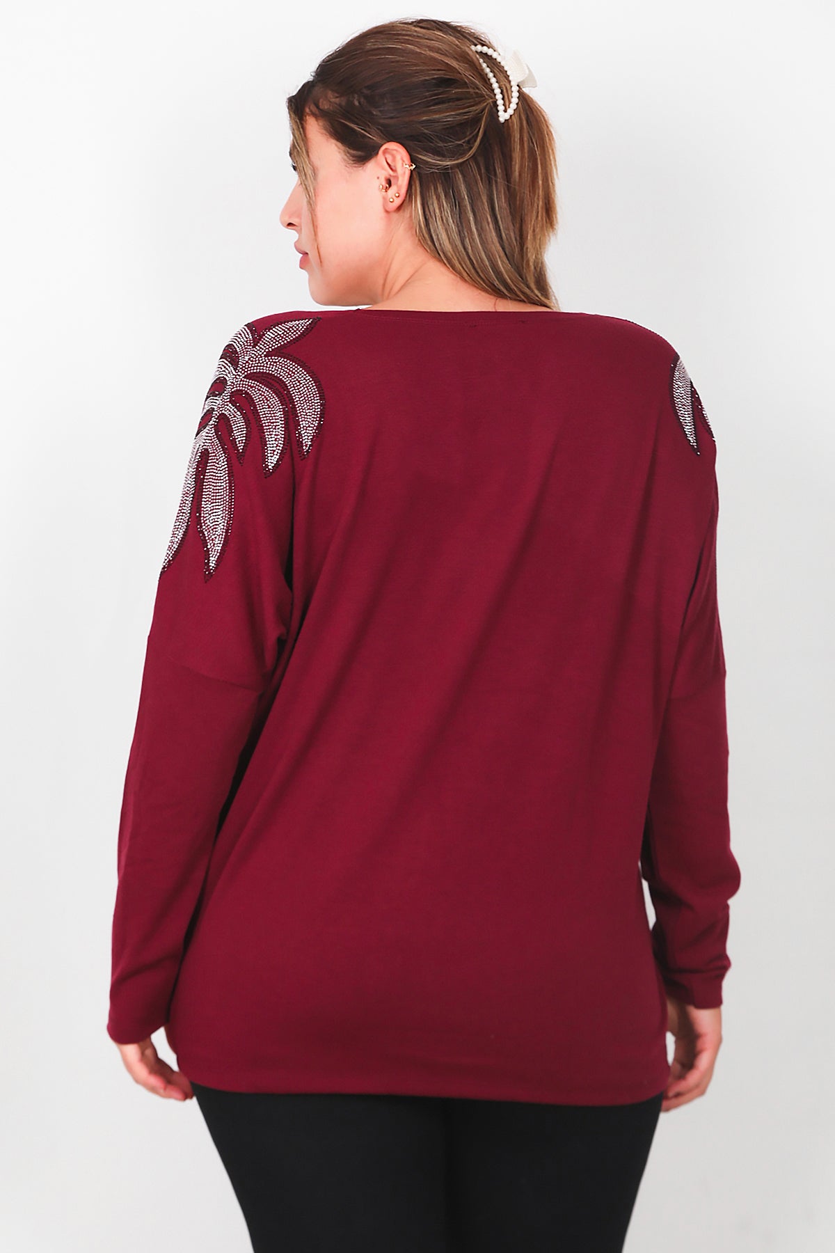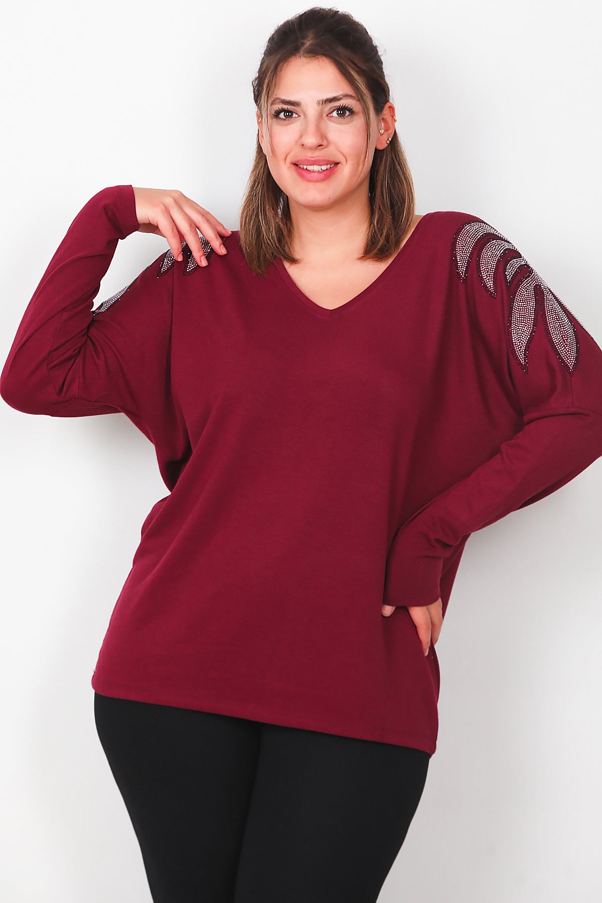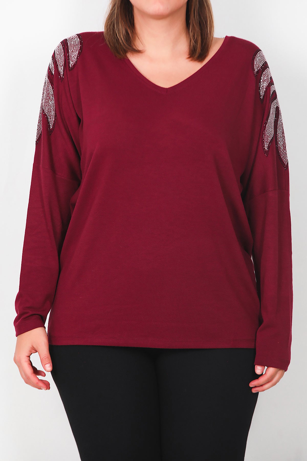 Büyük Beden V Yaka Önü Taşlı Uzun Kol Bluz Bordo
