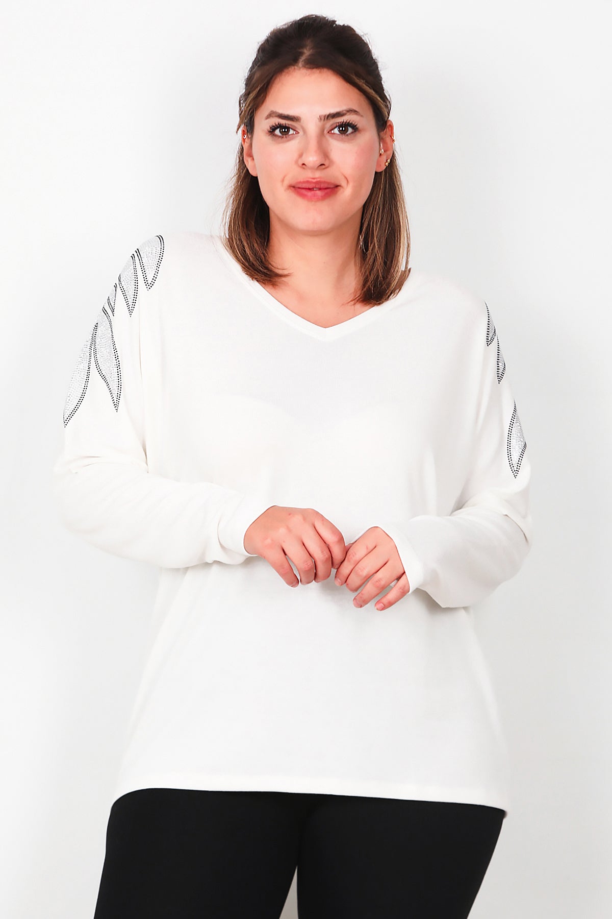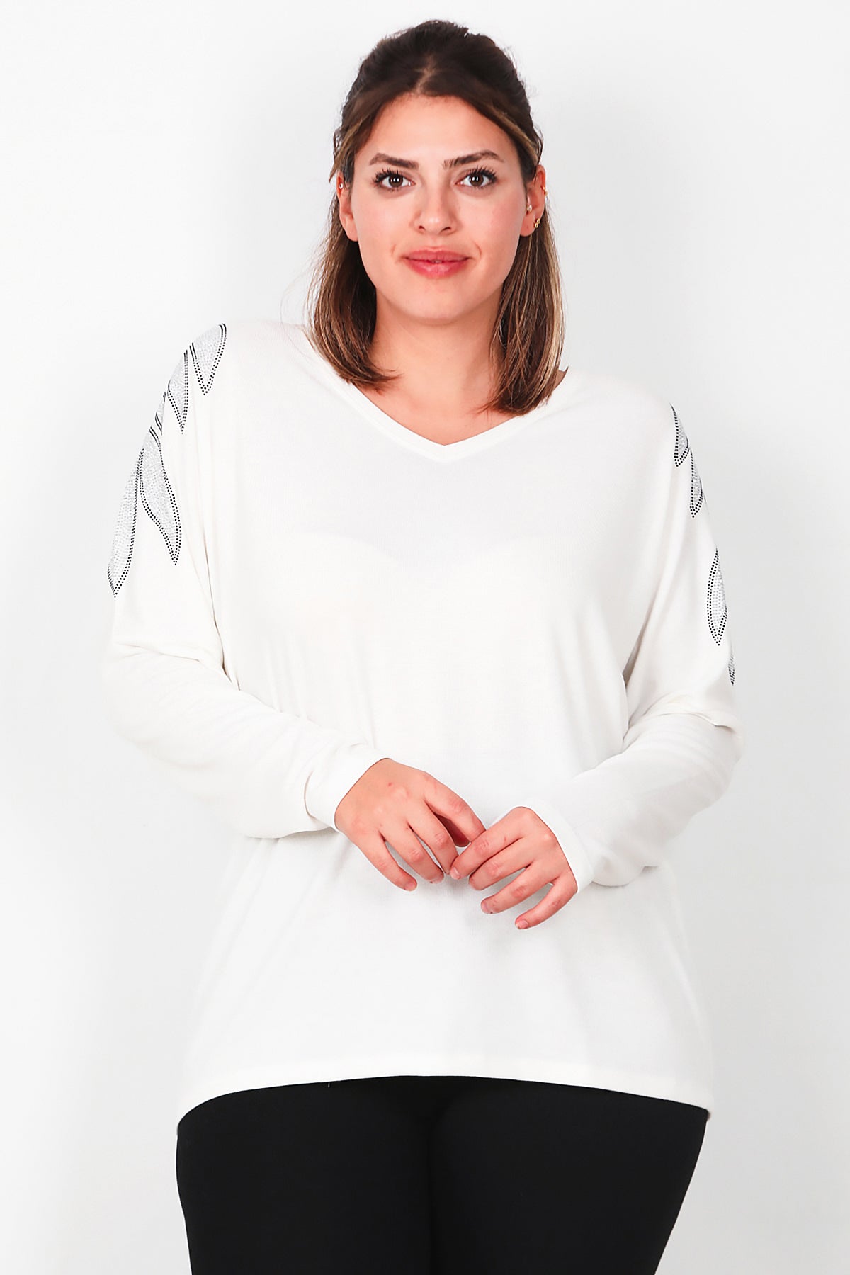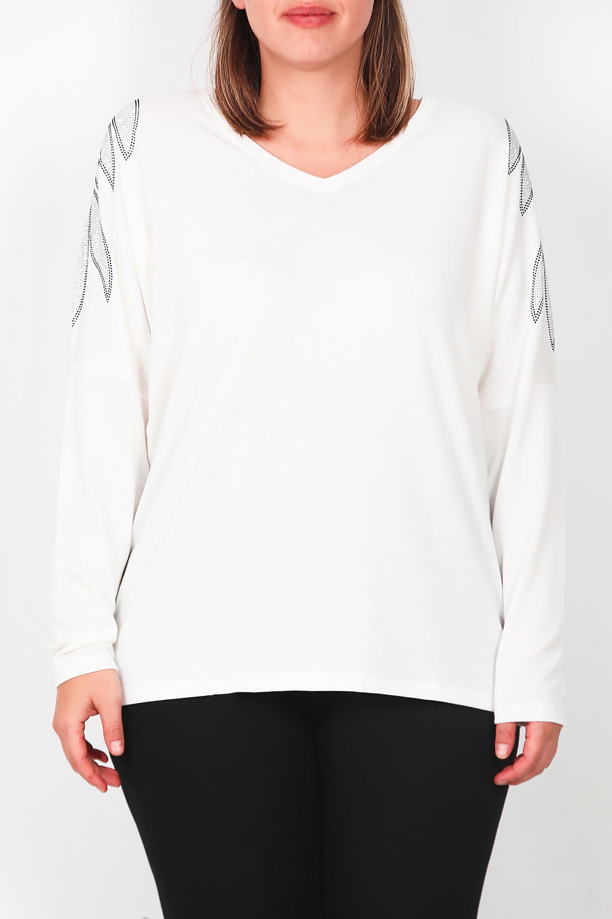Büyük Beden V Yaka Önü Taşlı Uzun Kol Bluz Ekru