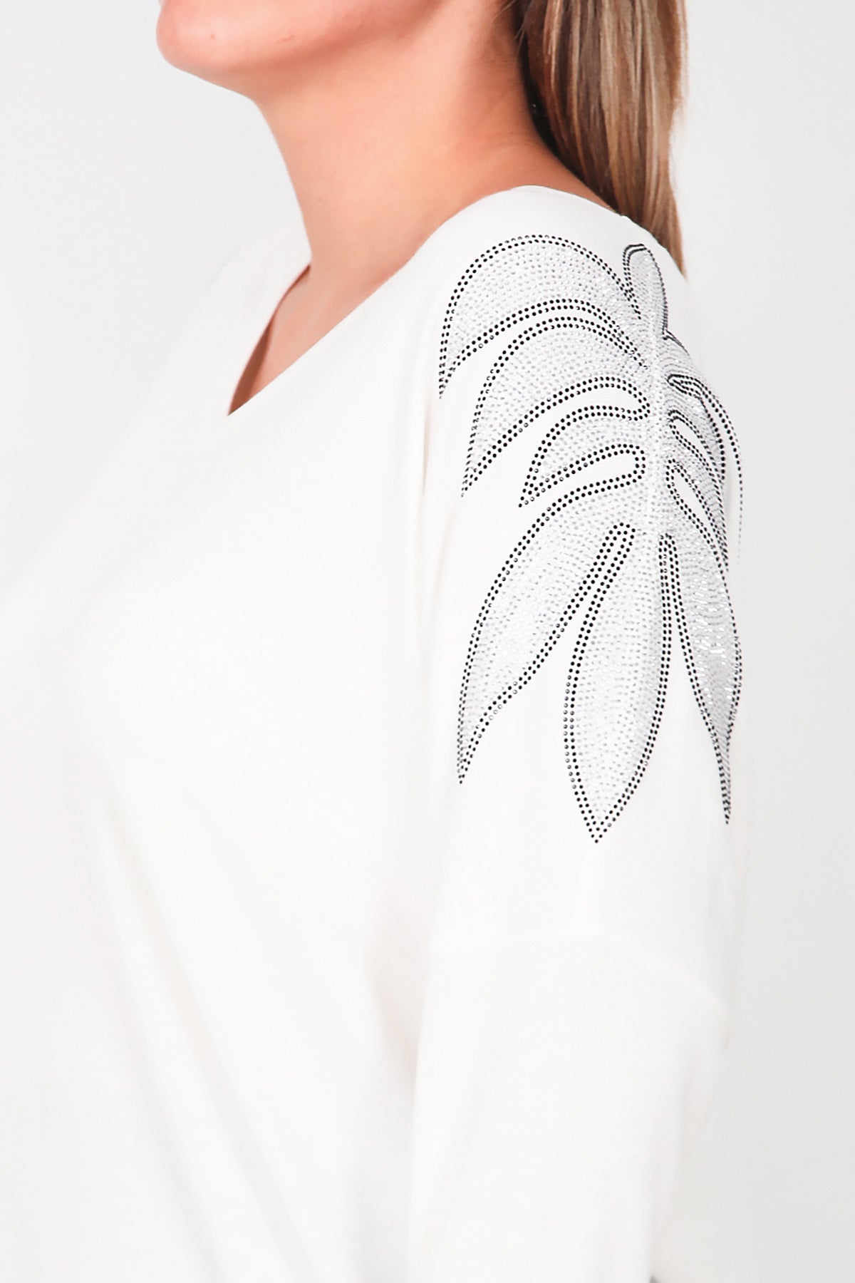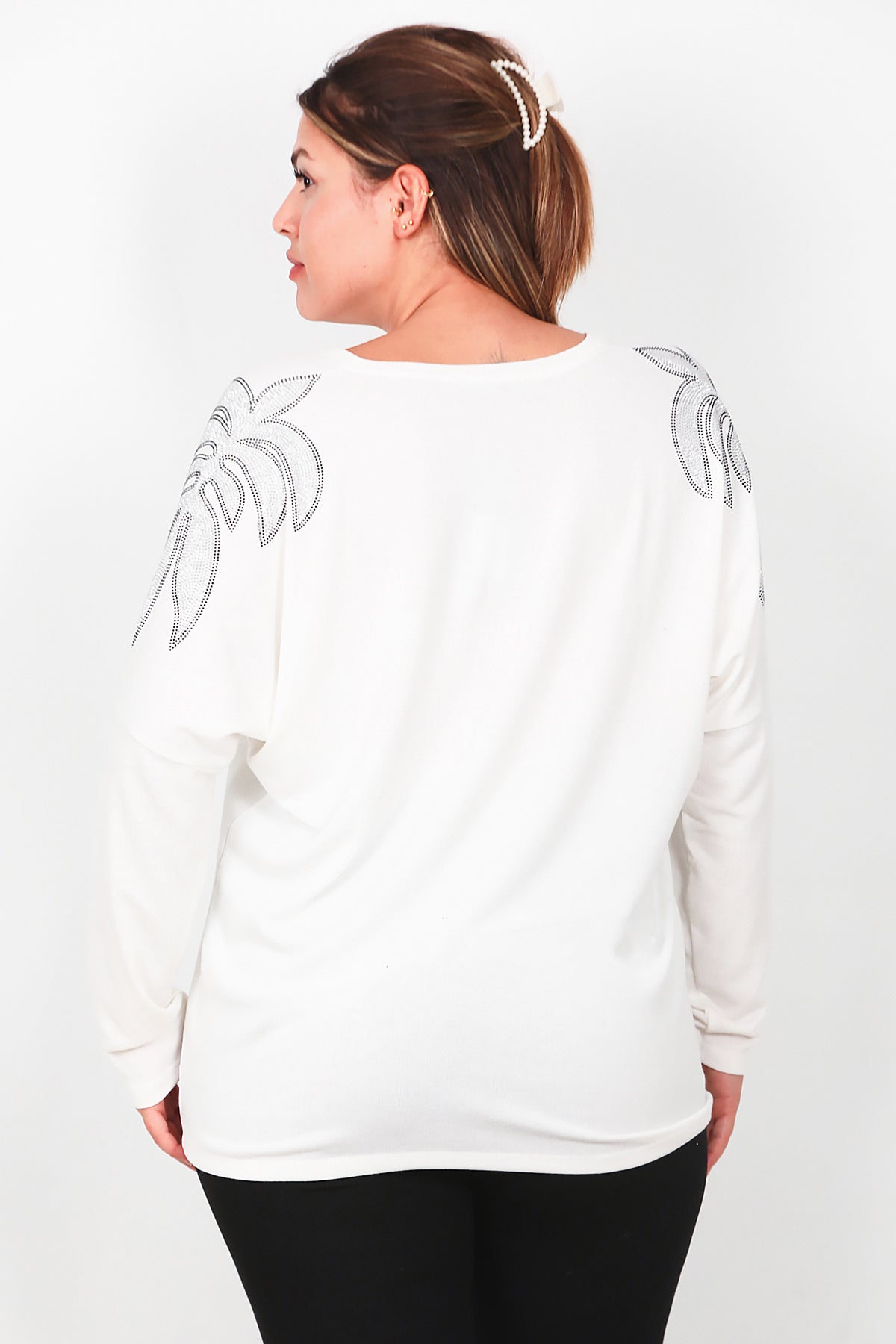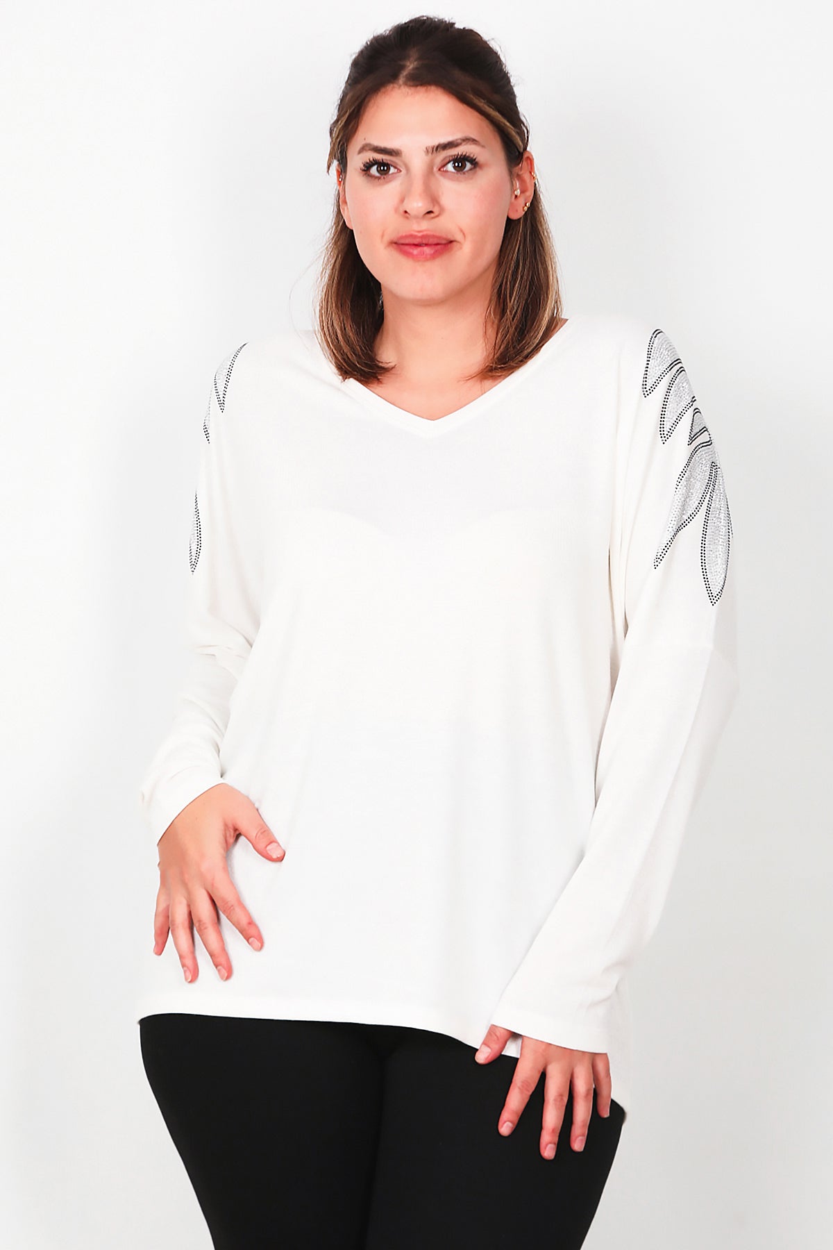 Büyük Beden V Yaka Önü Taşlı Uzun Kol Bluz Ekru