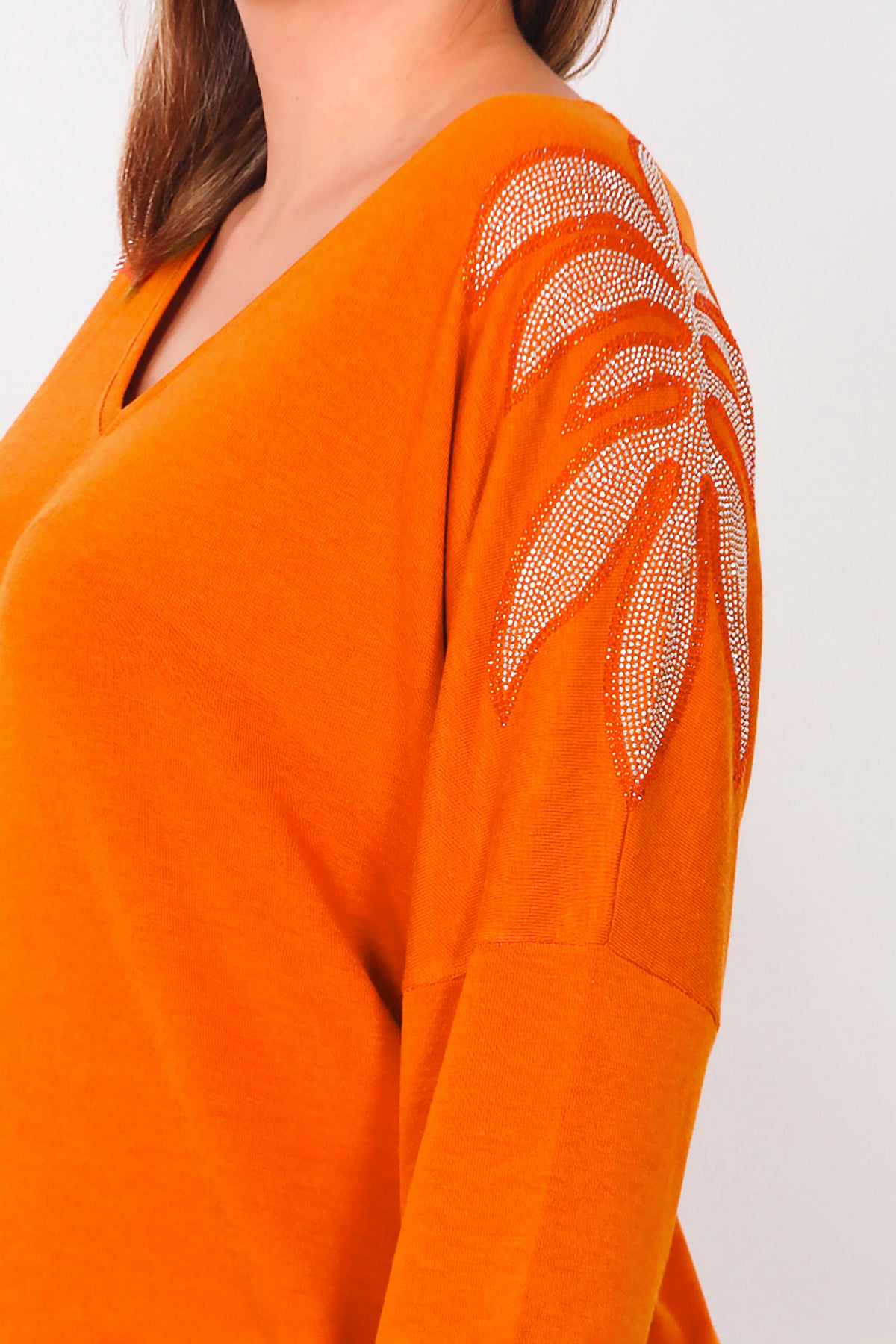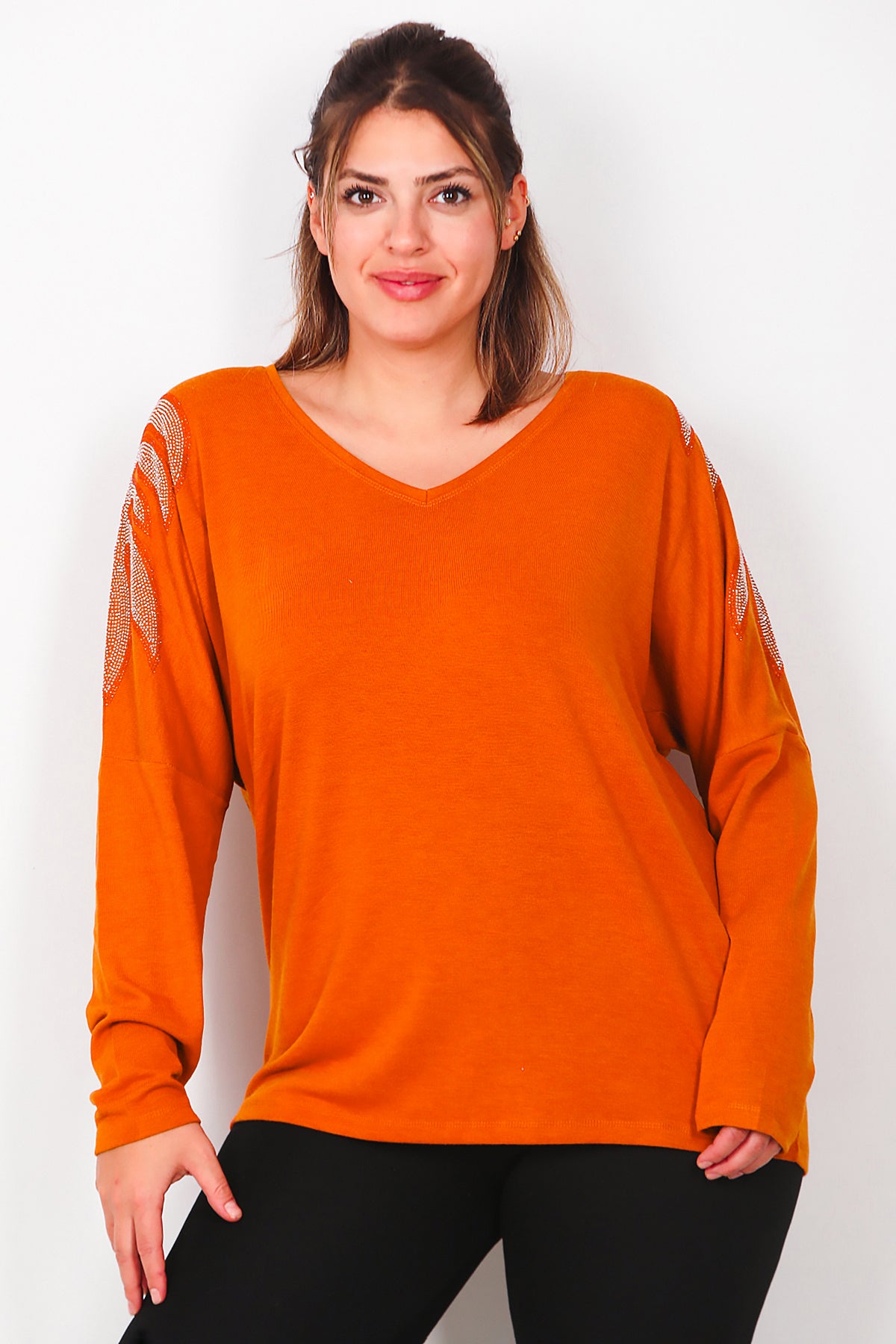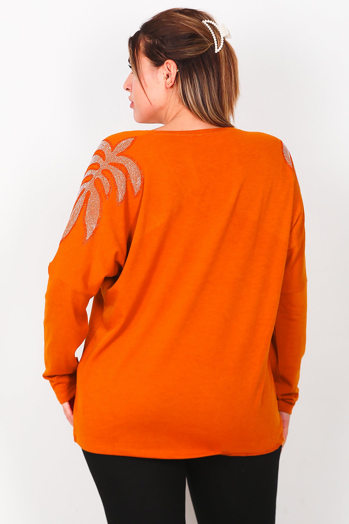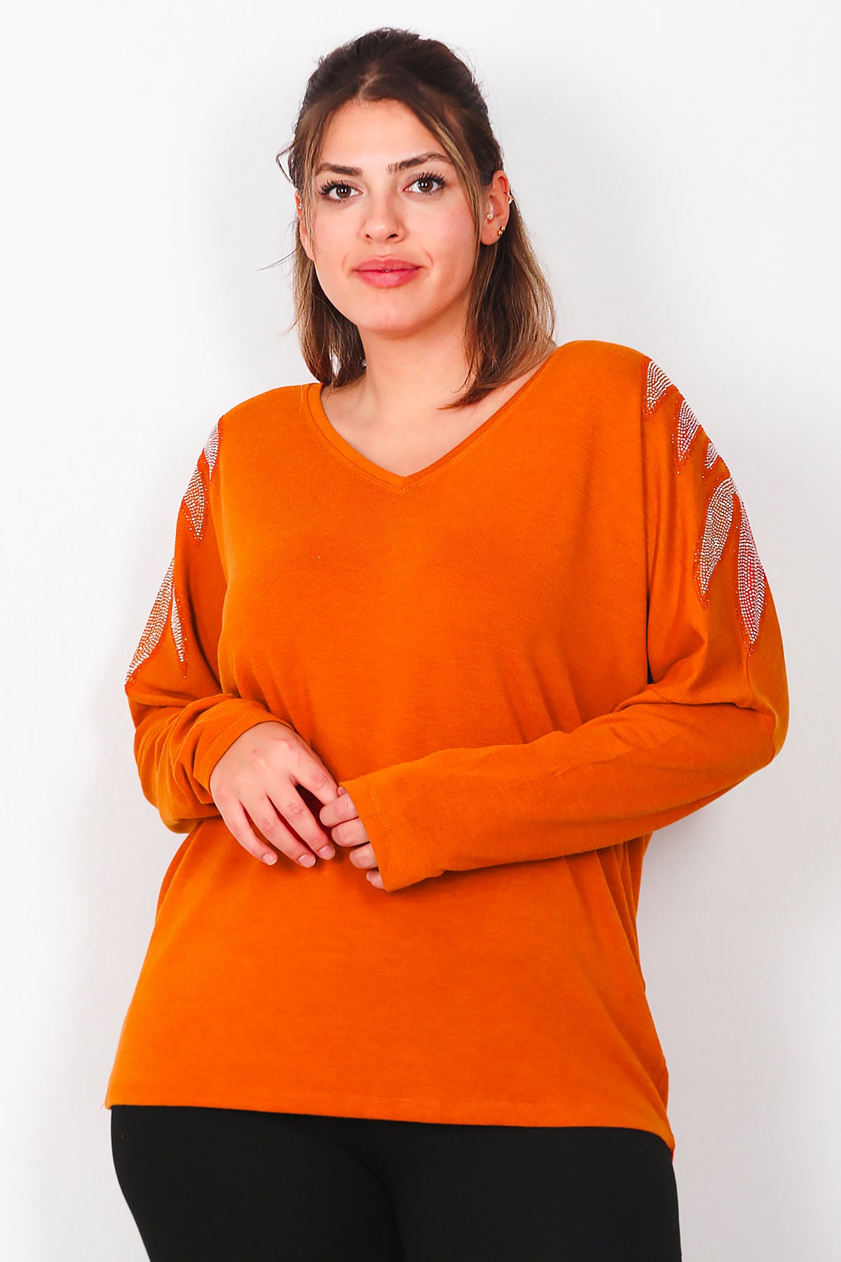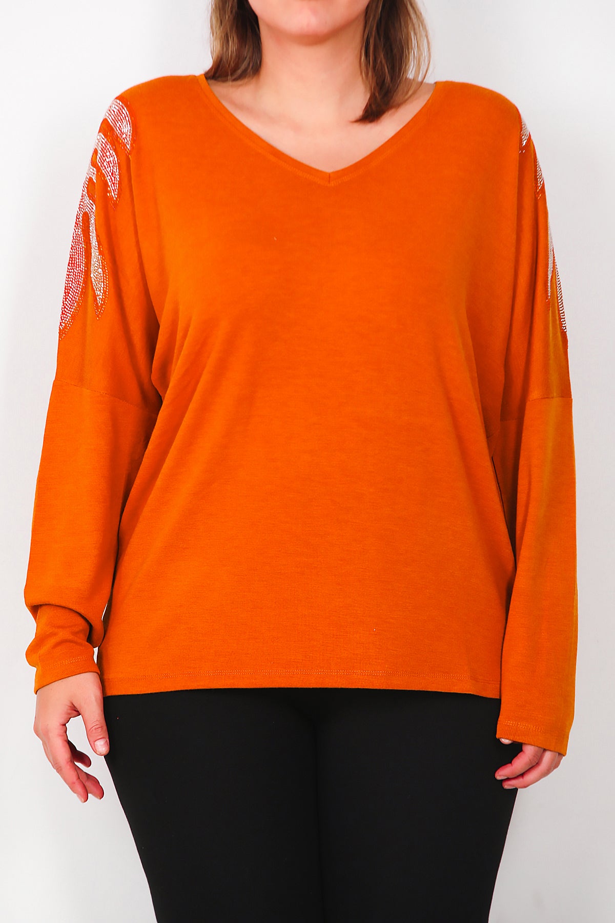 Büyük Beden V Yaka Önü Taşlı Uzun Kol Bluz Kiremit