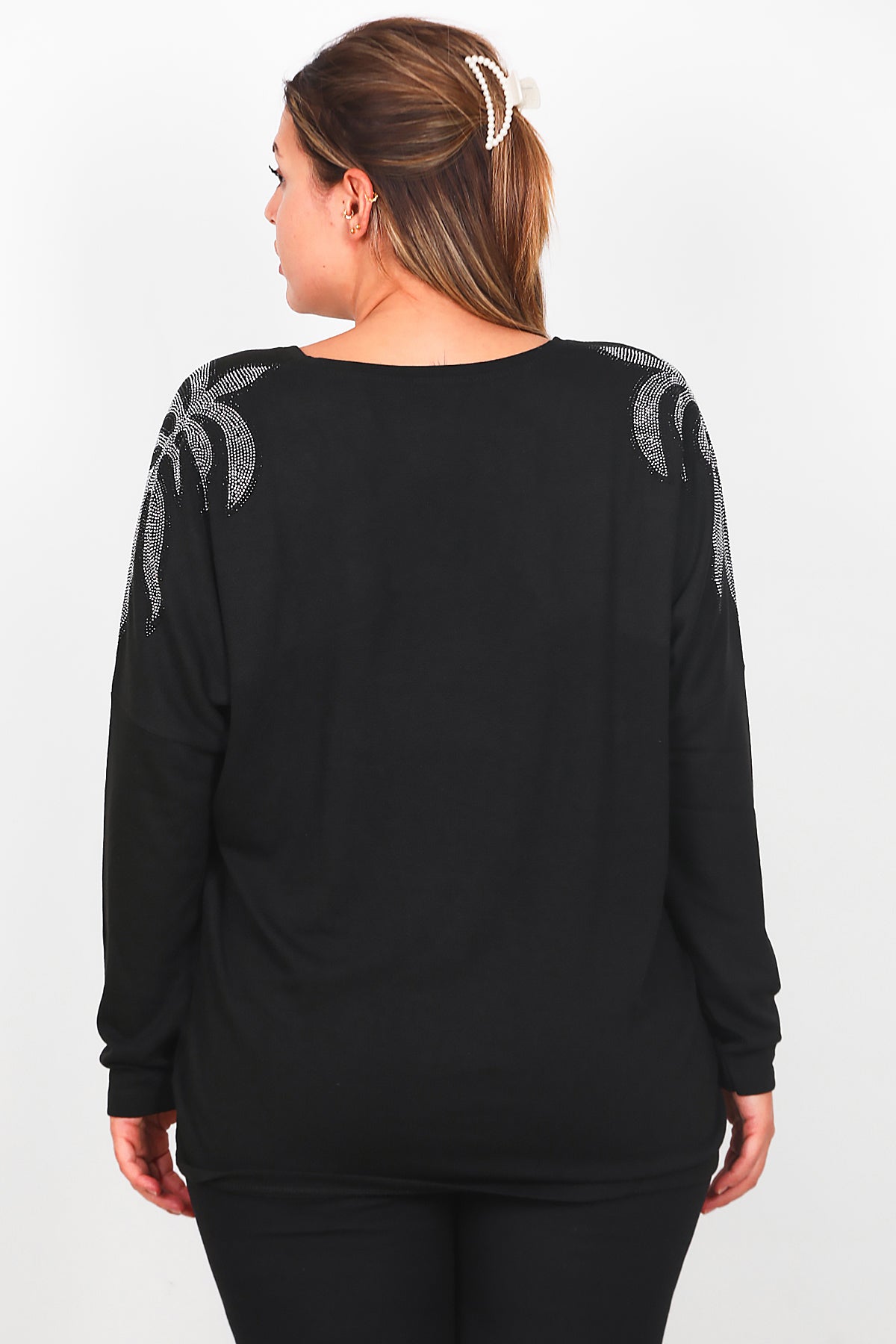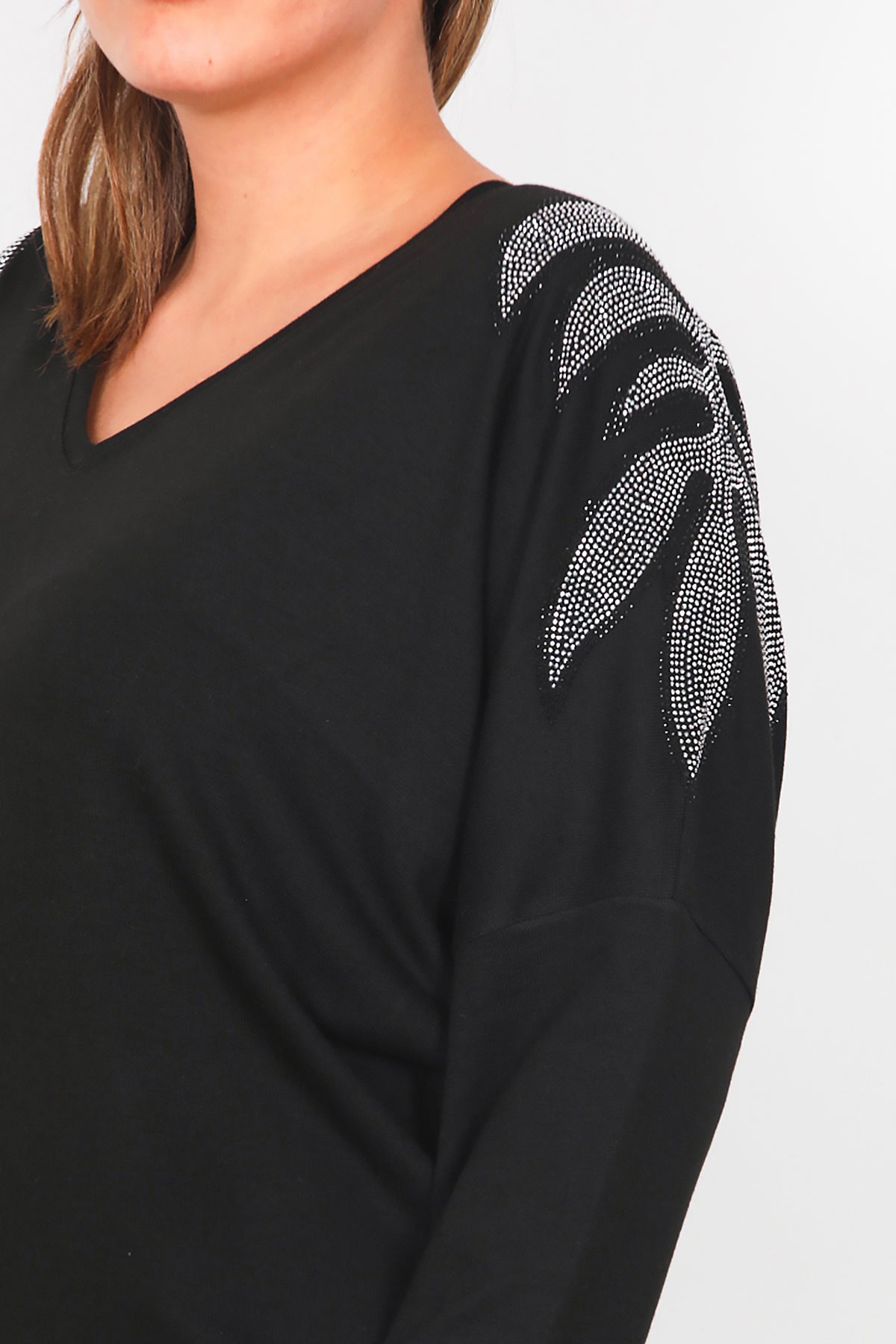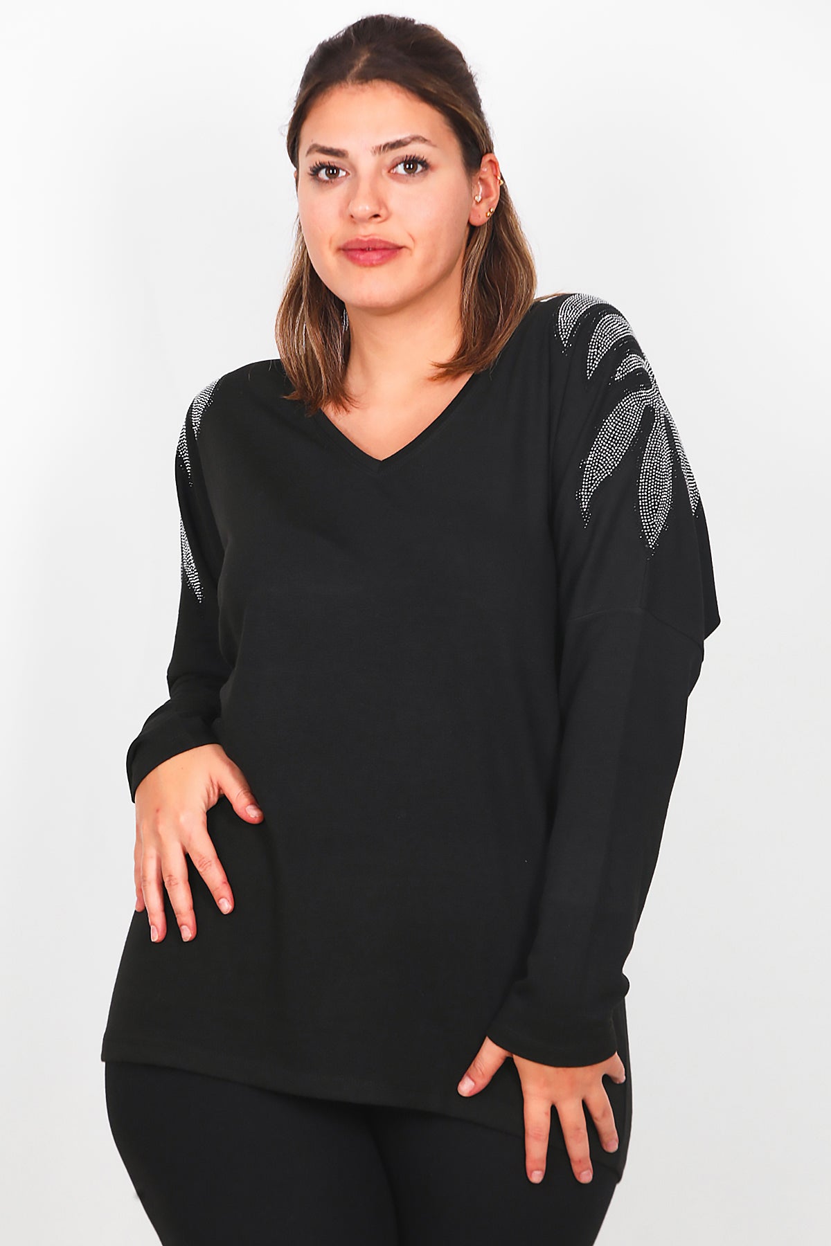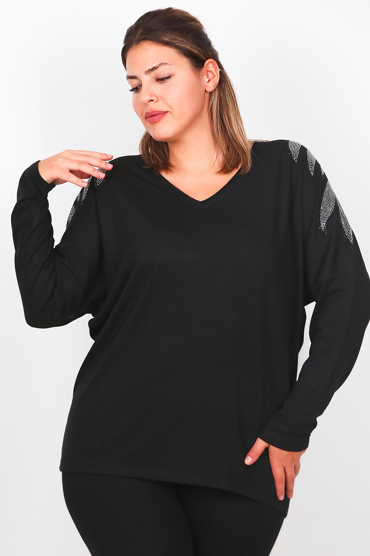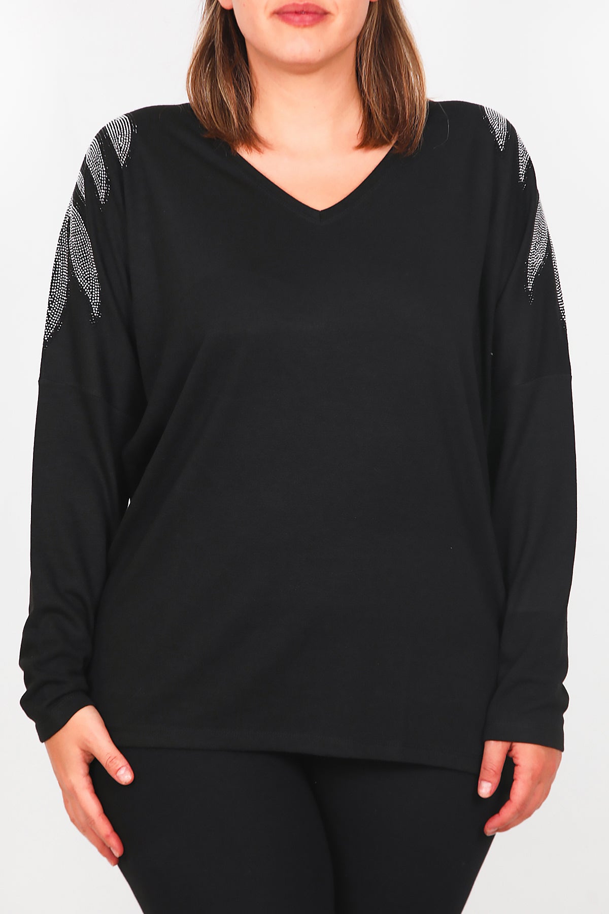 Büyük Beden V Yaka Önü Taşlı Uzun Kol Bluz Siyah