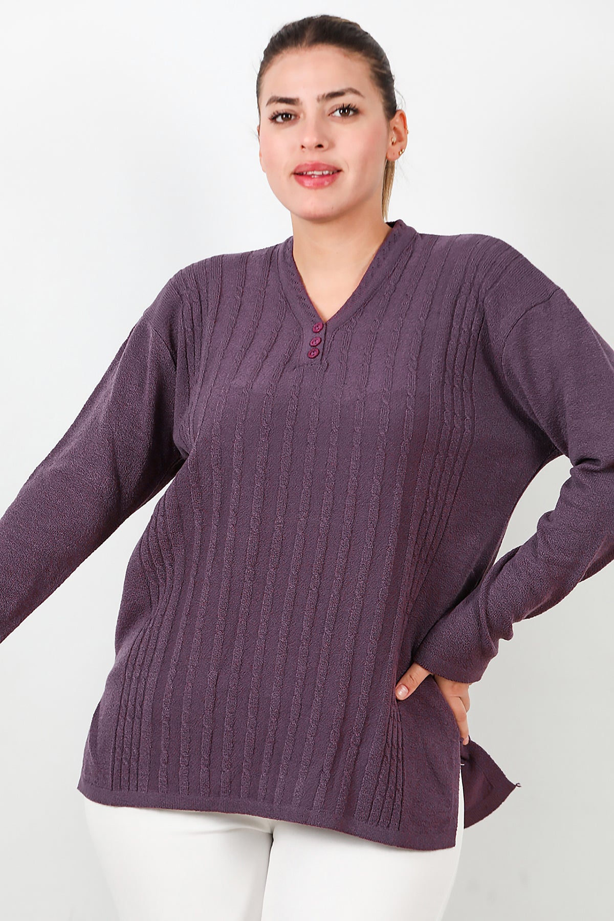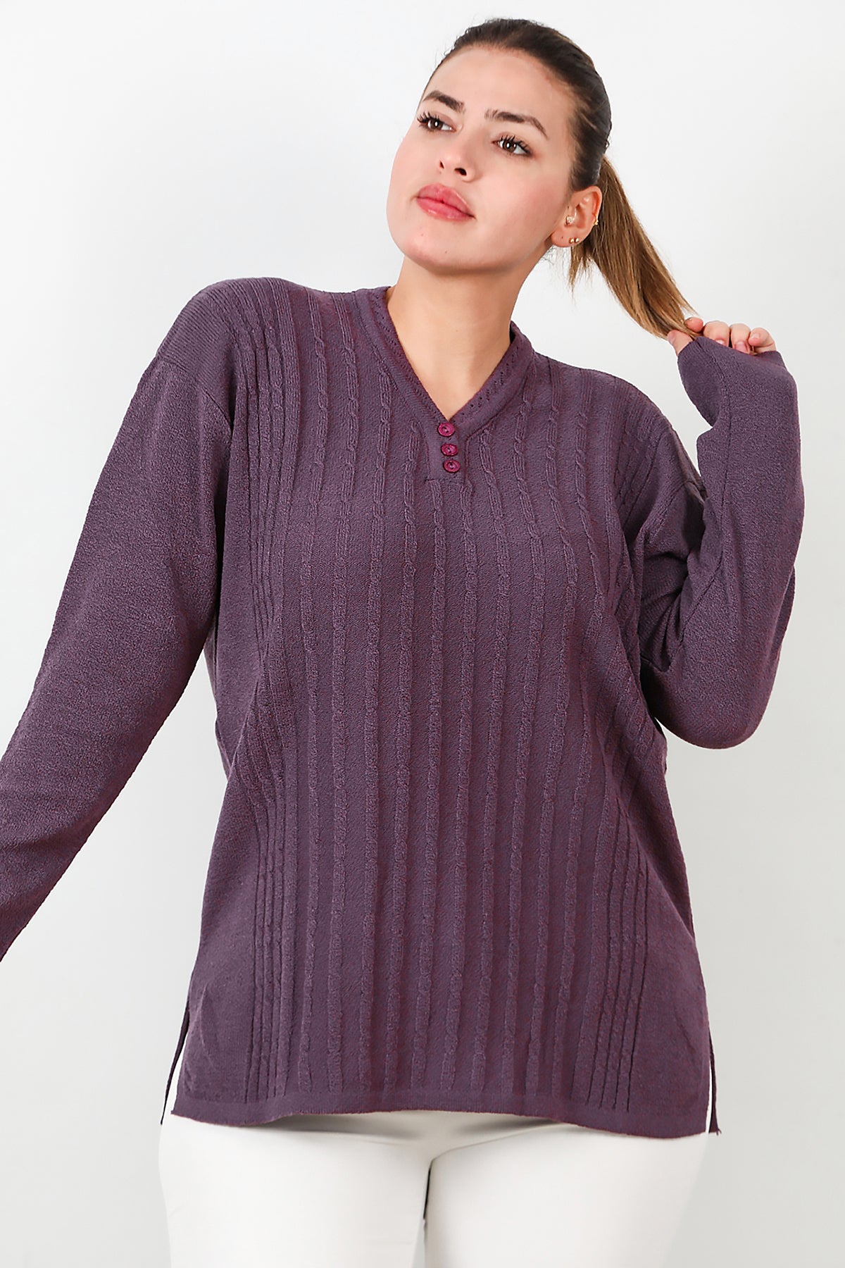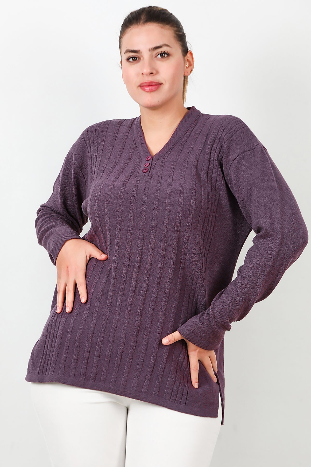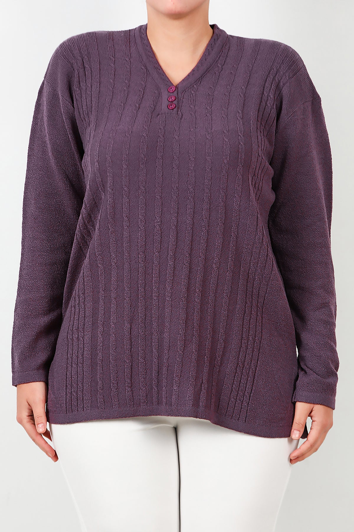 Büyük Beden V Yaka Üç Düğmeli Triko Bluz Açık Mor
