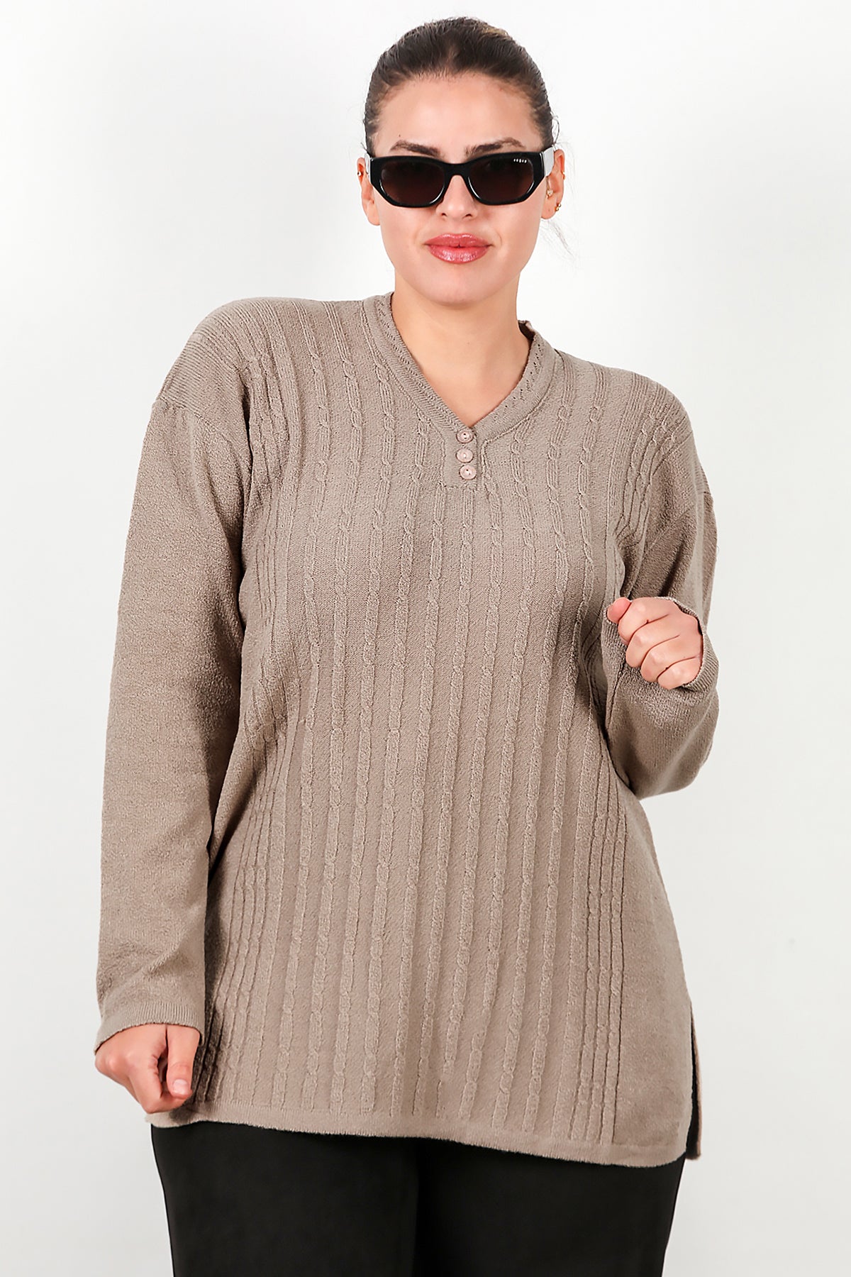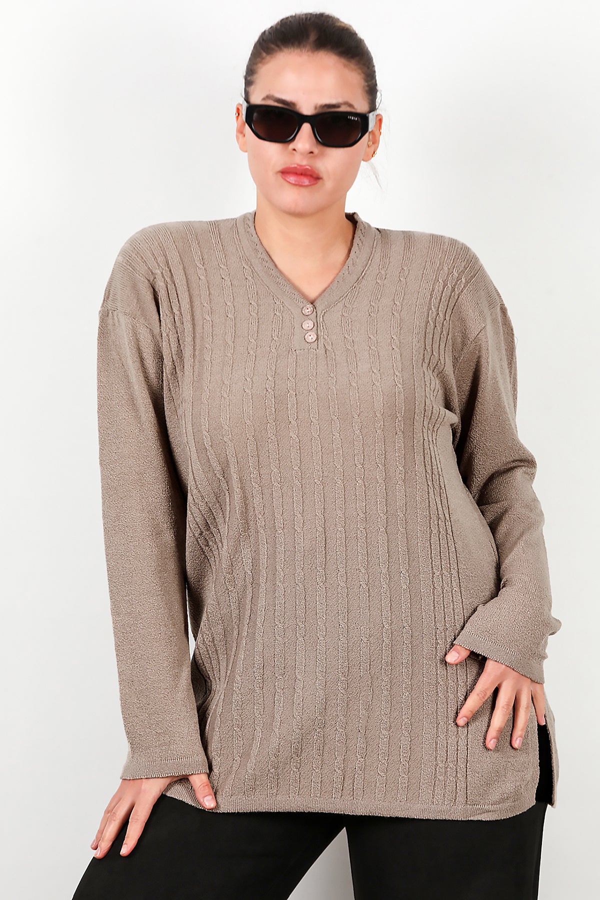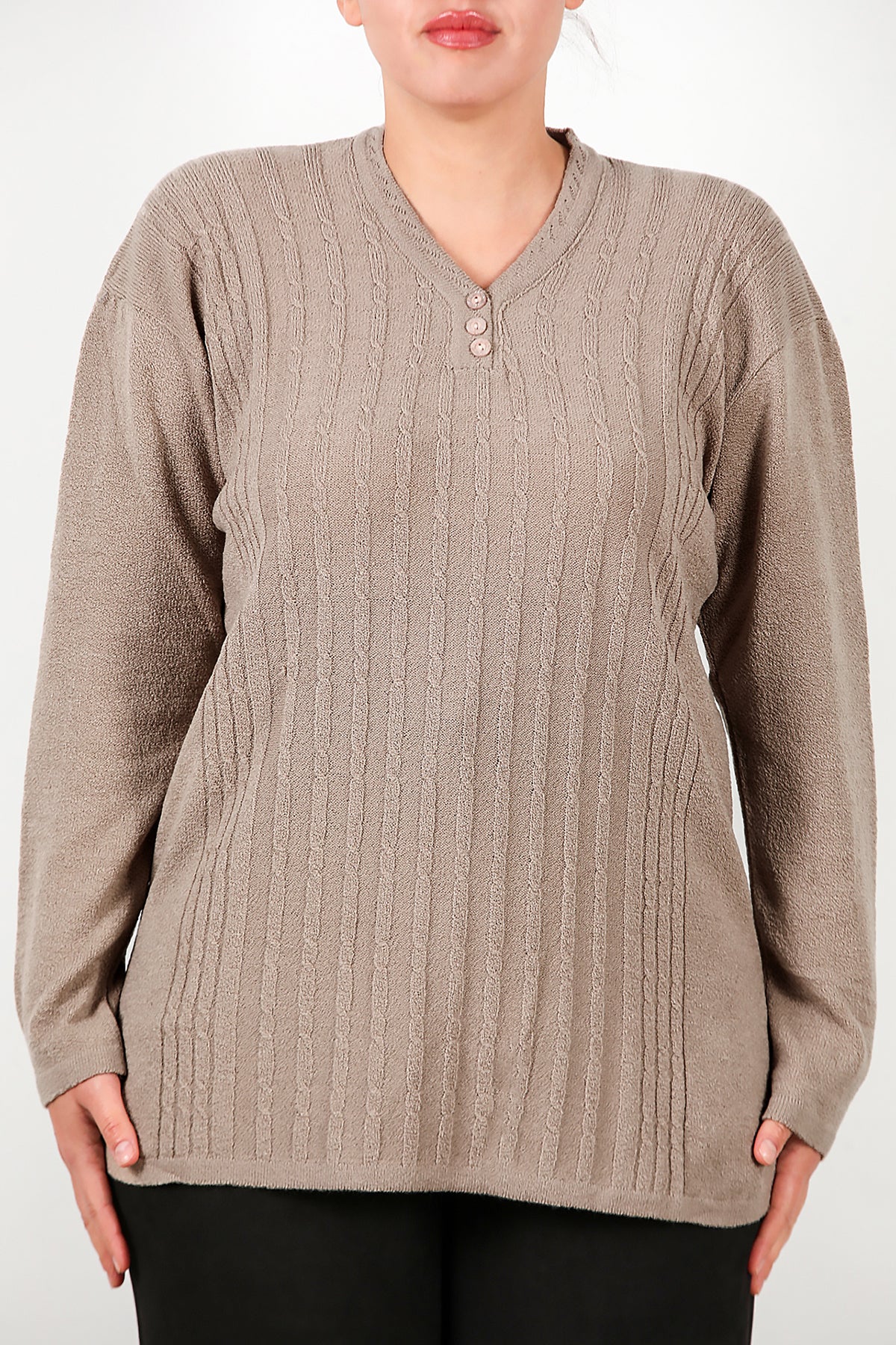 Büyük Beden V Yaka Üç Düğmeli Triko Bluz Bej