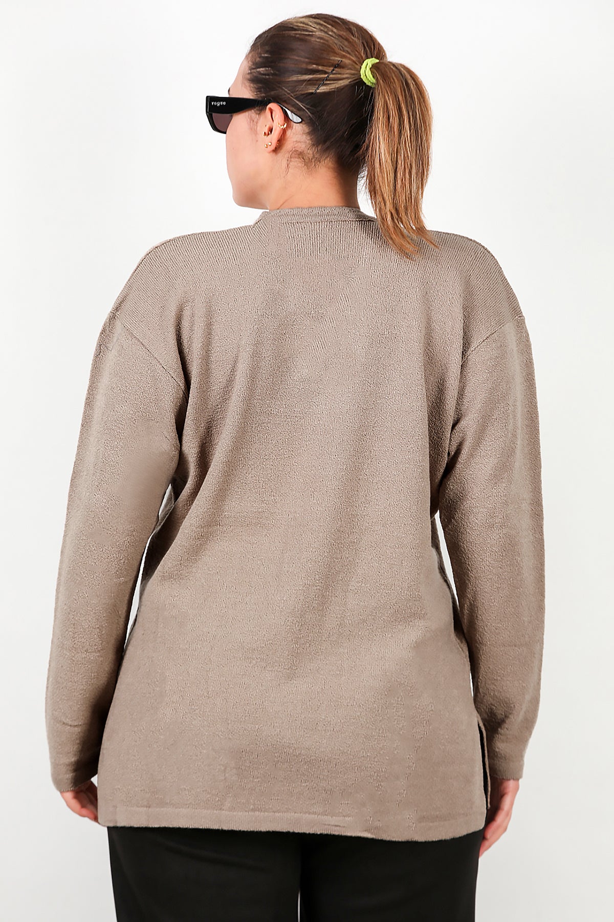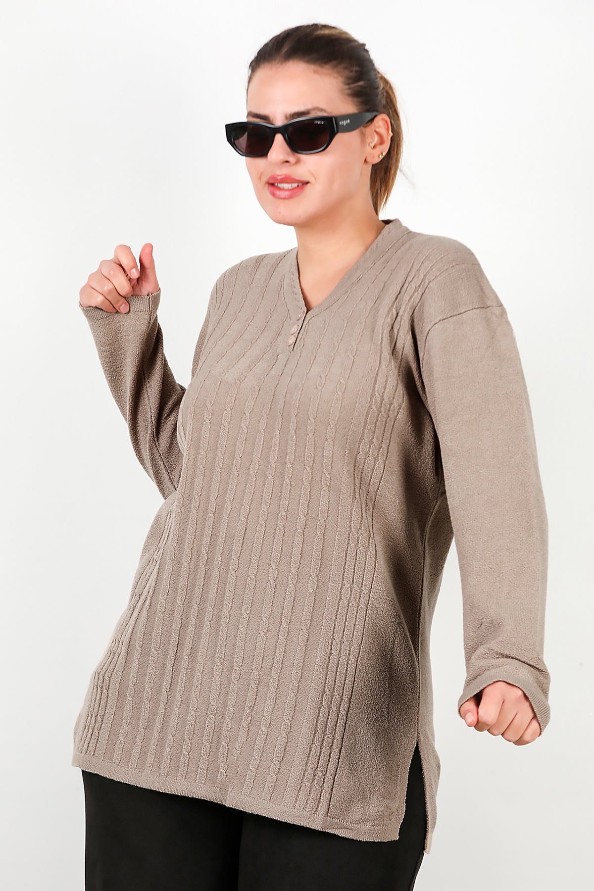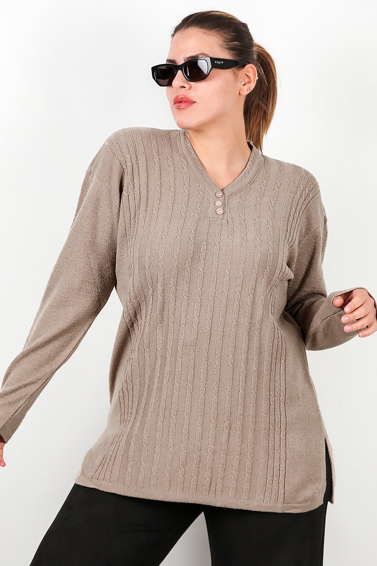 Büyük Beden V Yaka Üç Düğmeli Triko Bluz Bej
