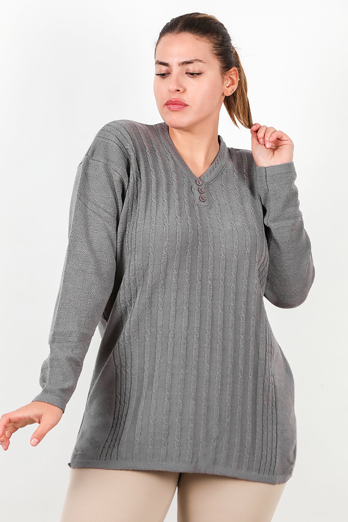 Büyük Beden V Yaka Üç Düğmeli Triko Bluz Gri