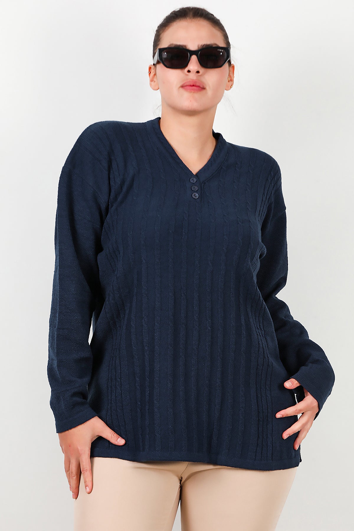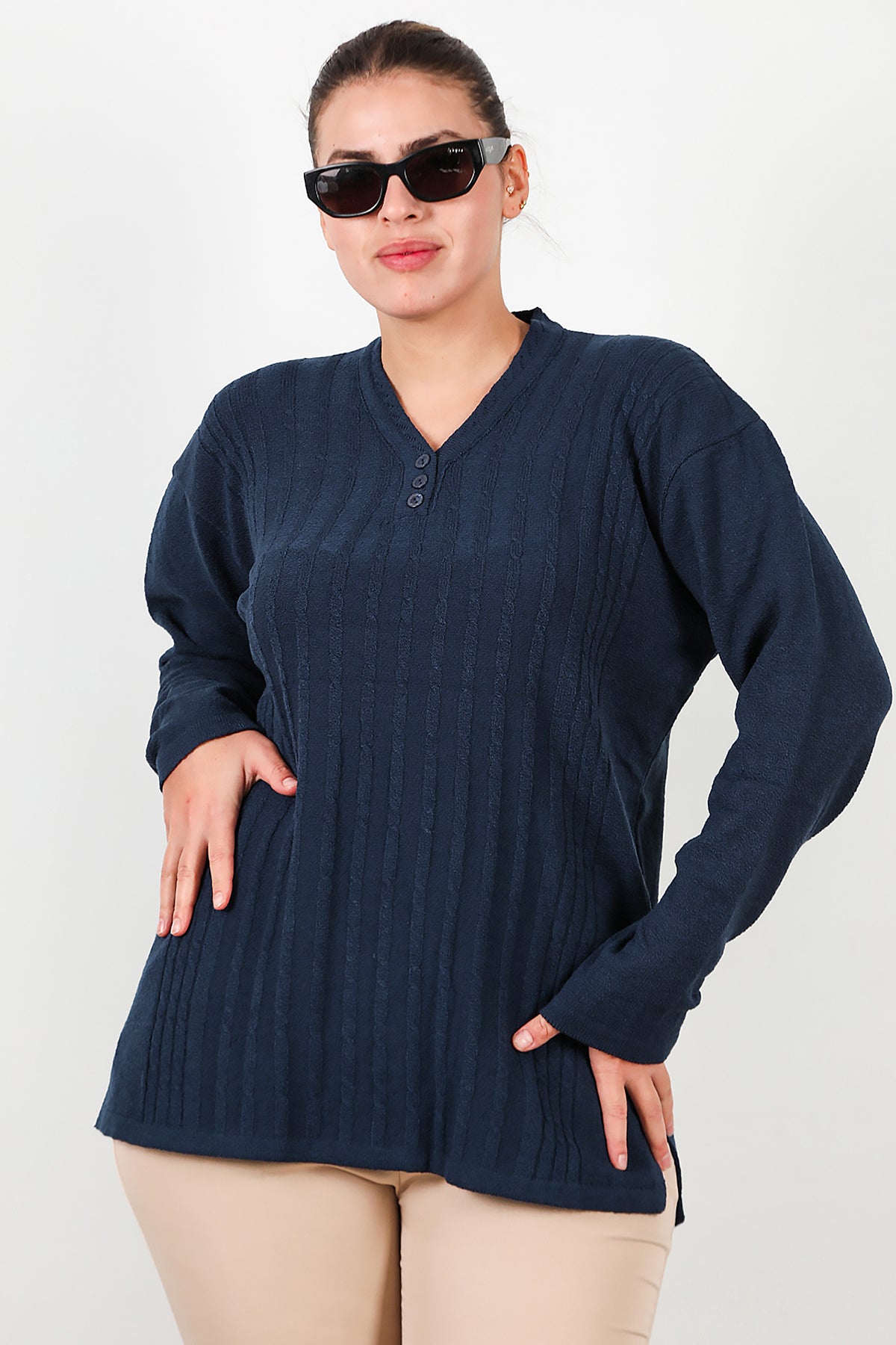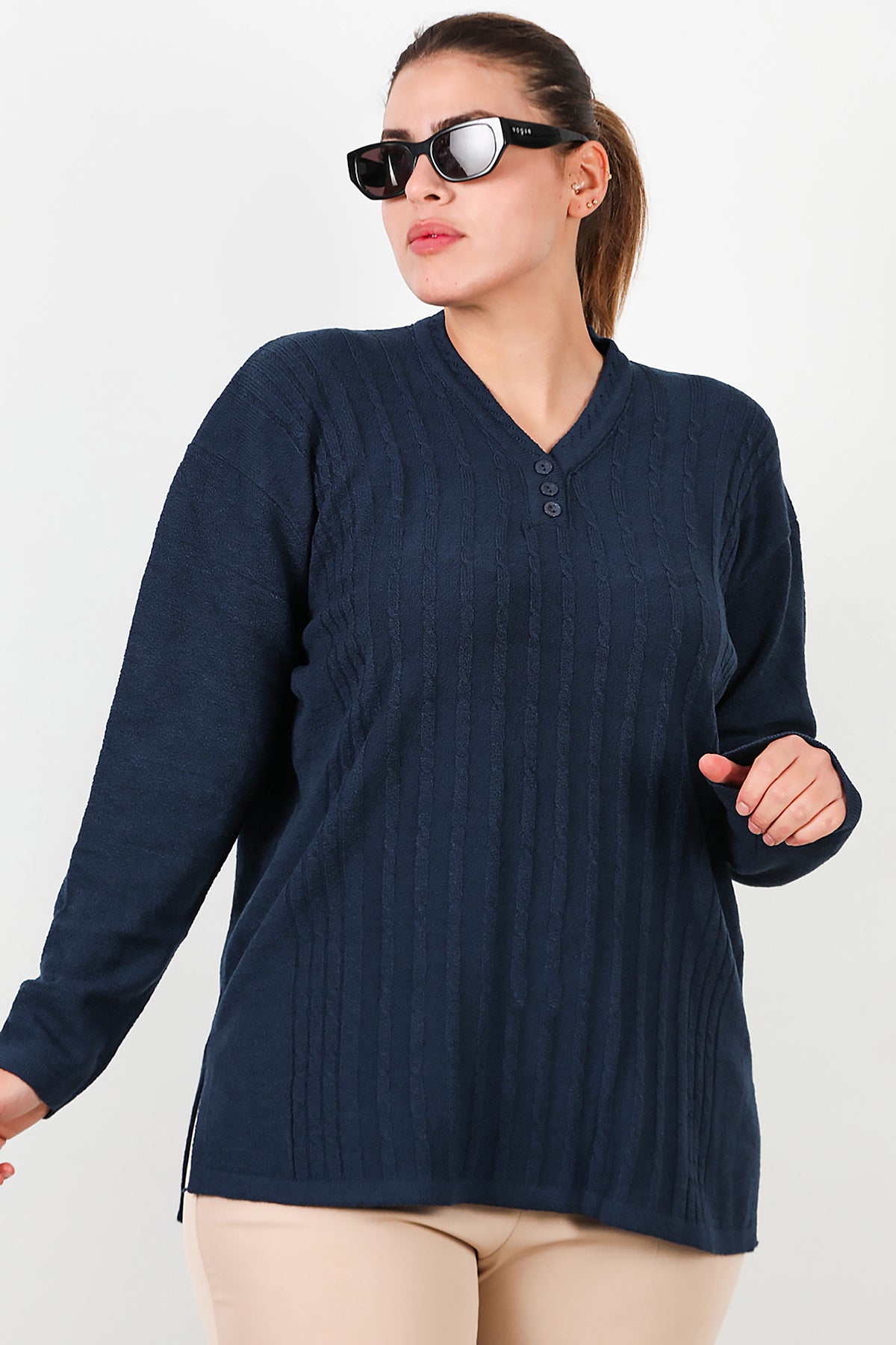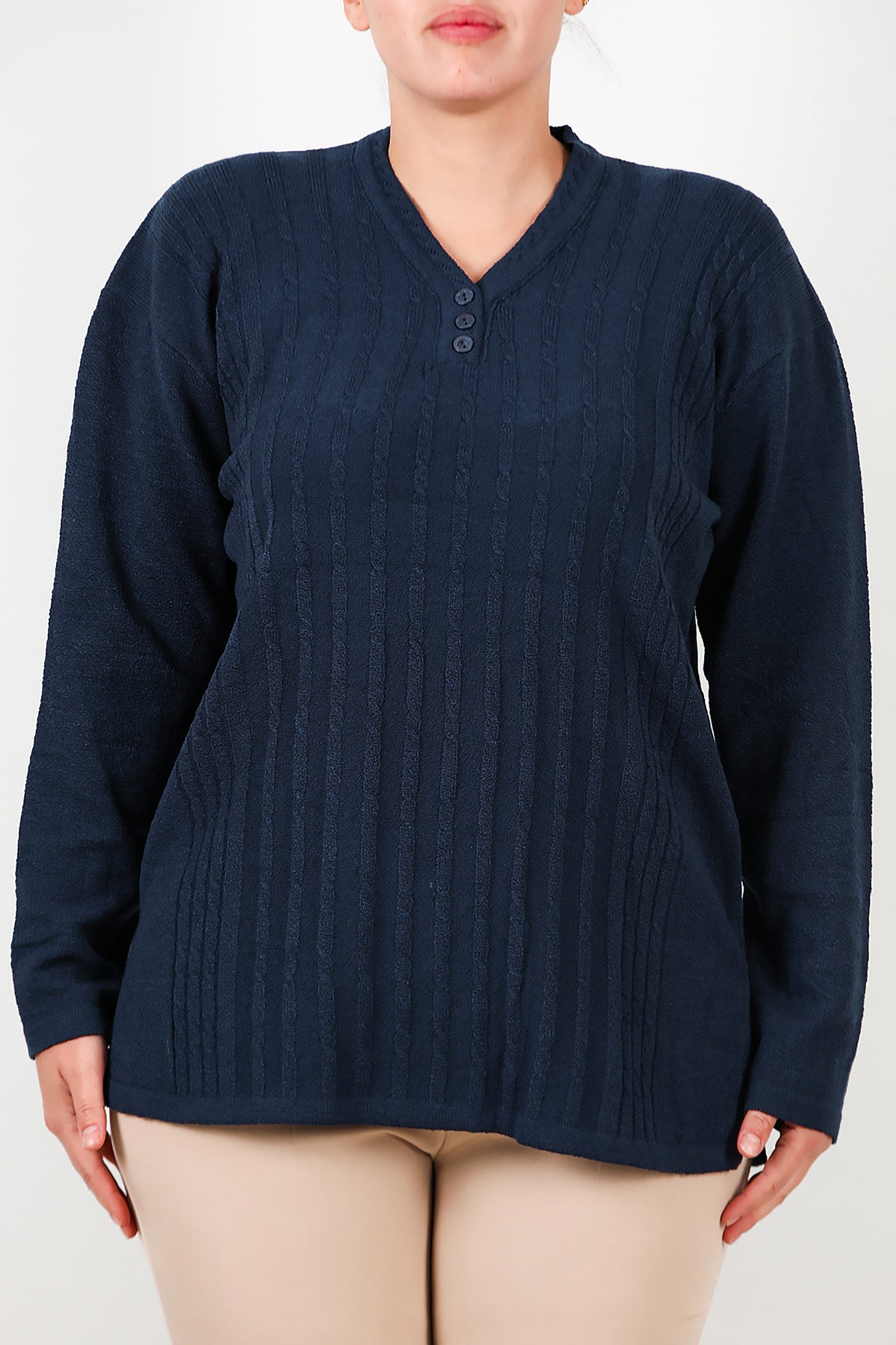 Büyük Beden V Yaka Üç Düğmeli Triko Bluz Lacivert