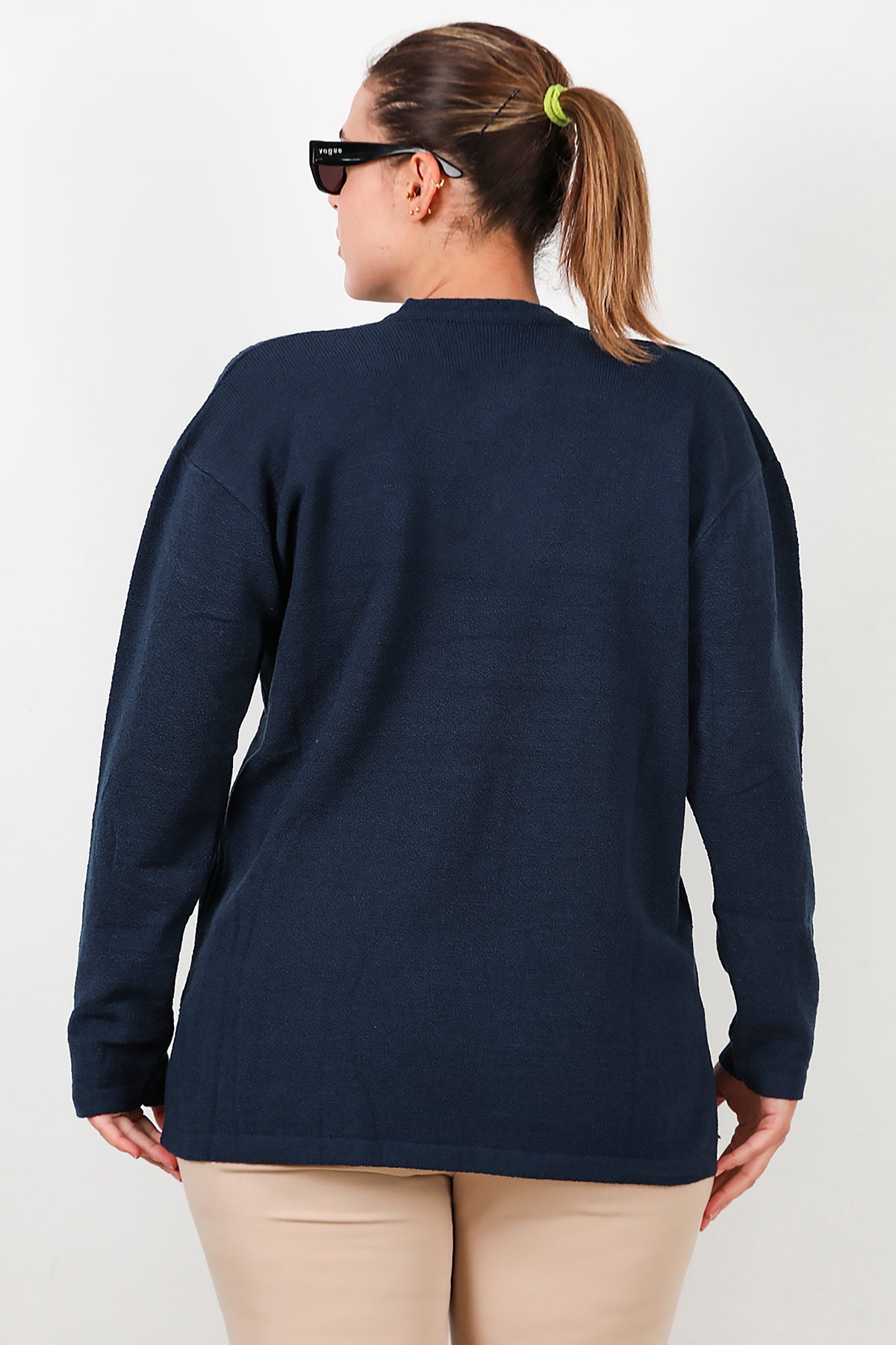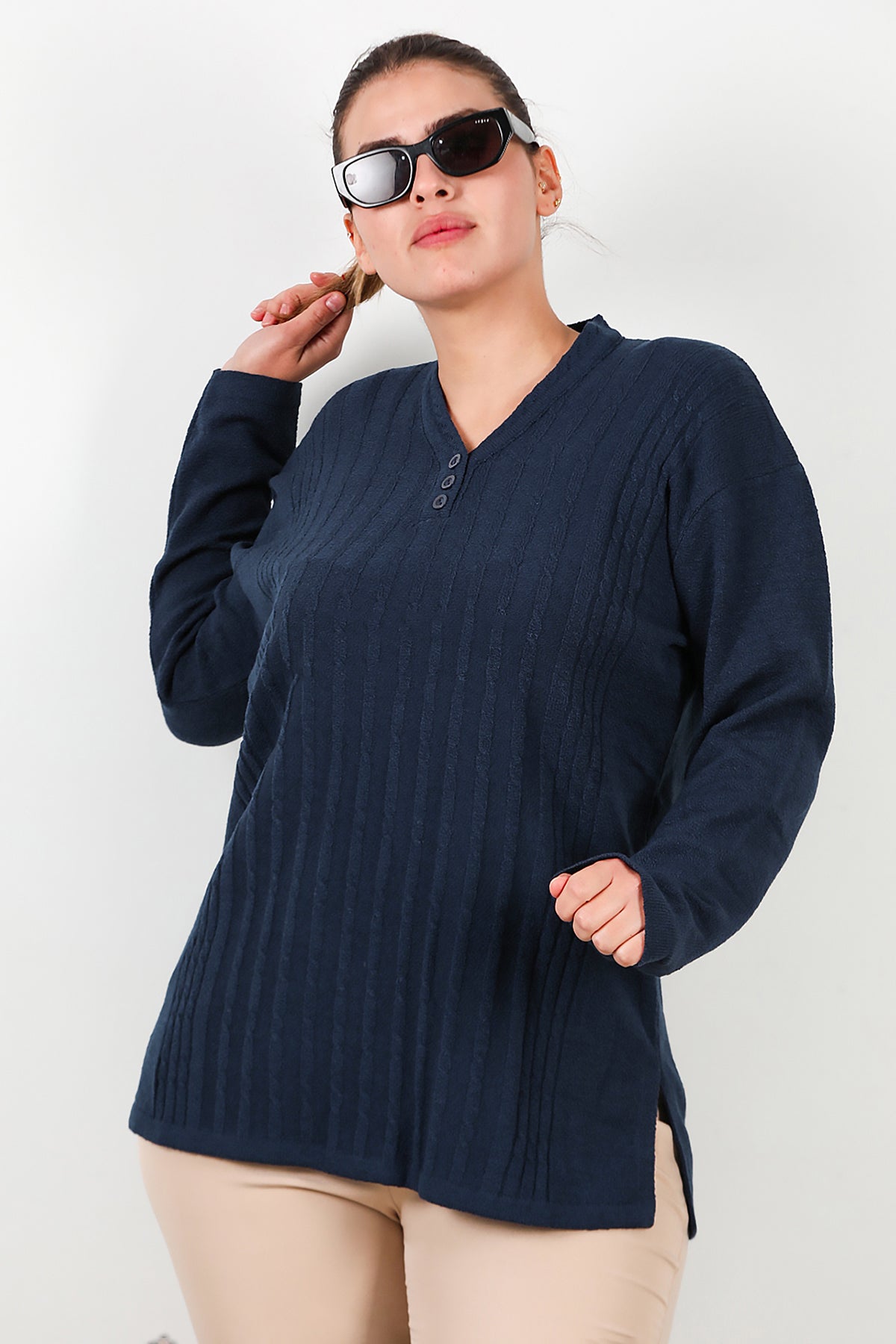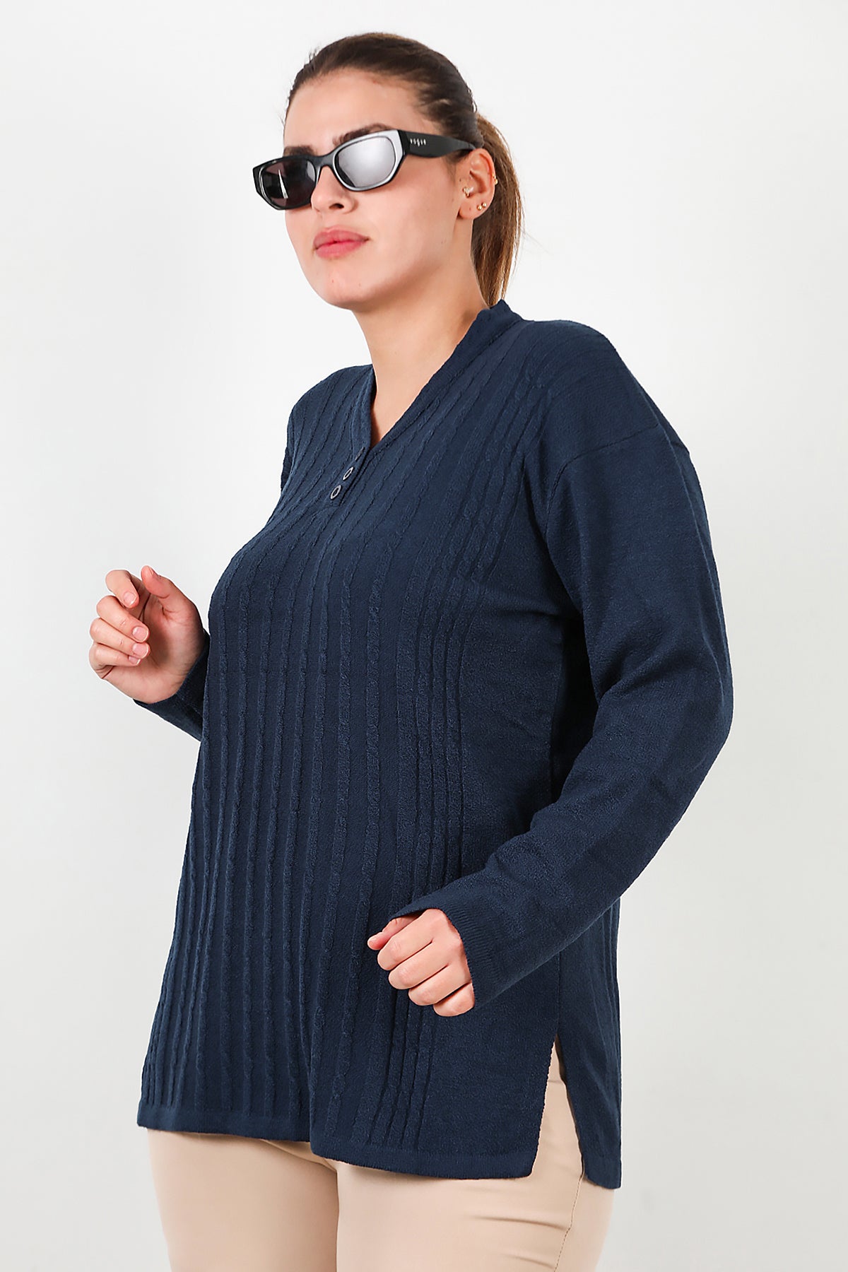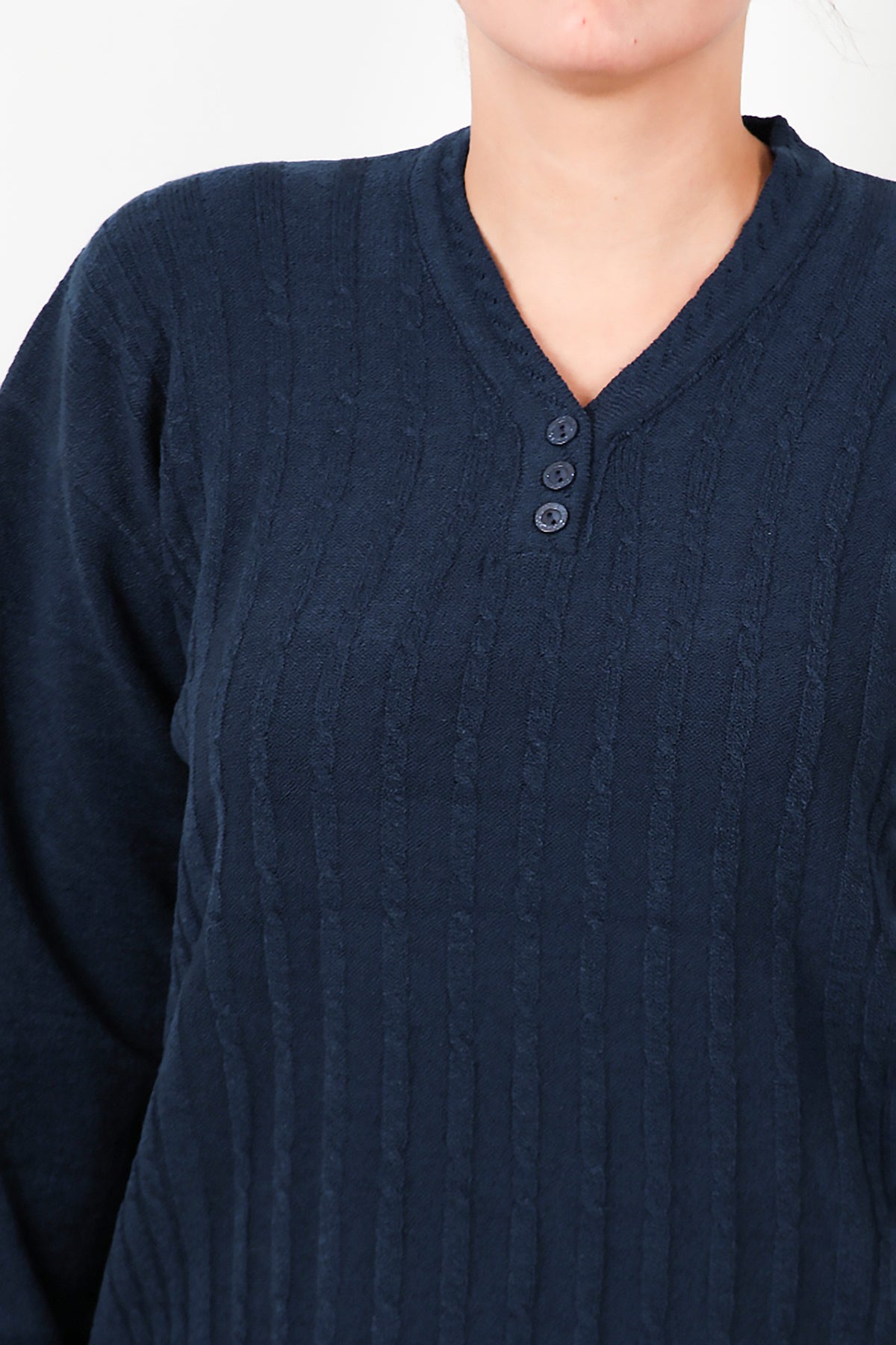 Büyük Beden V Yaka Üç Düğmeli Triko Bluz Lacivert