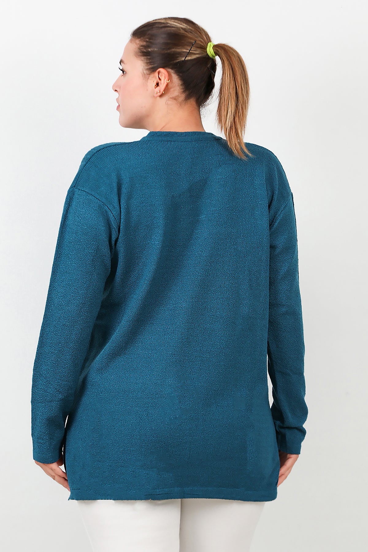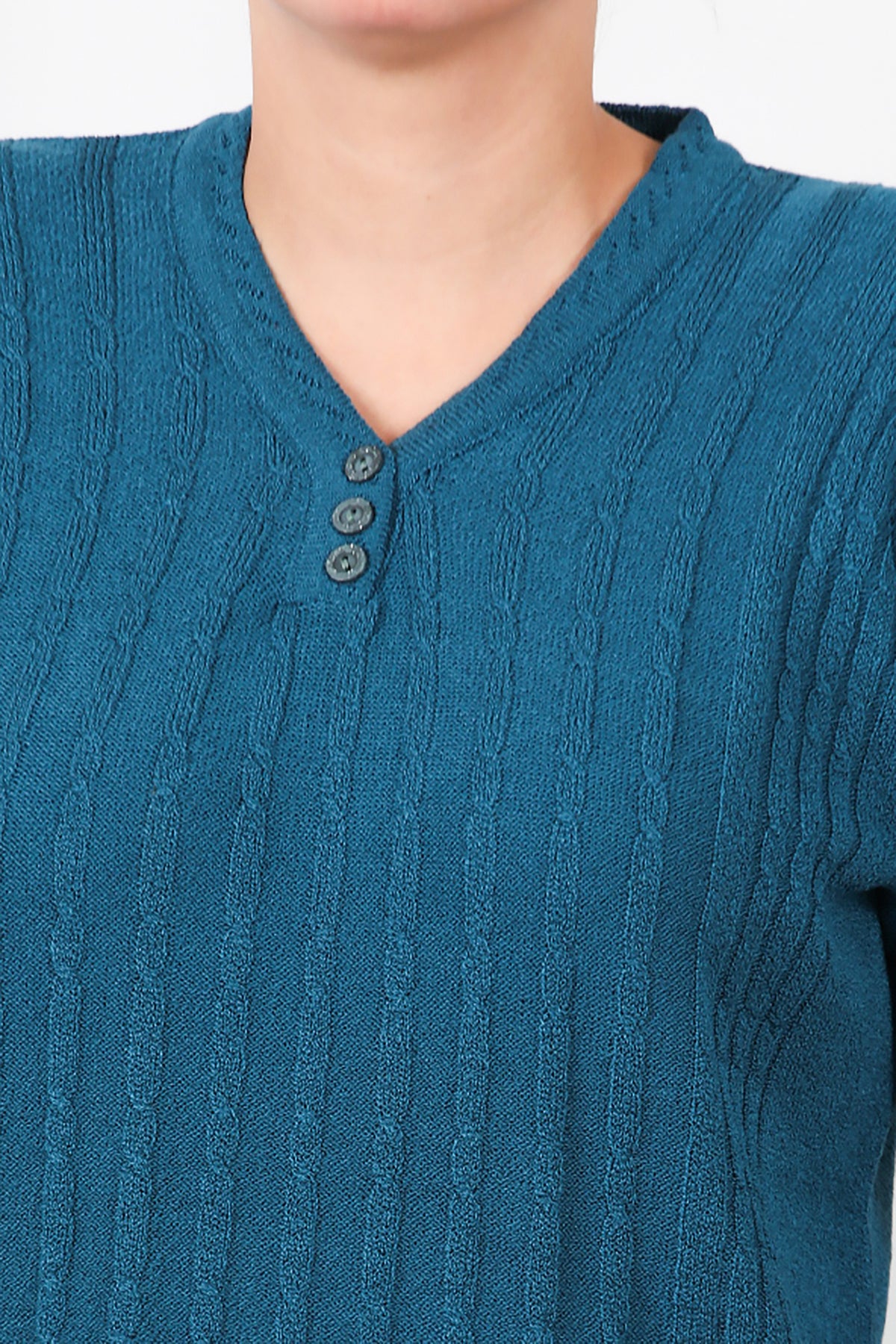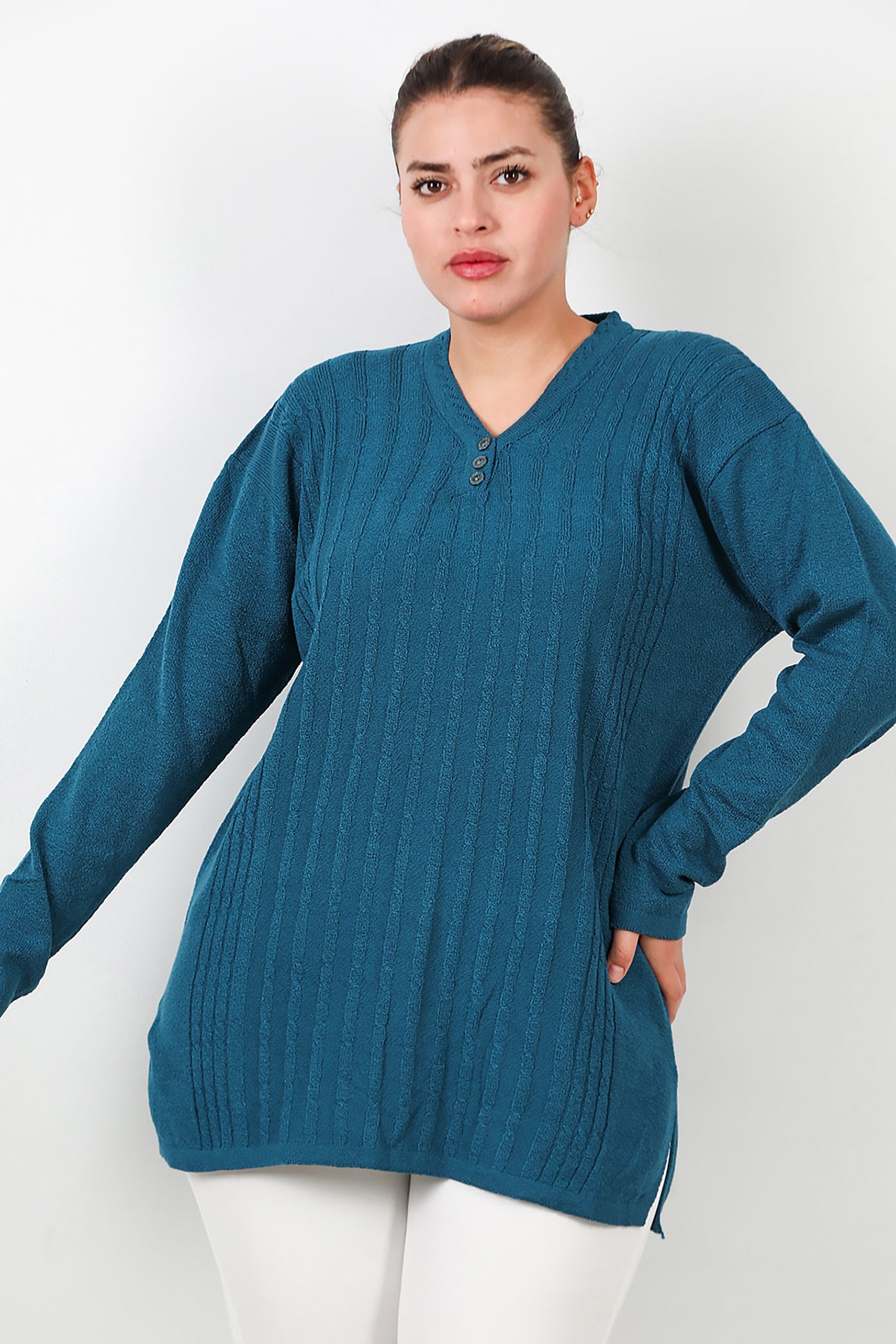 Büyük Beden V Yaka Üç Düğmeli Triko Bluz Mavi