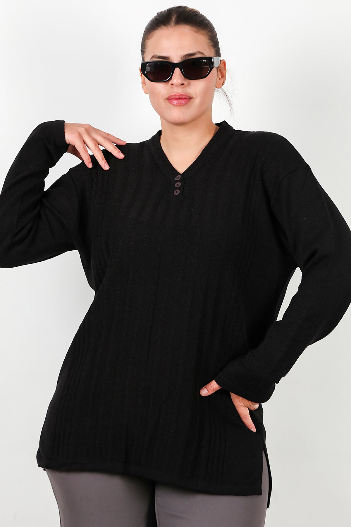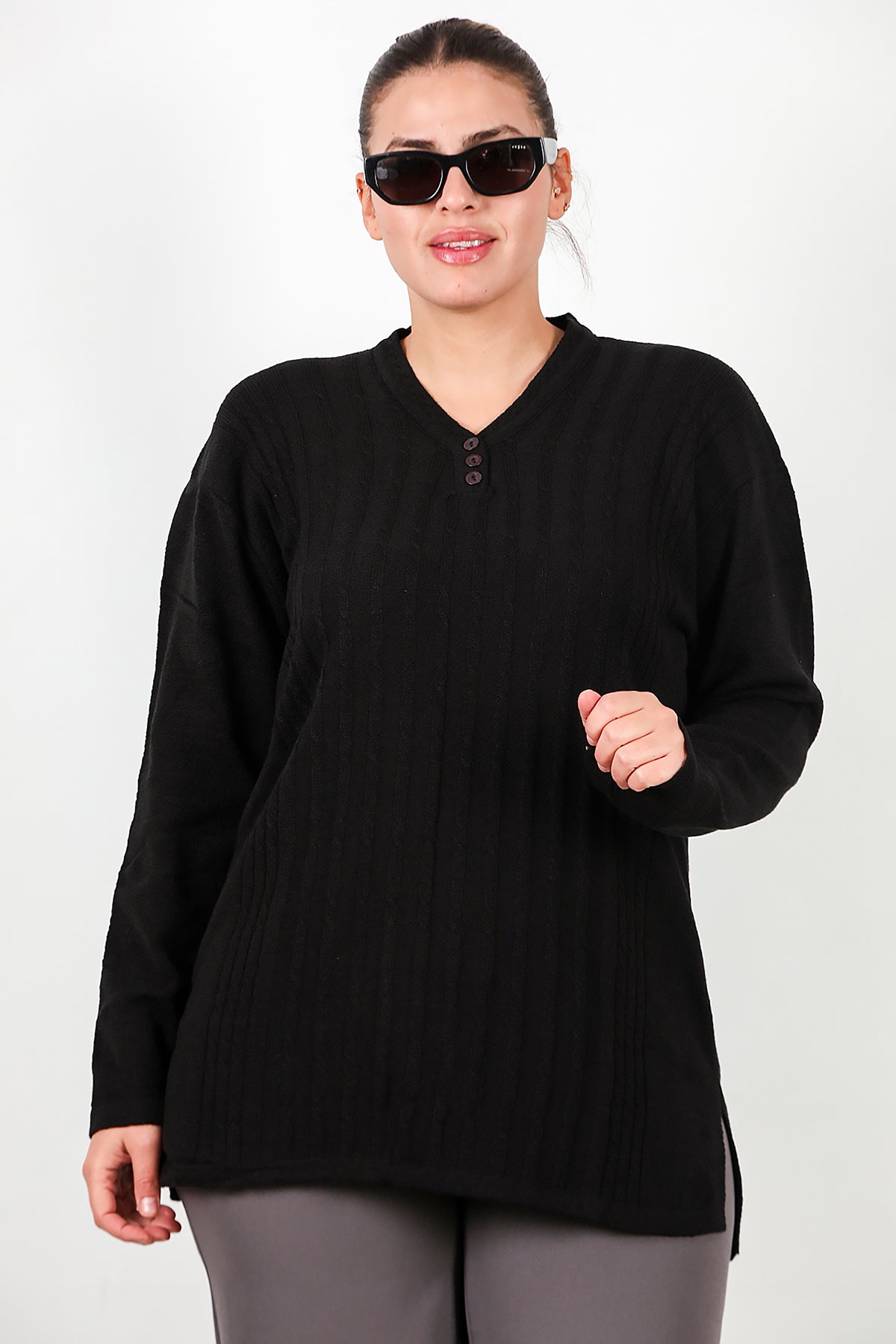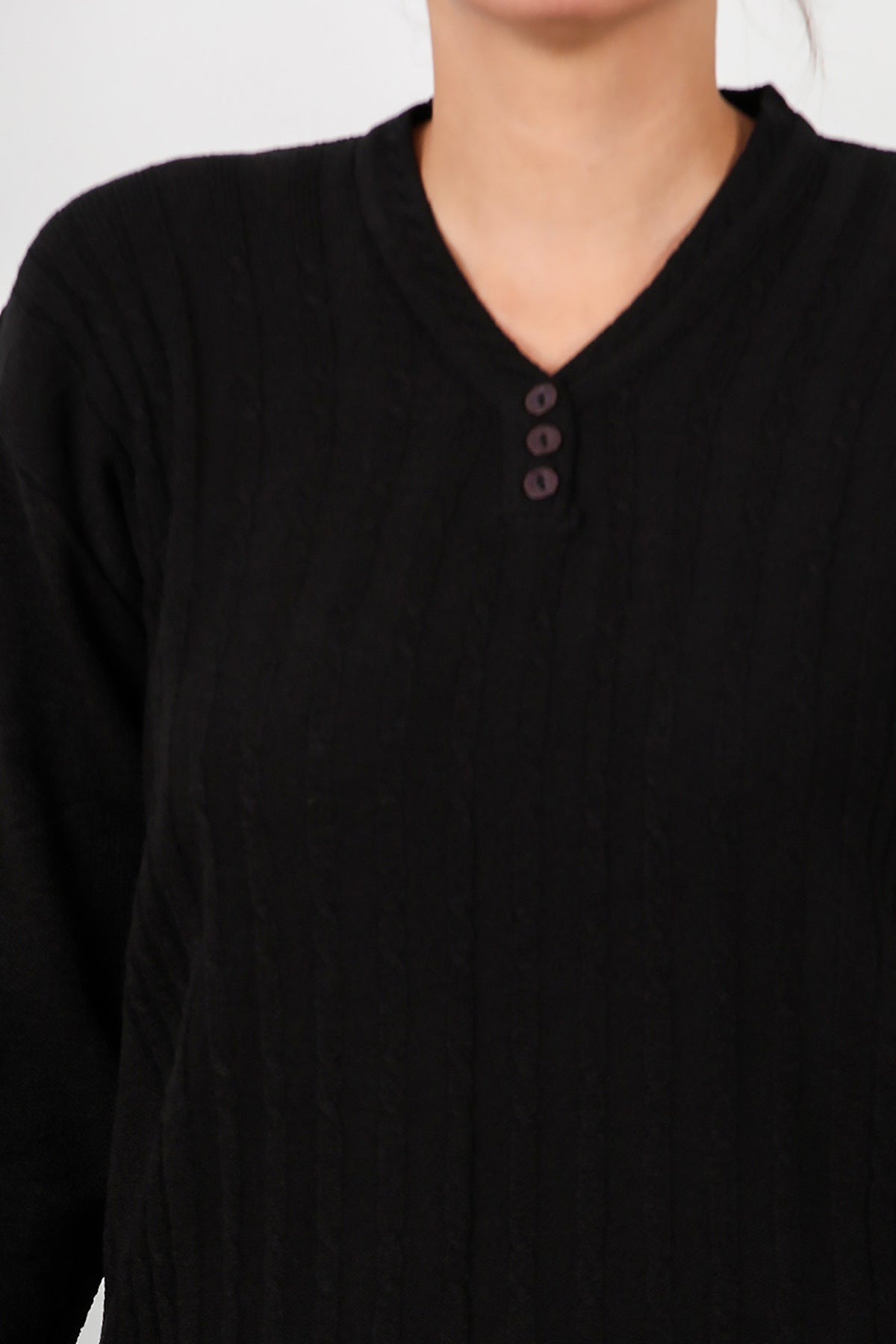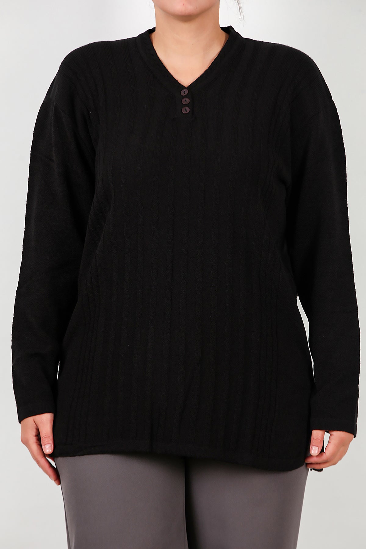 Büyük Beden V Yaka Üç Düğmeli Triko Bluz Siyah