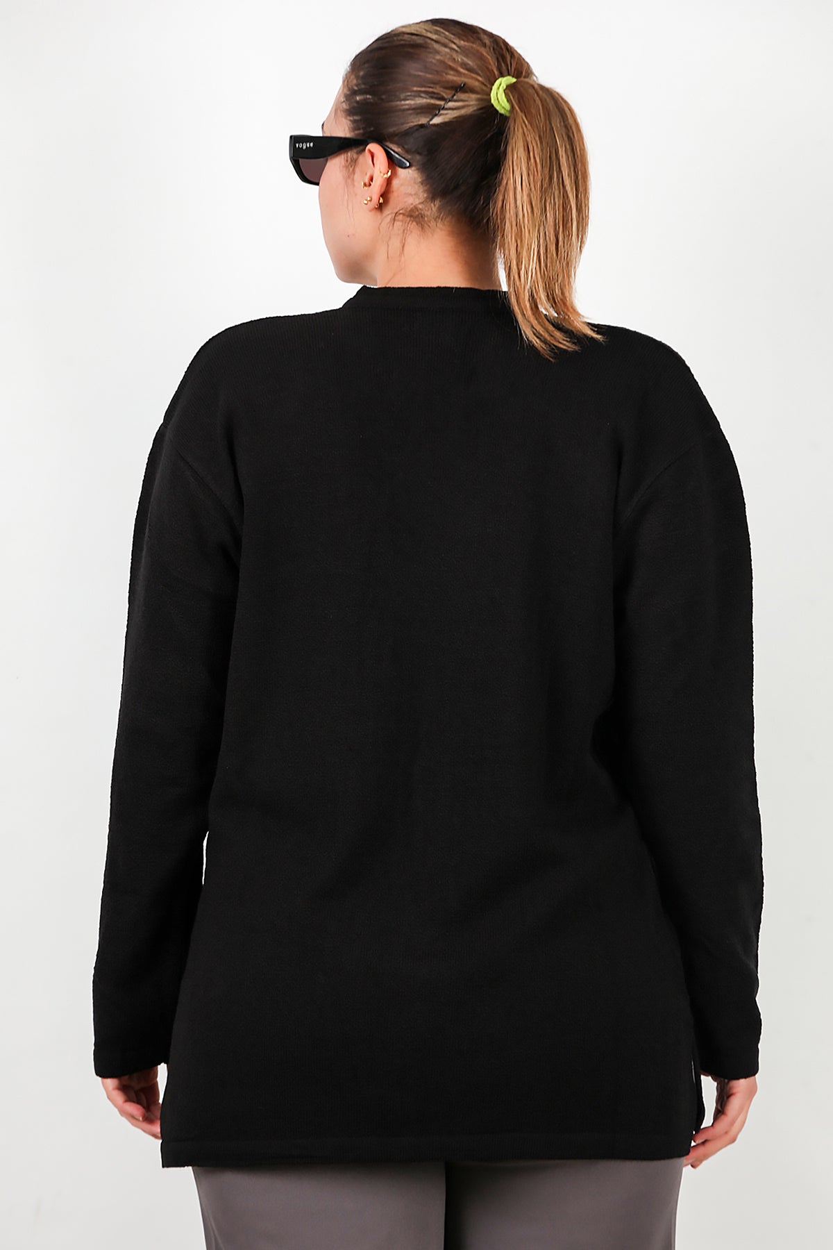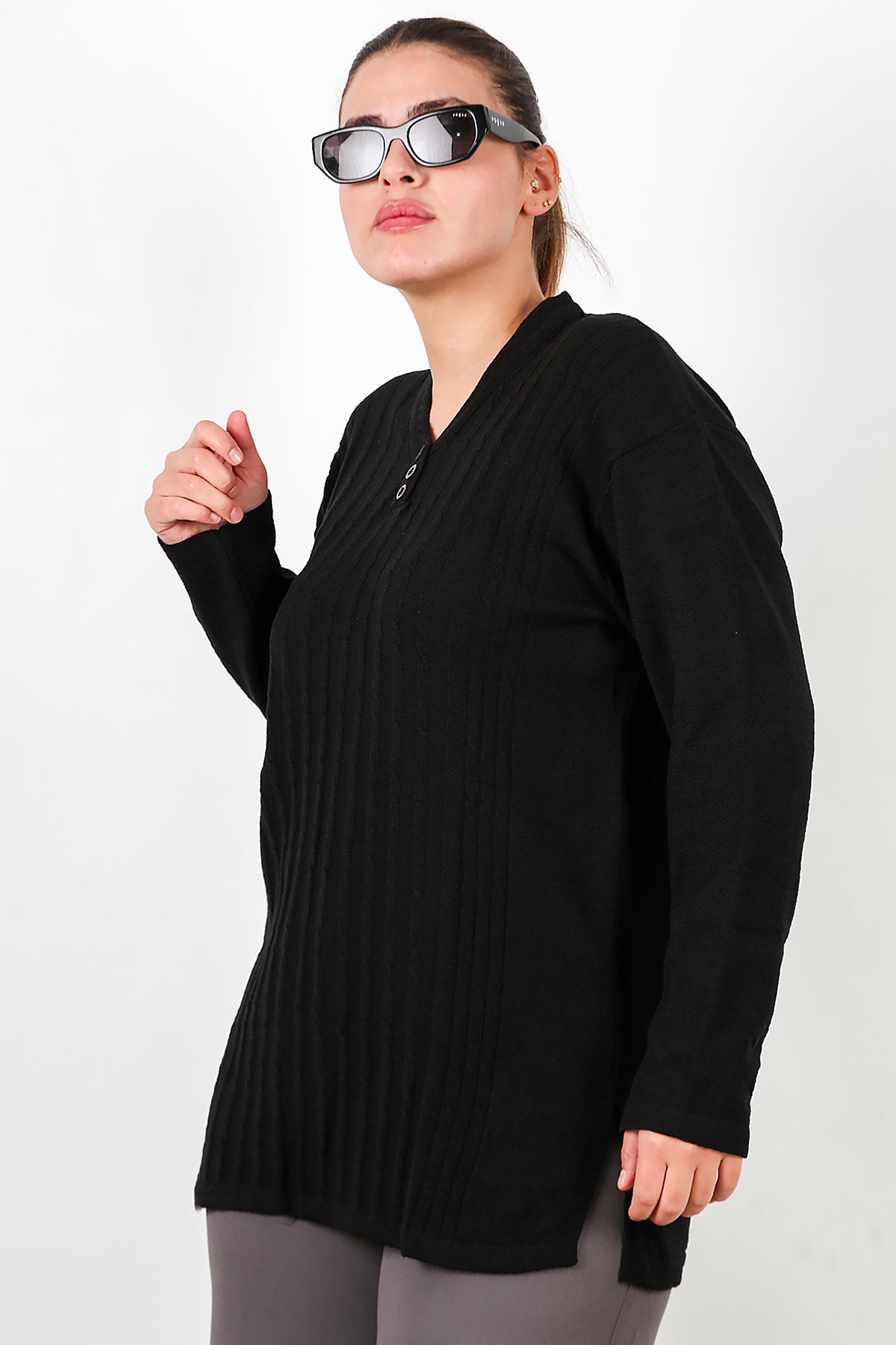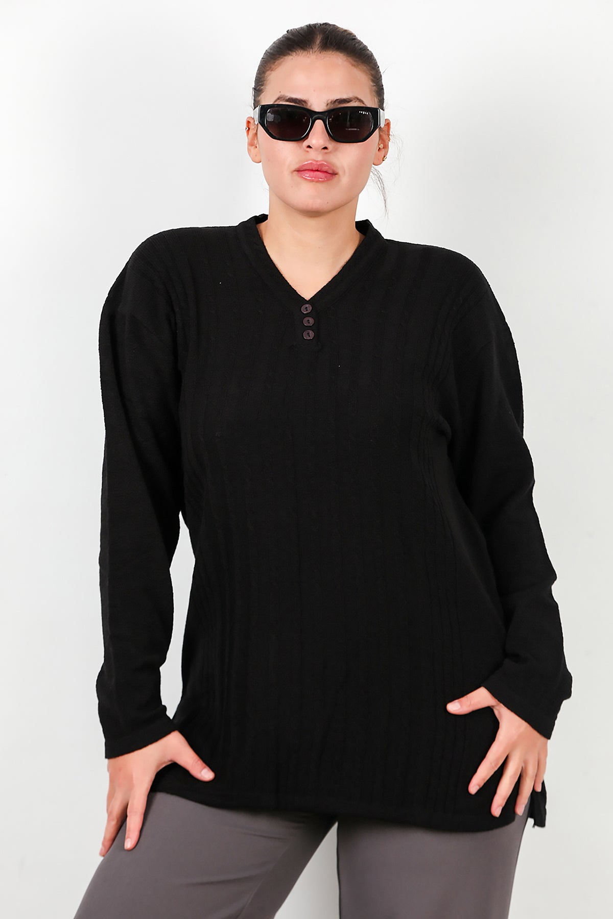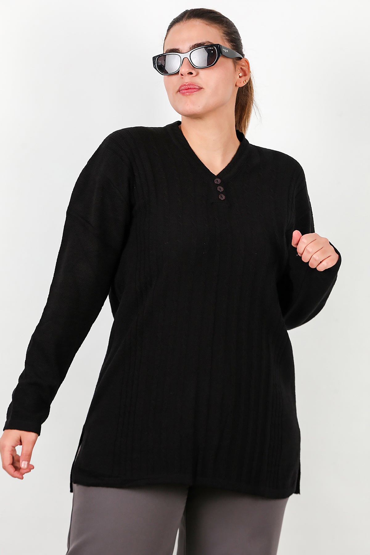 Büyük Beden V Yaka Üç Düğmeli Triko Bluz Siyah