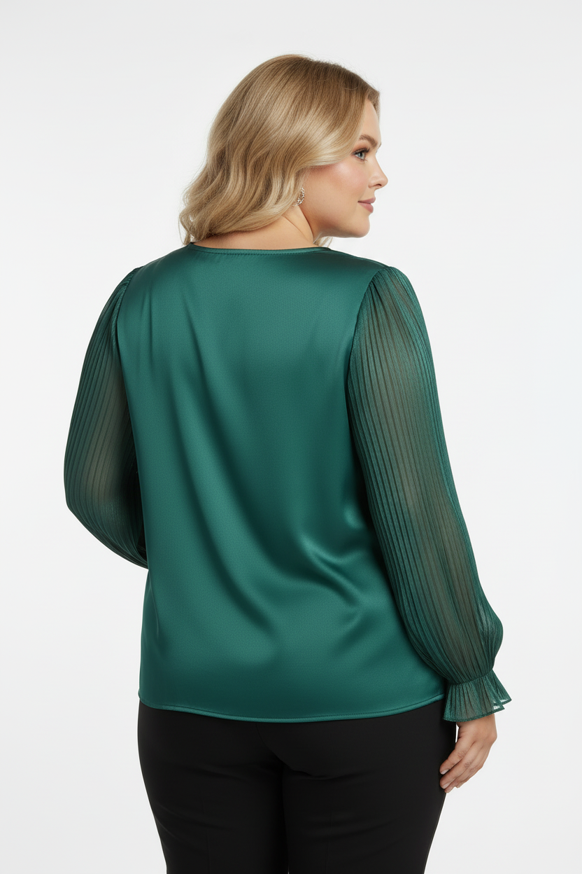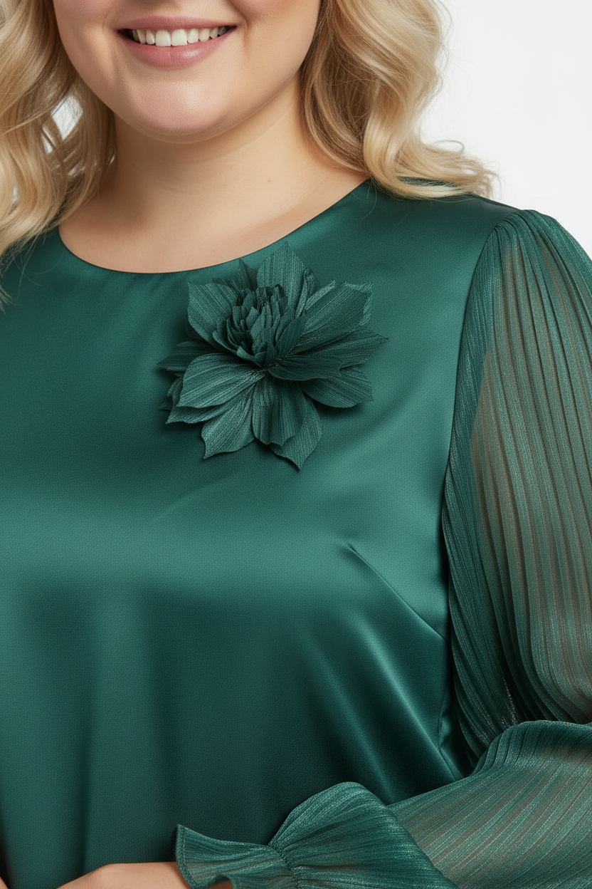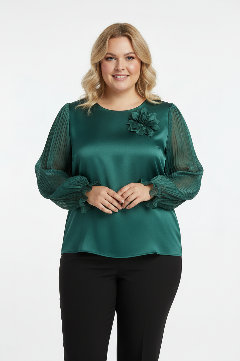 Göz alıcı zümrüt yeşili rengi ve zarif detaylarıyla öne çıkan büyük beden bluz, omuz kısmındaki büyük çiçek detayı ve pileli uzun kollarıyla sofistike bir görünüm sunar. Premium saten kumaşı ve rahat kesimi ile hem şık hem konforlu.